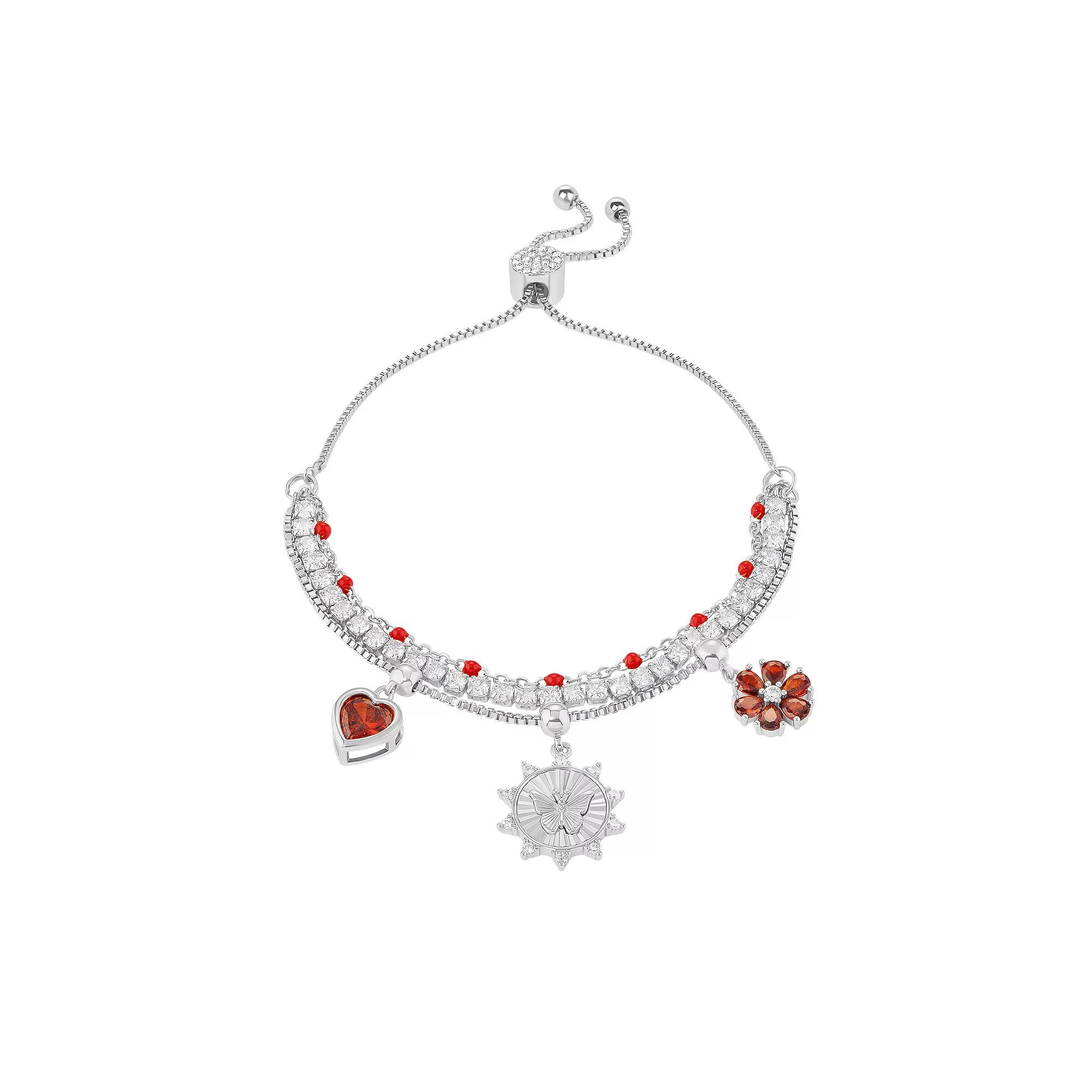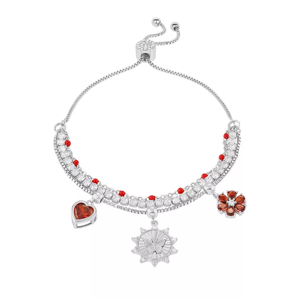 Accessorize in style with this Brilliance fine silver plated red cubic zirconia heart, flower & butterfly charms triple layer bracelet. Click on this JEWELRY & WATCHES GUIDE to learn about fit, styles, materials and more! Accessorize in style with this Brilliance fine silver plated red cubic zirconia heart, flower & butterfly charms triple layer bracelet. Click on this JEWELRY & WATCHES GUIDE to learn about fit, styles, materials and more! FEATURES Charm size: 9 mm x 8.5 mm, 15 mm x 15 mm, 10 mm x 10 mm Length: 10 in. Clasp: adjustable Nickel free Metal: brass Plating: silver tone Finish: enameled, polished, textured Packaging: boxed Crystal accentsSTONE DETAILS Stone type: cubic zirconia Total weight: 4 3/4 ct. Shape: heart, pear, round Setting: bezel, pave, prong Gemstones may have been treated to enhance their appearance. Special care may be required. Please visit our Gemstone Treatment & Special Care Guide for more information. Size: 4-10" ADJ. Color: Silver Tone Red. Gender: female. Age Group: adult.