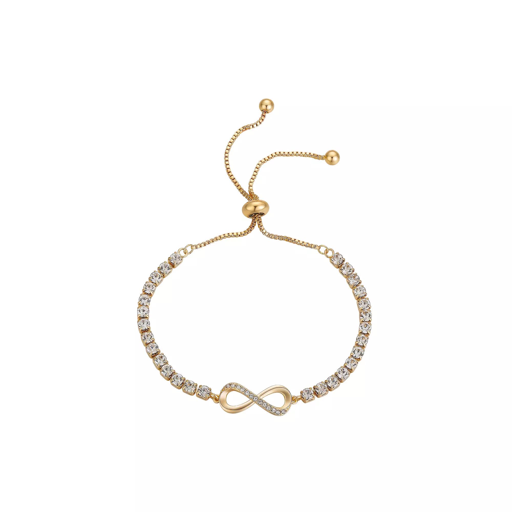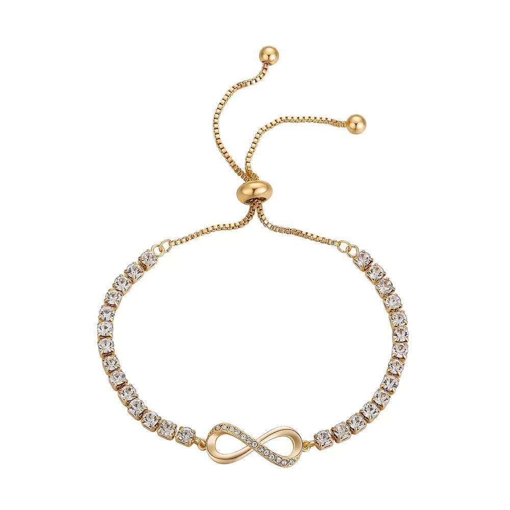 Decorated with shimmering crystals, this Brilliance adjustable infinity bracelet offers limitless style. Decorated with shimmering crystals, this Brilliance adjustable infinity bracelet offers limitless style. Nickel free Metal: brass Crystal accents Length: 9 in. Packaging: boxed Plating: gold tone Finish: polished Size: 8.5. Color: Multicolor. Gender: female. Age Group: adult.