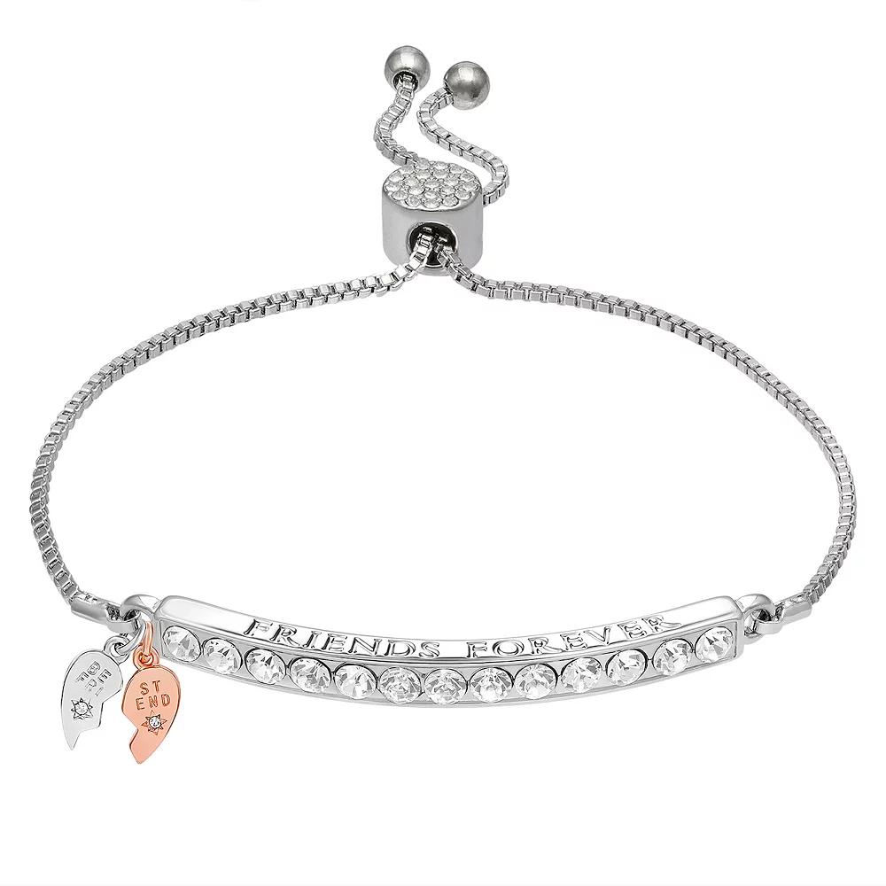 Keep your friends in mind no matter how far away they are with the sparkle and shine of this Brilliance bracelet. Packaging: boxed Nickel free Metal: brass Length: 10 in. Plating: rhodium Finish: polished Clasp: adjustable Chain type: box Size: 7/8". Color: Pink. Gender: female. Age Group: adult.