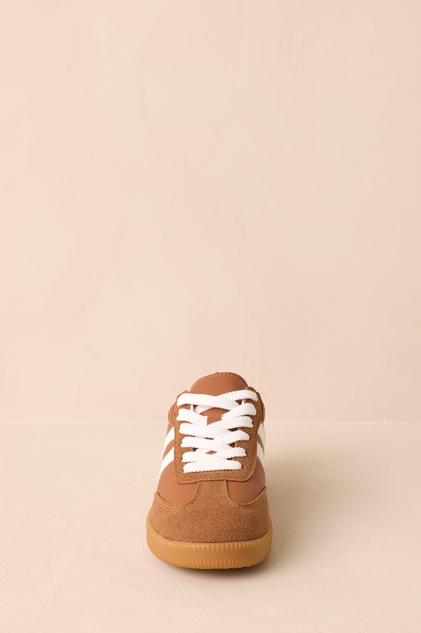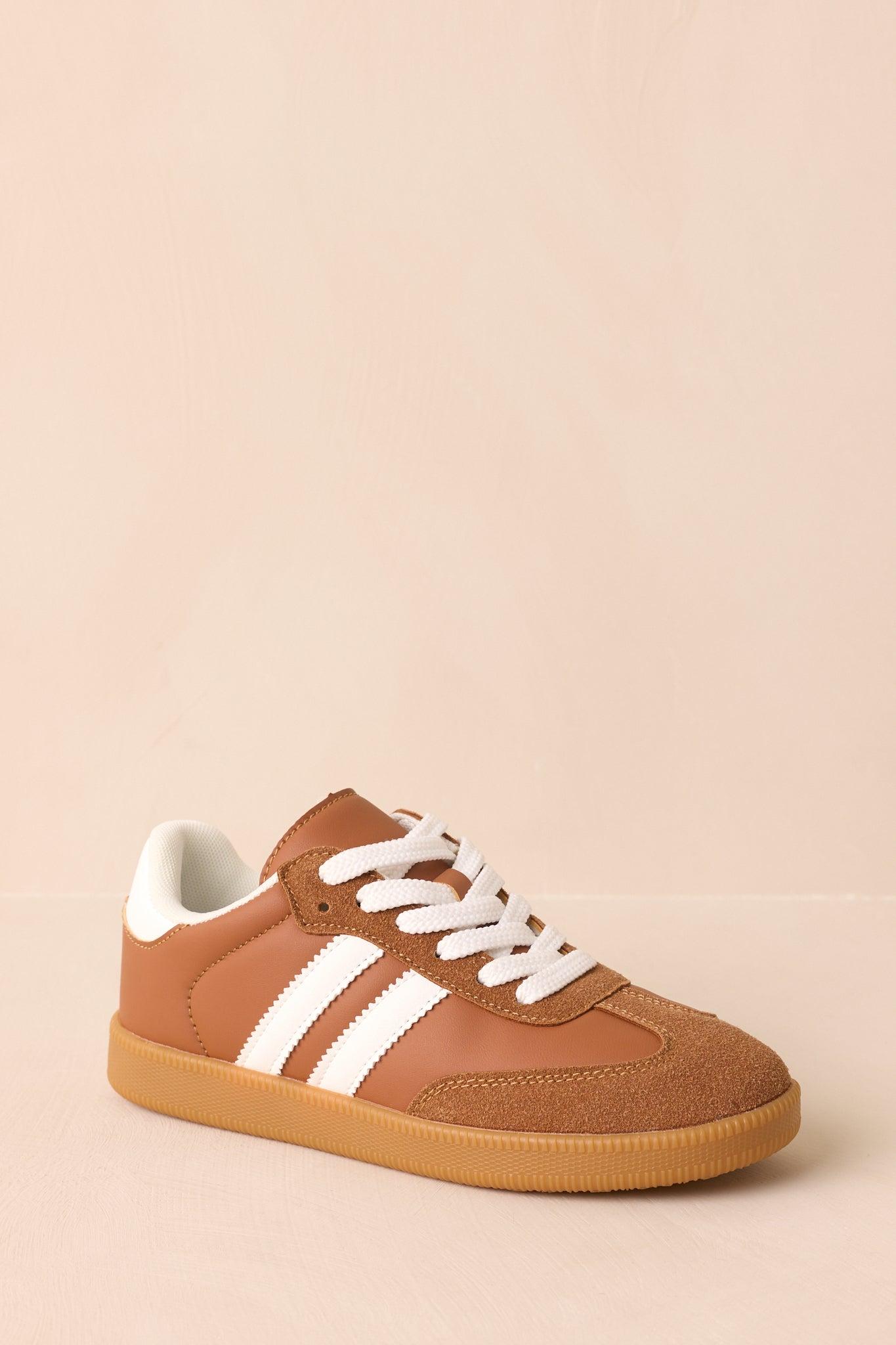 The Bring The Good Vibes Caramel Brown Faux Leather Lace-Up Sneakers keep things light and lively, ready to carry you through the day with energy that’s as fun as it is stylish. These low-top lace-up sneakers feature a caramel brown faux leather and faux suede upper with contrast white side stripes, padded collar, rounded toe, and a gum rubber outsole. Sole measures 1" All Man Made Materials Non-skid sole Manufactured in China Designed in the USA True to Size
