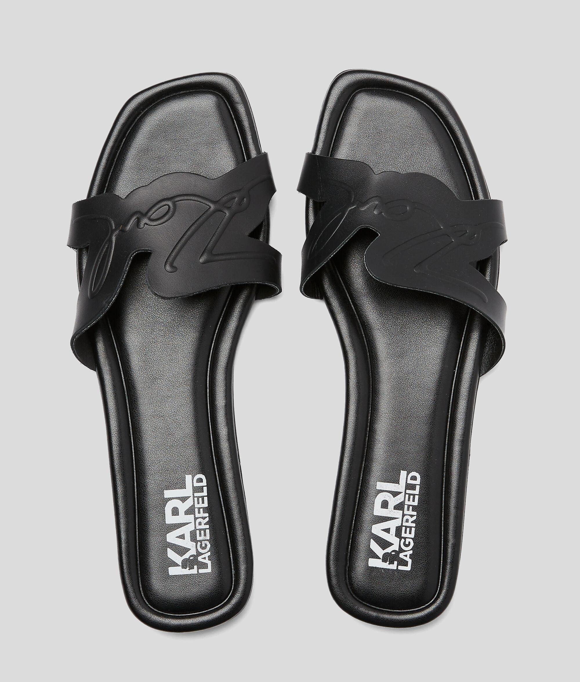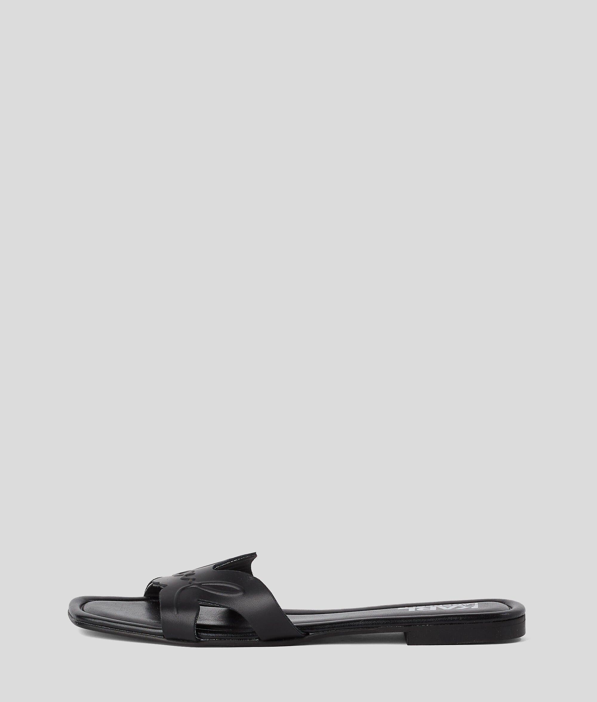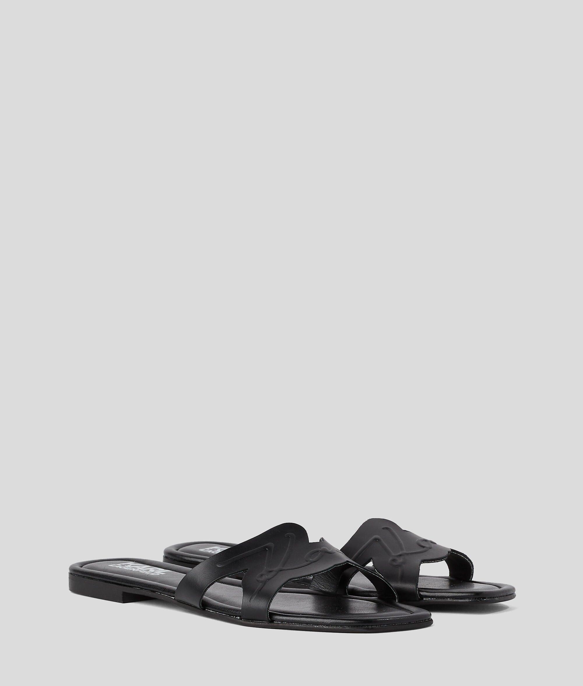 Featuring a square toe and a comfortable padded leather footbed, these ever-versatile sandals are finished with an elegant KARL Signature embellishment.