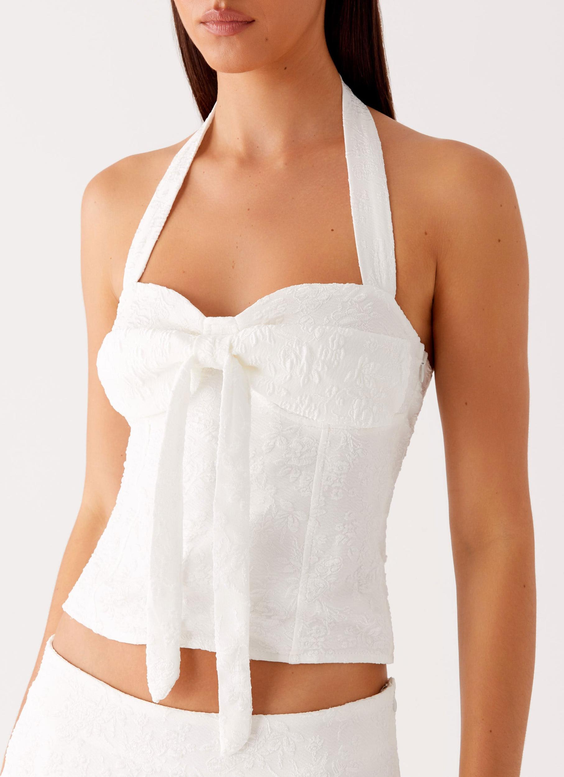 Peppermayo ExclusiveThe Brissy Halterneck Top is a perfect blend of bold and feminine. Featuring a flattering sweetheart neckline and a front tie that cinches for a fitted look, it's made to turn heads.- Sweetheart Neckline - Front Tie - Thick Neck Strap - Back Neck Button - Textured Fabric - Side Hook and Eye, Invisible Zipper - Fully Lined - Low Back - 100% Viscose Size AU 8 / US 4 garment measurements:Bust: 64cm/25.2inHem: 81cm/31.9inHip: 72cm/28.3inLength: 85cm/33.5inRoberta is 177cm and wearing a size AU 6 / and US 2