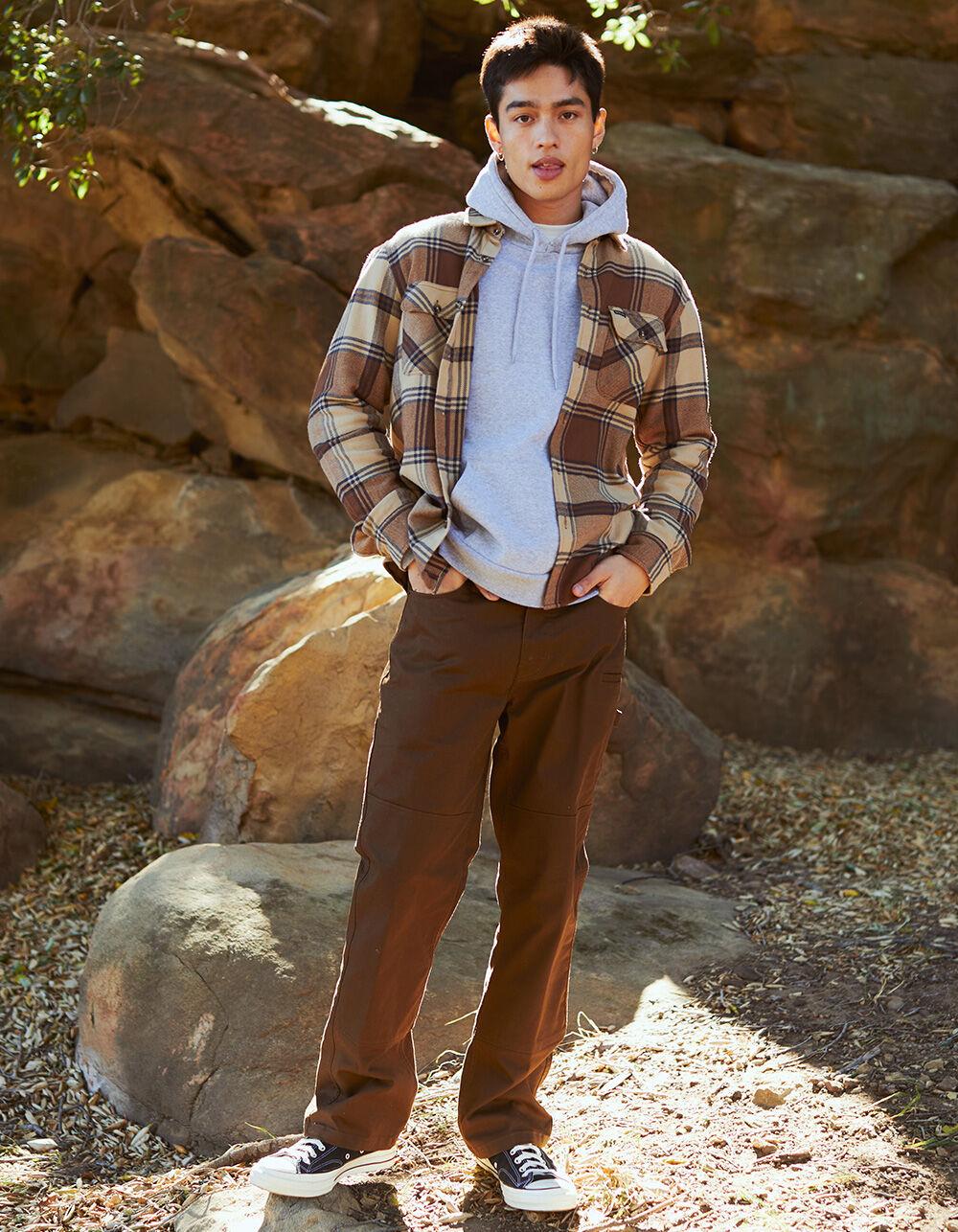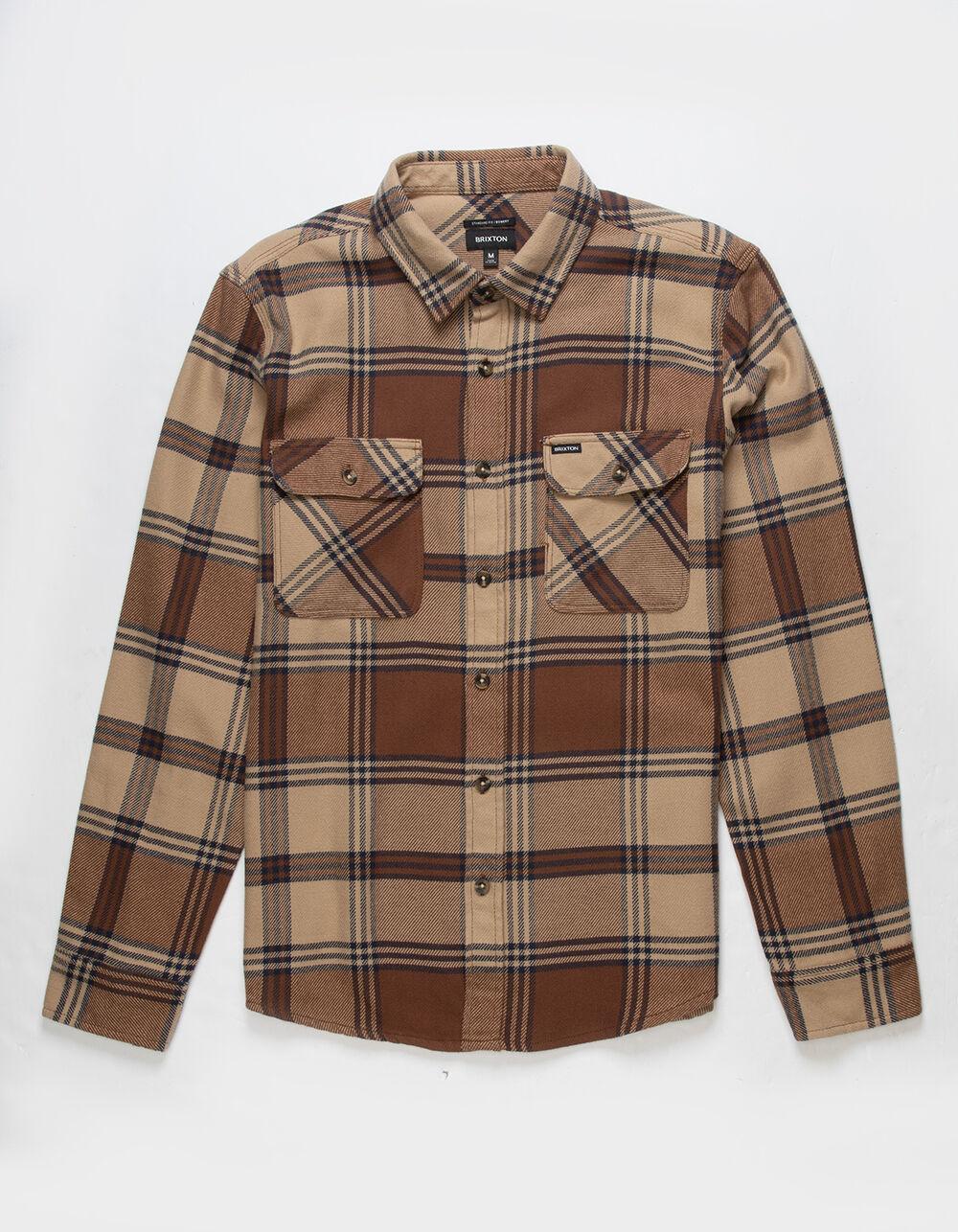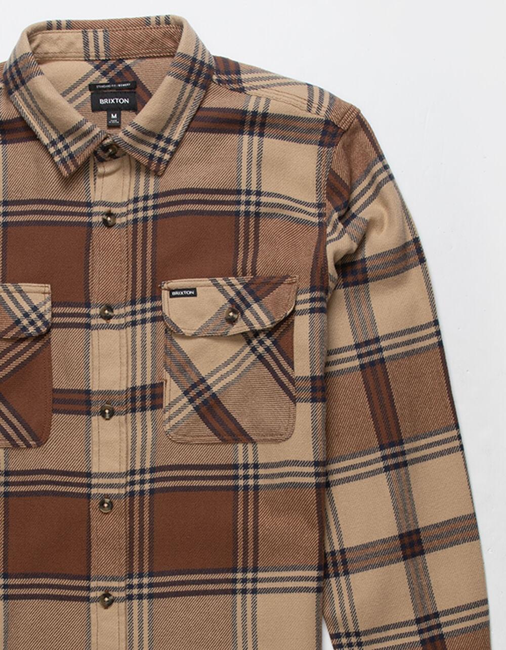Brixton Bowery Flannel. This classic, two-pocket flannel looks and feels like a favorite shirt from day one. Designed with signature vintage-inspired plaids and a proprietary, anti-scratch vegan wool tri-blend. Ideal for layering over a tee for added warmth or wearing on its own for dinner dates. Clean finished seams for a polished look. Chest pocket with woven label. Softener wash. Standard fit with a curved hem. 60% cotton 23% polyester, 17% Acrylic. Machine wash. Imported.