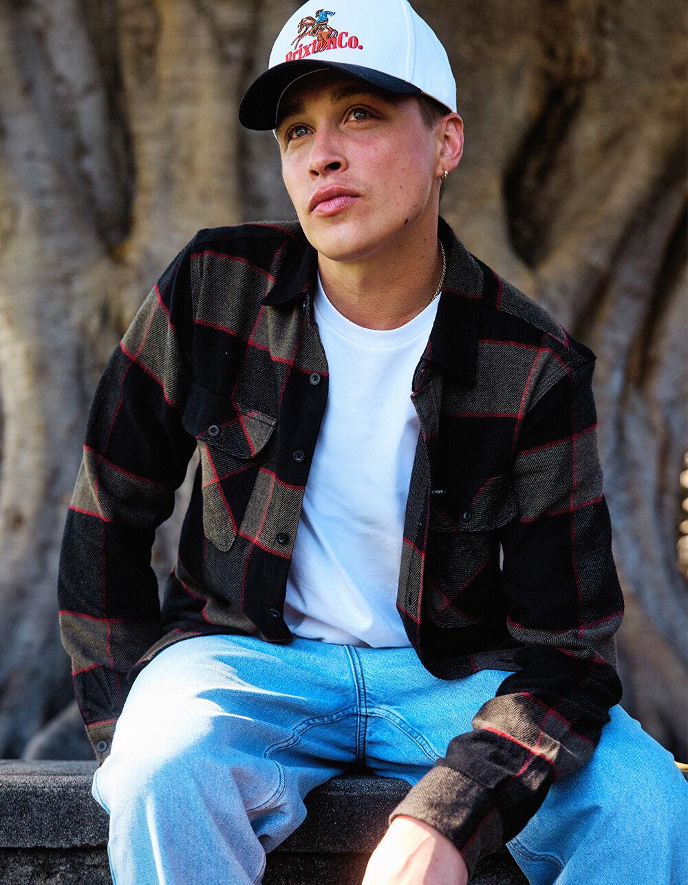 Brixton Bowery Flannel. This classic, two-pocket flannel looks and feels like a favorite shirt from day one. Designed with signature vintage-inspired plaids and a proprietary, anti-scratch vegan wool tri-blend. Ideal for layering over a tee for added warmth or wearing on its own for dinner dates. Clean finished seams for a polished look. Chest pocket with woven label. Softener wash. Standard fit with a curved hem. 60% cotton 23% polyester, 17% Acrylic. Machine wash. Imported.