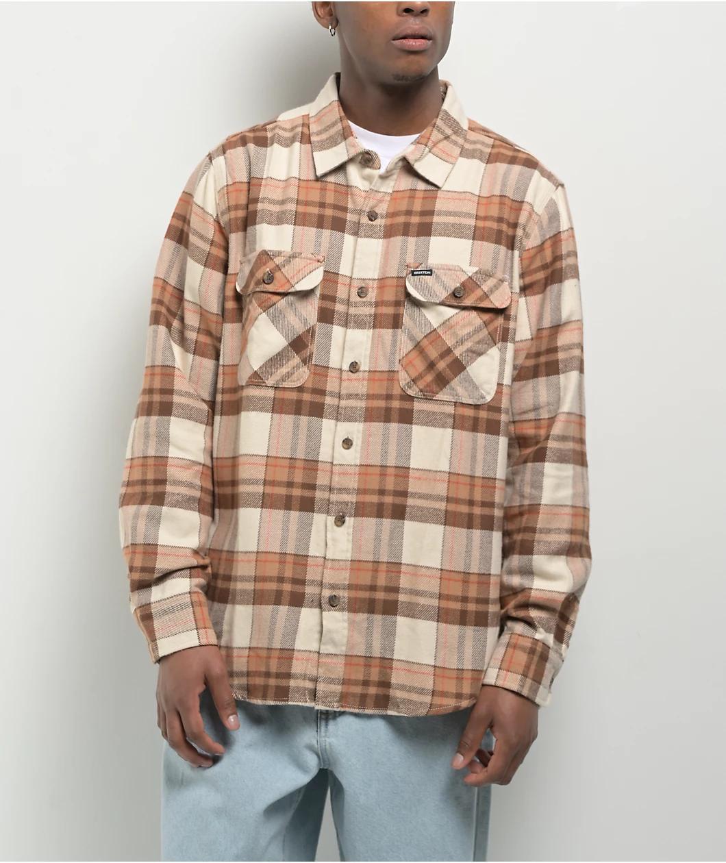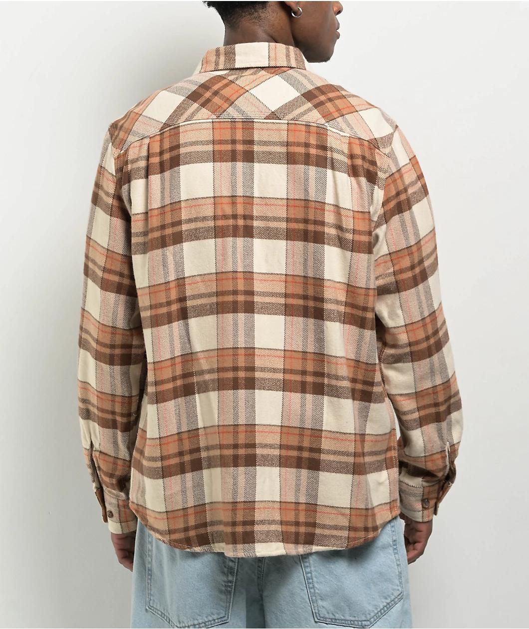 Brixton presents the perfect lightweight flannel with the Bowery plaid shirt. A "Whitecap" colorway features shades of light brown and rust orange against a white backdrop for a bright yet classic look. A traditional turndown collar, dual button clos