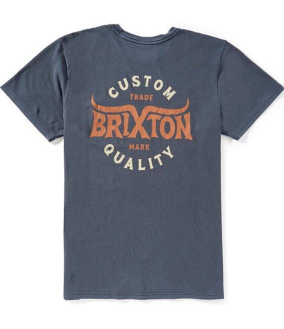 From Brixton, this t-shirt features:Crew necklineShort sleeves"Brixon" logo "Custom Quality" verbiage and other wording on the frontPullover stylingTreatedMachine wash/tumble dryImported.*Due to the nature of the dye, each item is truly unique, and there may be slight variations in color and finishing