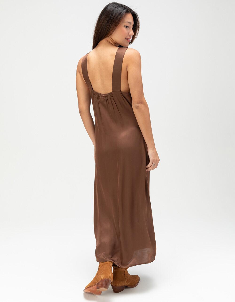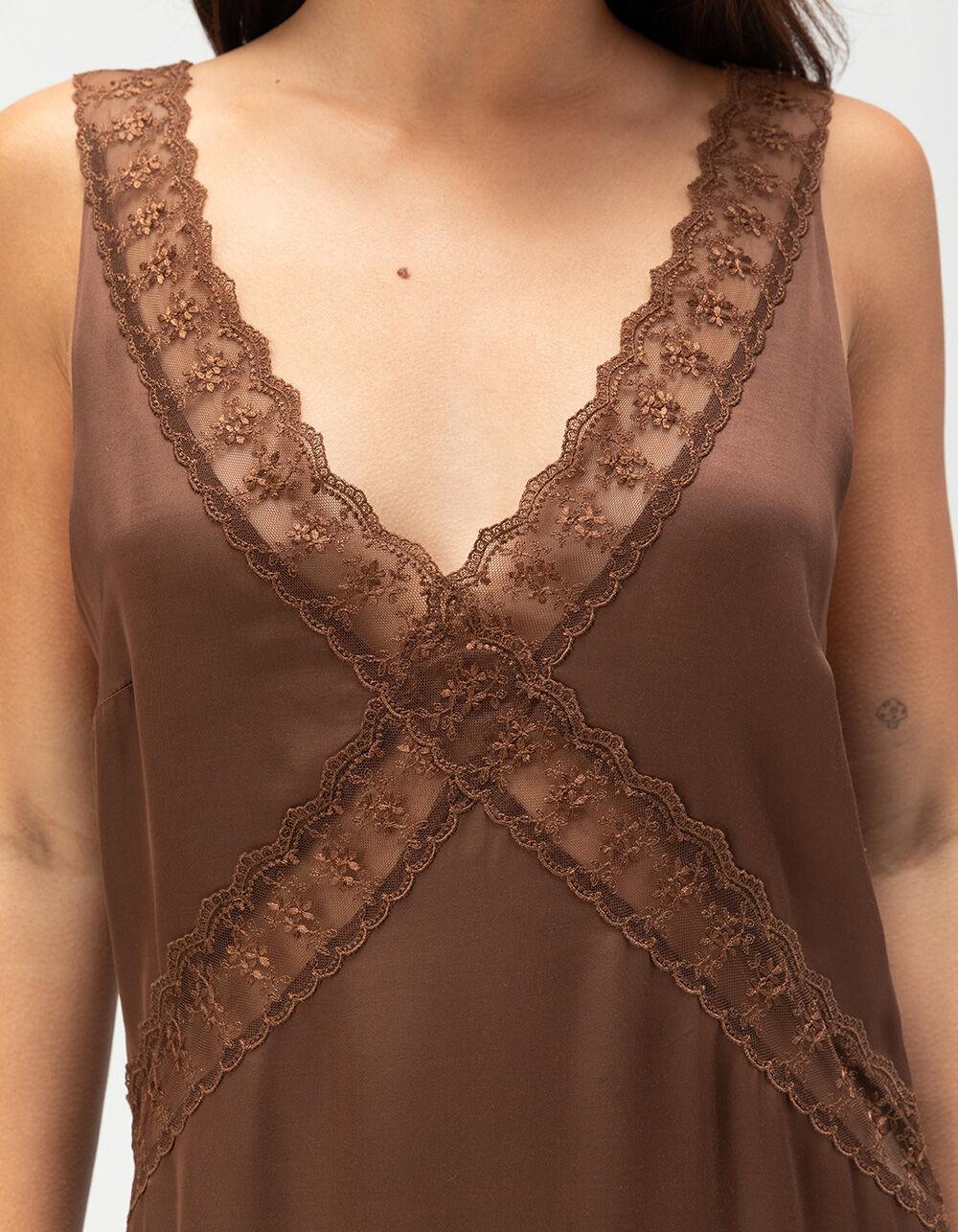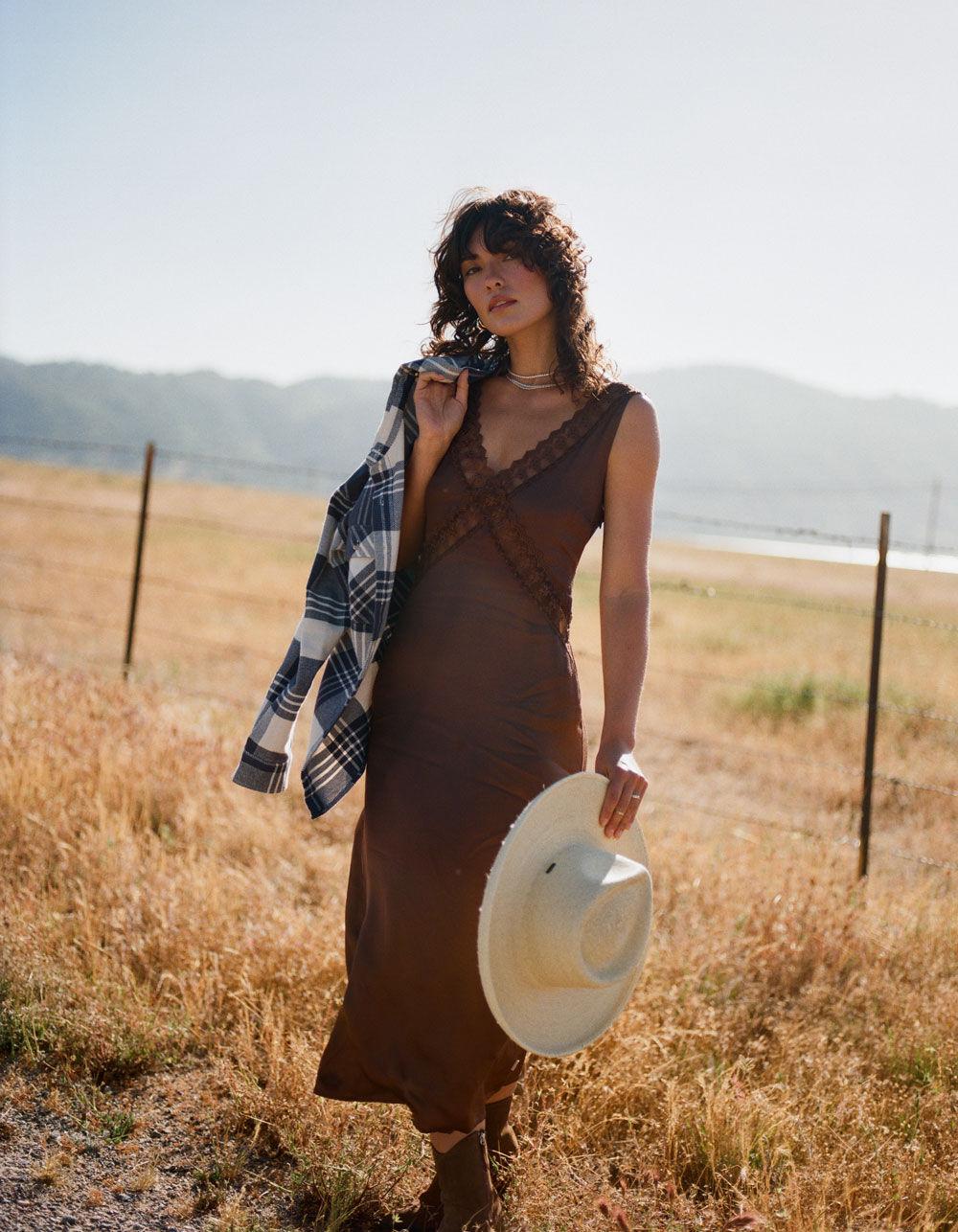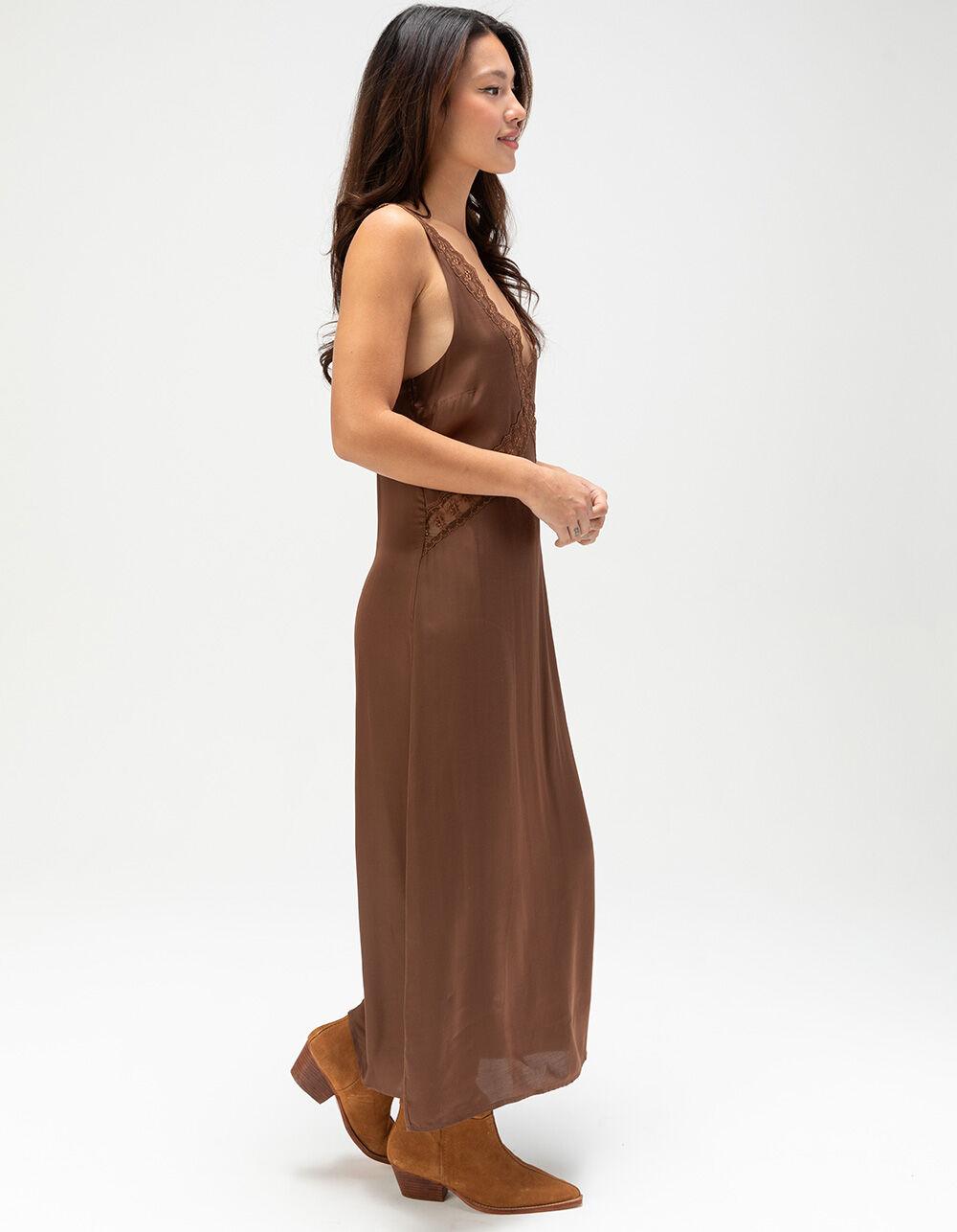 BROWN. Brixton The Ridge Slip Dress. Sleeveless slip dress with a deep V neckline and delicate lace trim details. Side seam flag label. Elastic at back. Side zip closure. Unlined. Approximate length: 51". 52% Viscose 48% Rayon. Trim: 100% Polyester. Machine wash. Imported.