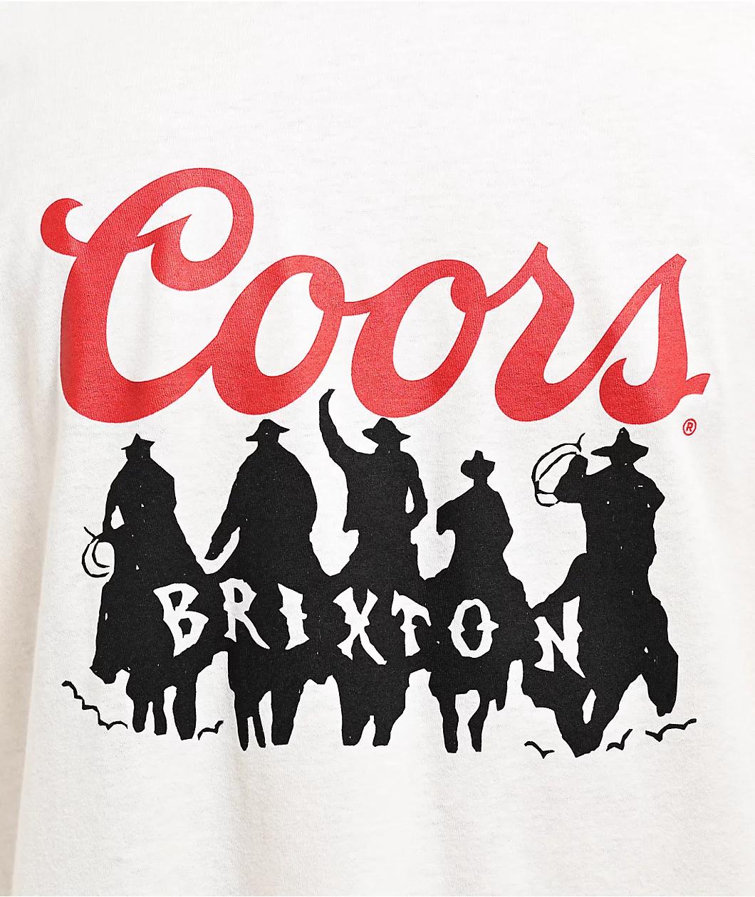 Lifestyle brand Brixton collaborates with renowned Colorado brewing company Coors to welcome the Bandit t-shirt in a natural colorway. The front of the shirt displays red Coors branding with "Brixton" written in a silhouette of cowboys delivering a t