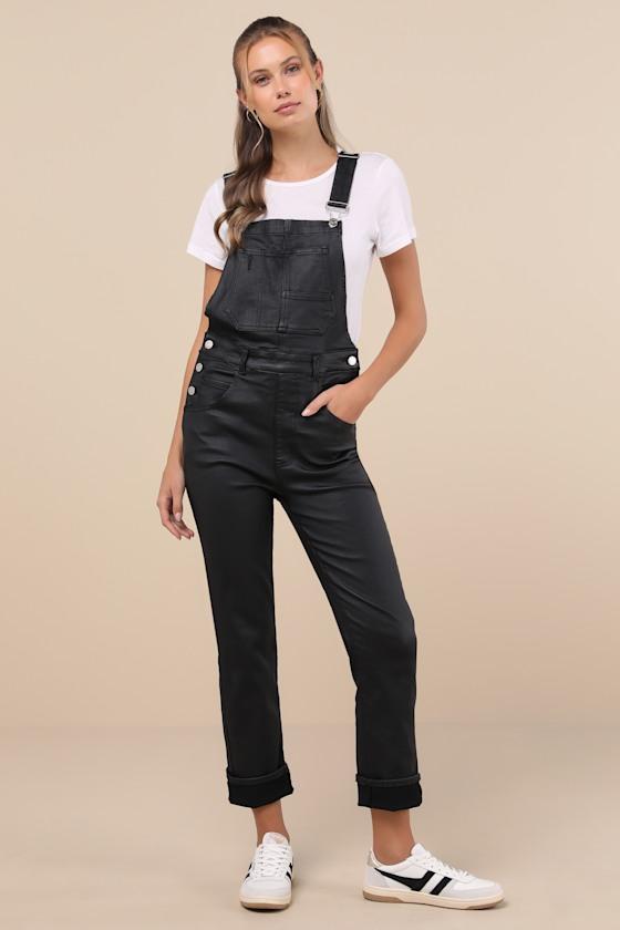 Get ready to have a coveted aesthetic all season long in the DAZE Denim Broadway Black Coated Overalls! Stretchy denim fabric (with a trendy coated effect throughout) shapes these cool overalls that have a front bib with a patch pocket and wide, adjustable straps that continue into a modified racerback design. Belt loops accent the banded waist, atop slim-fitting legs with side buttons, a five-pocket cut, and ankle-length hems. Logo tag at back. Silver hardware throughout.