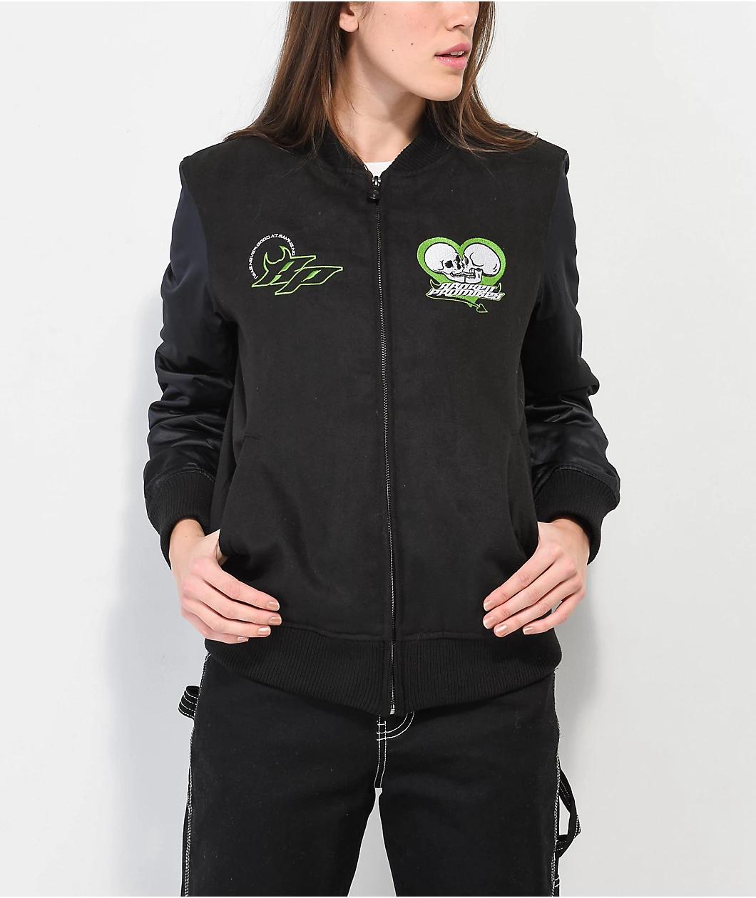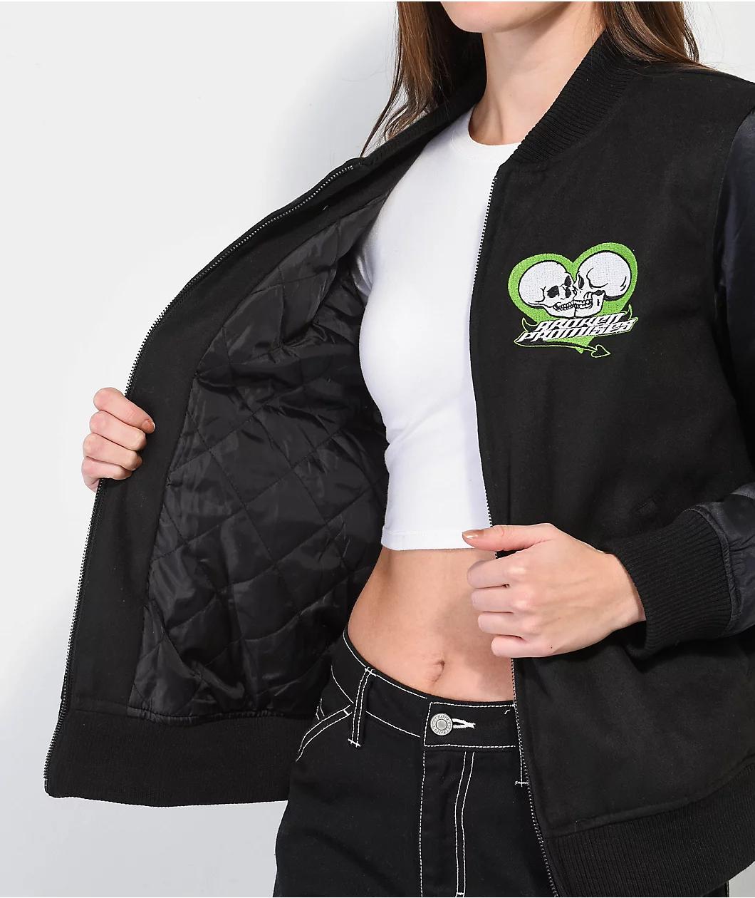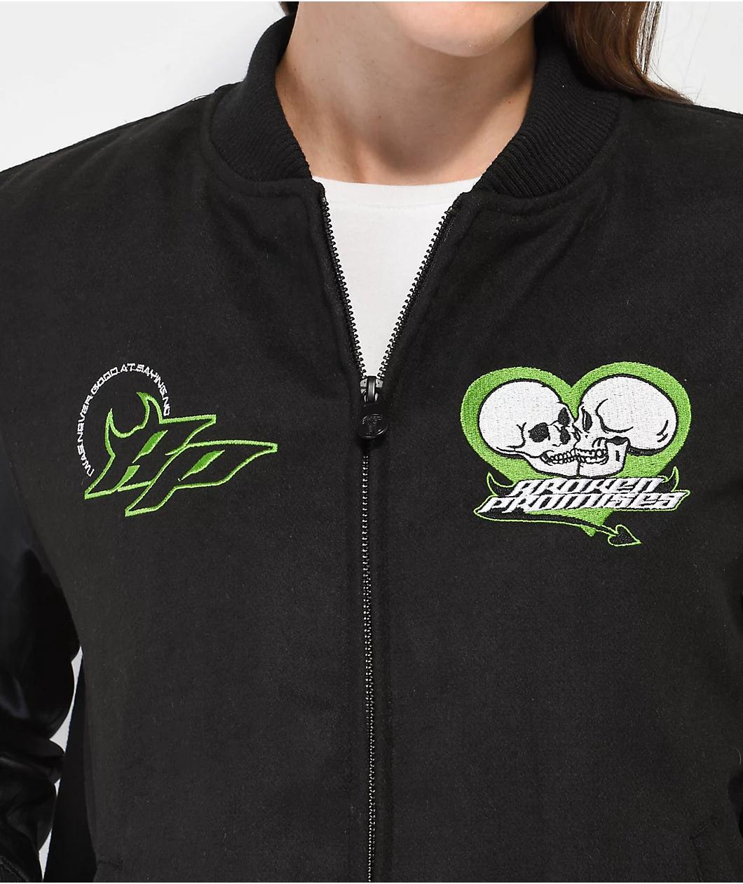 From Broken Promises, the Cybernetic varsity jacket comes in an all black construction, with green imagery of kissing skulls and brand text embroidered on the chest. A quilted interior adds extra warmth, while ribbed accents along the cuffs, collar, and b