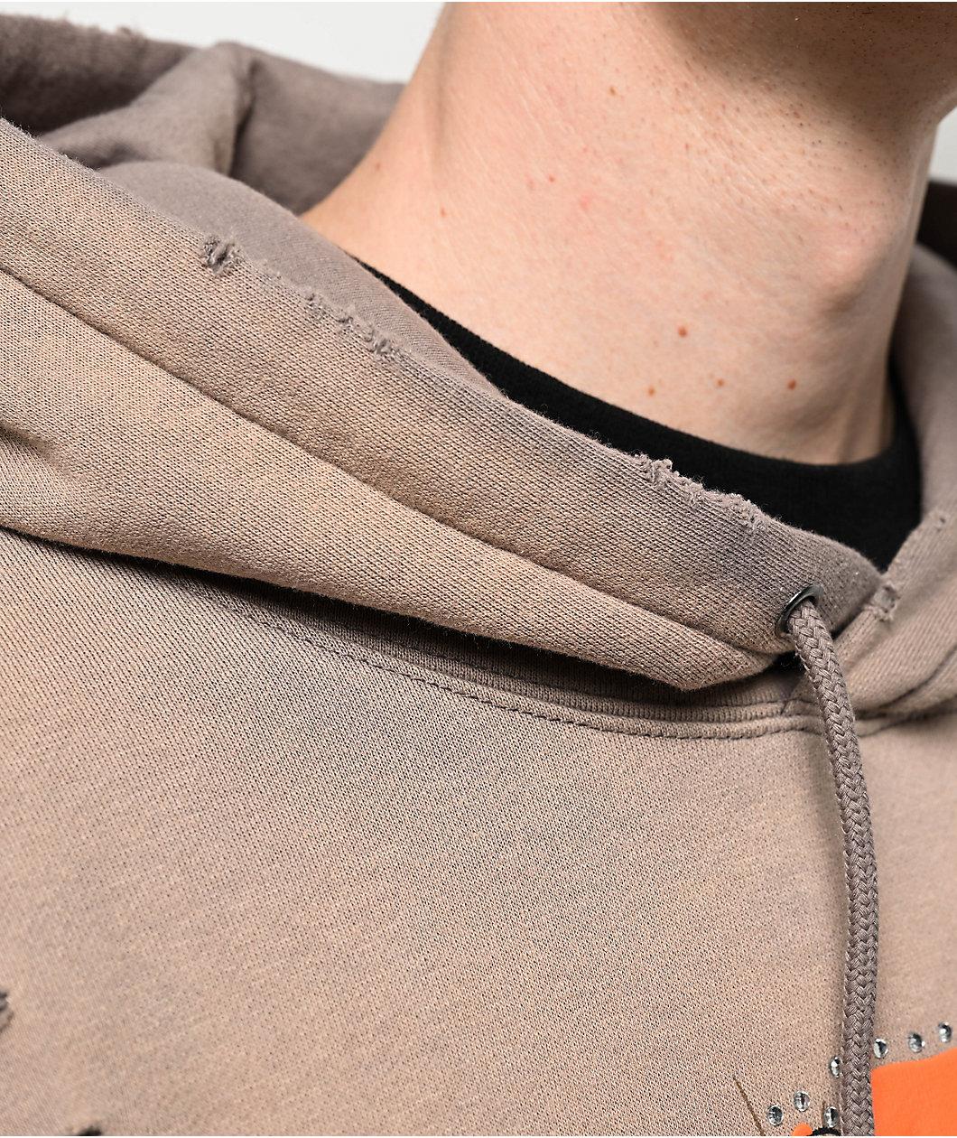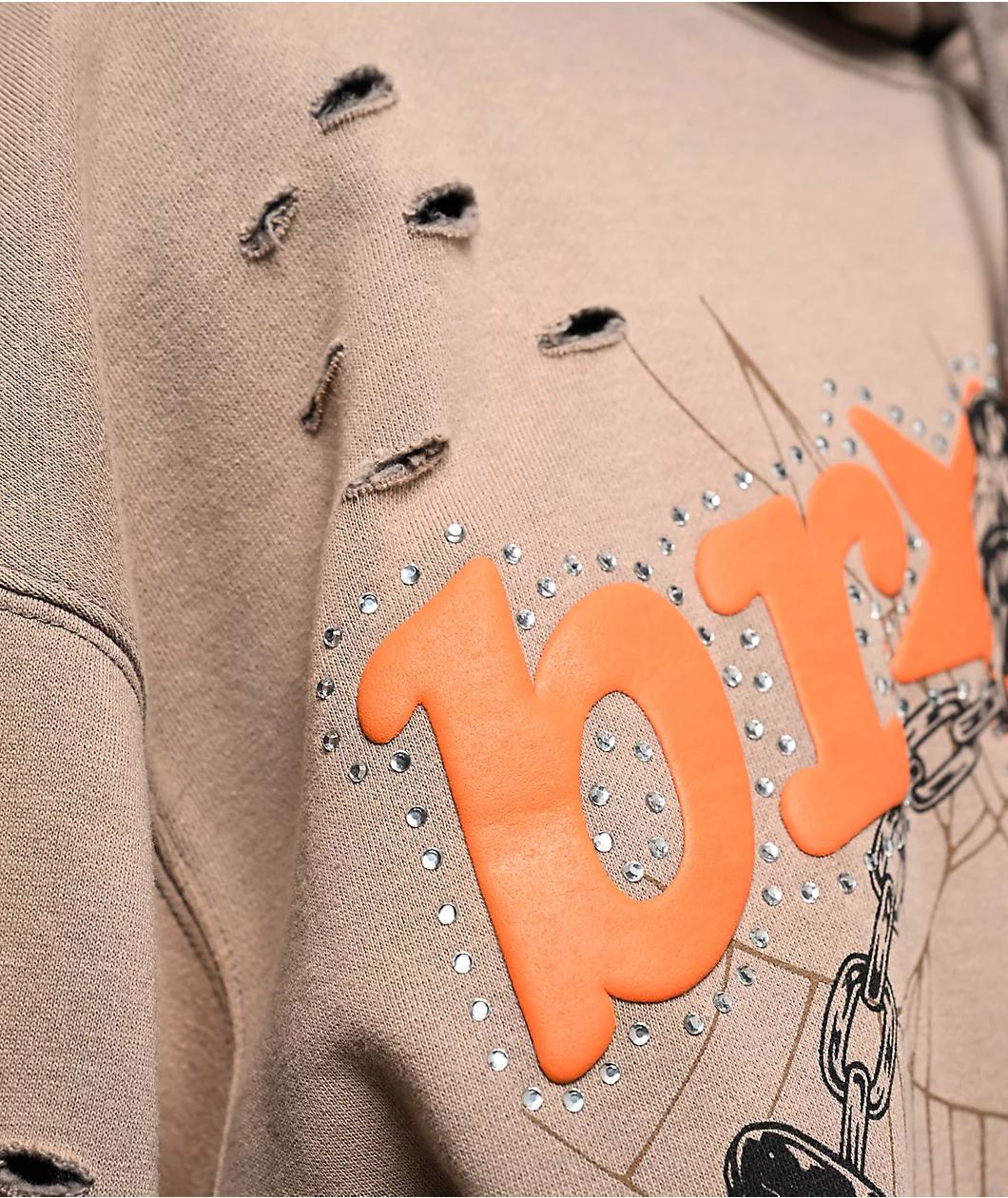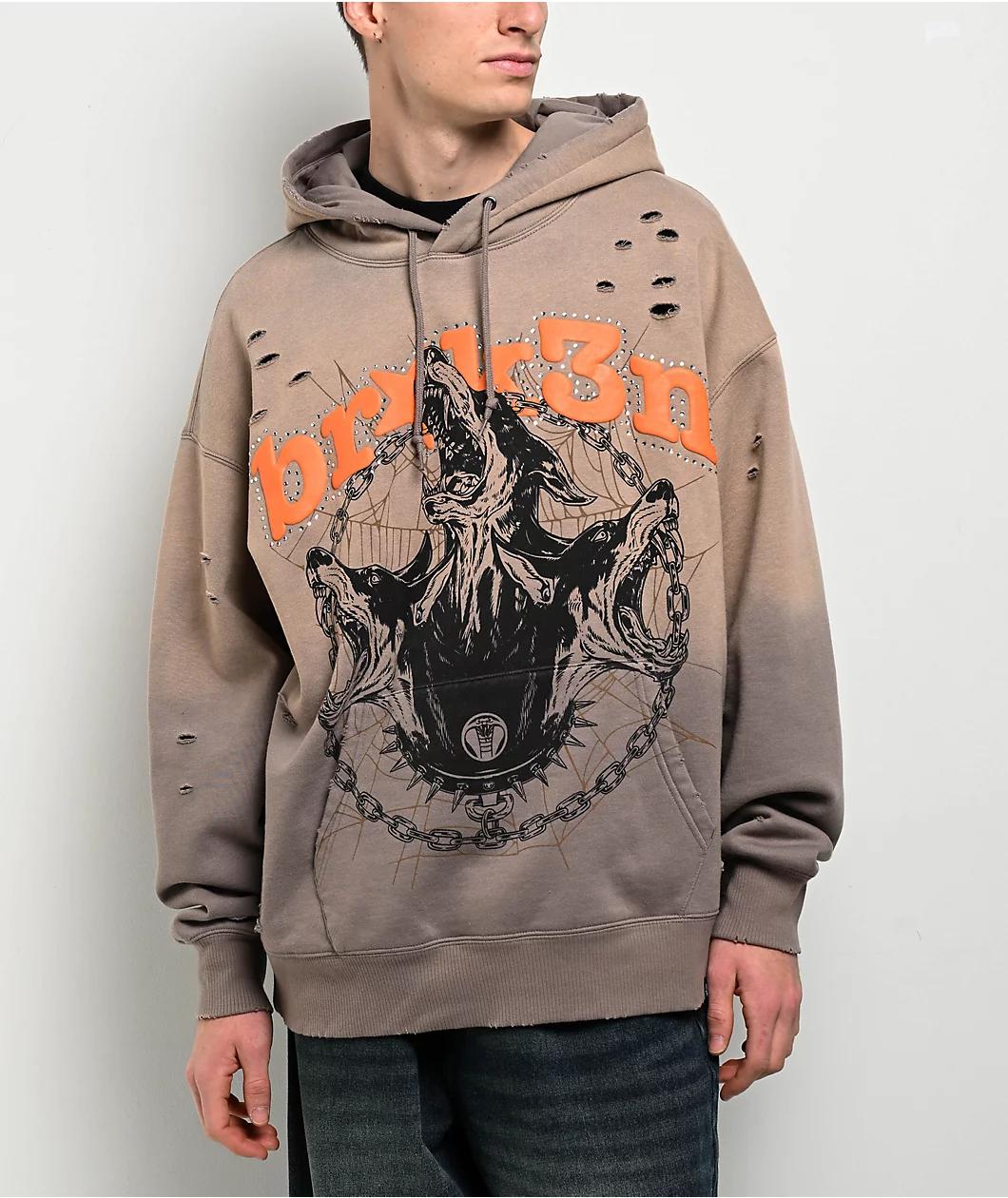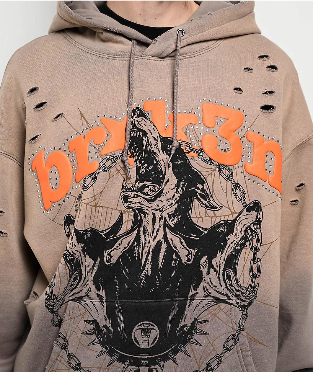 Influenced by thrifted Y2K streetwear, Broken Promises introduces the Moon Howler hoodie in a brown cotton blend with a washed treatment for a worn, faded aesthetic. The long sleeve sweatshirt showcases an intricate design, employing orange puff-prin