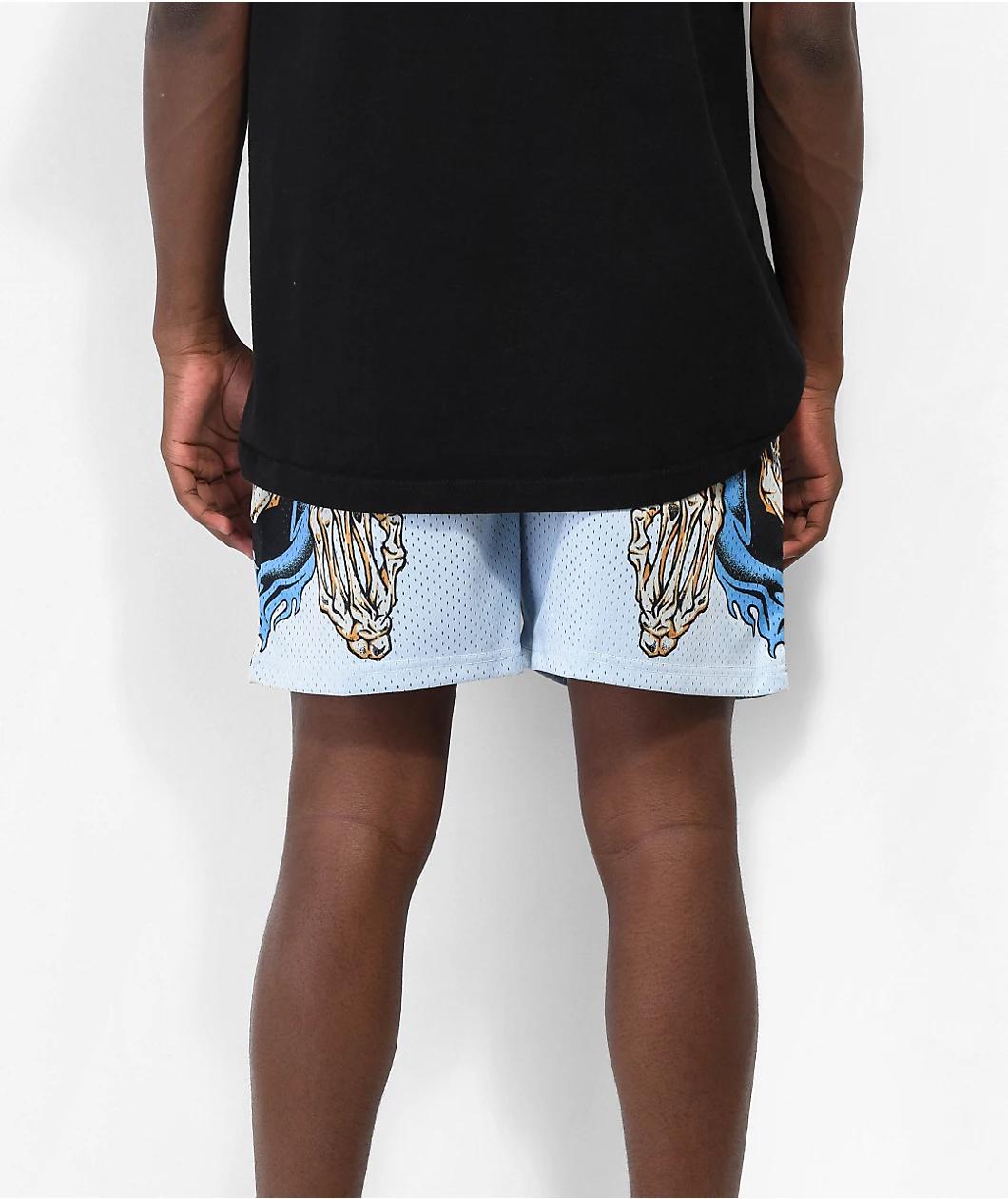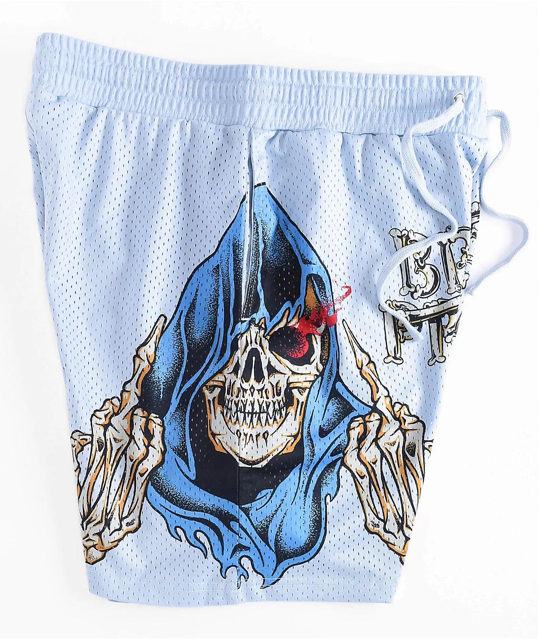 The Scythe mesh shorts from Broken Promises come in a blue colorway with sublimated graphics of a grim reaper figure and bones spelling out the brand name for an edgy look. These comfy shorts provide uninterrupted movement with a drawstring-adjustable wai