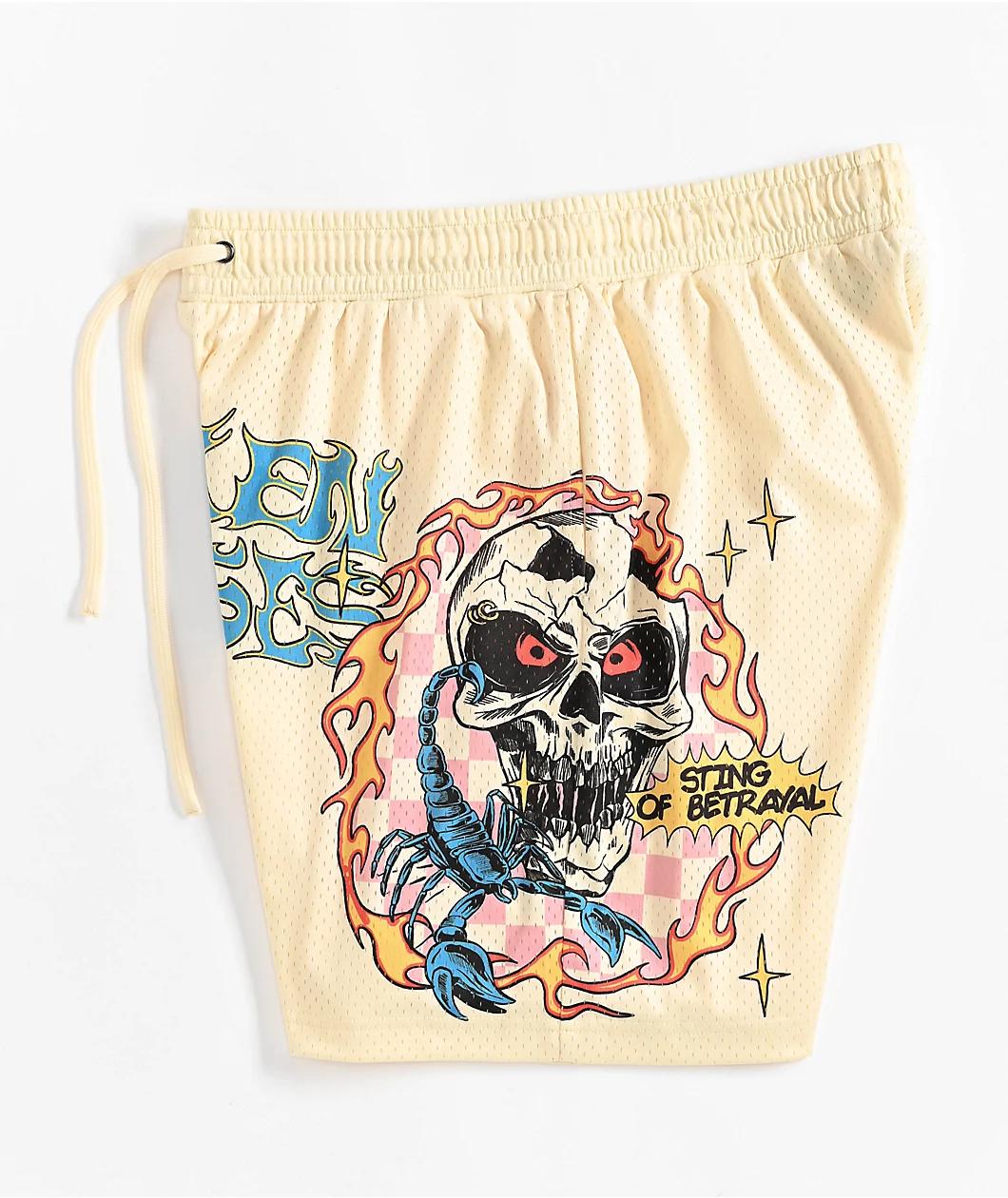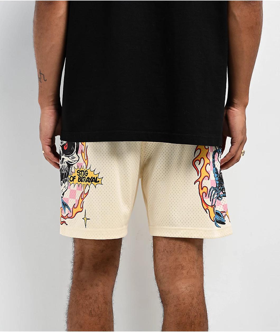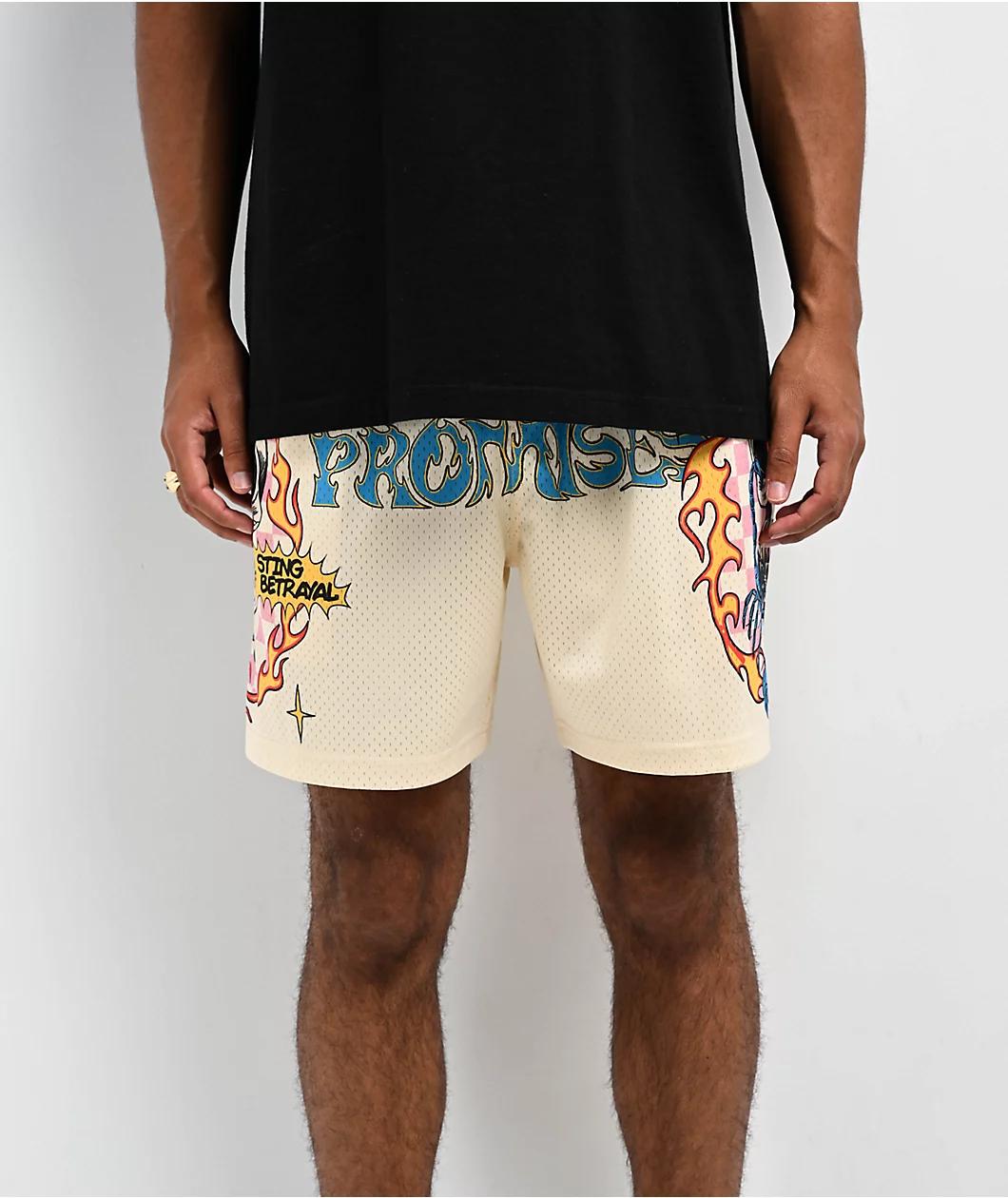 Featuring comic book style graphics on a natural colorway, Broken Promises provides their Sting Of Betrayal athletic mesh shorts in a soft, 100% polyester build with ventilated lining for a secure fit with added comfort. Sporting a multicolored desig