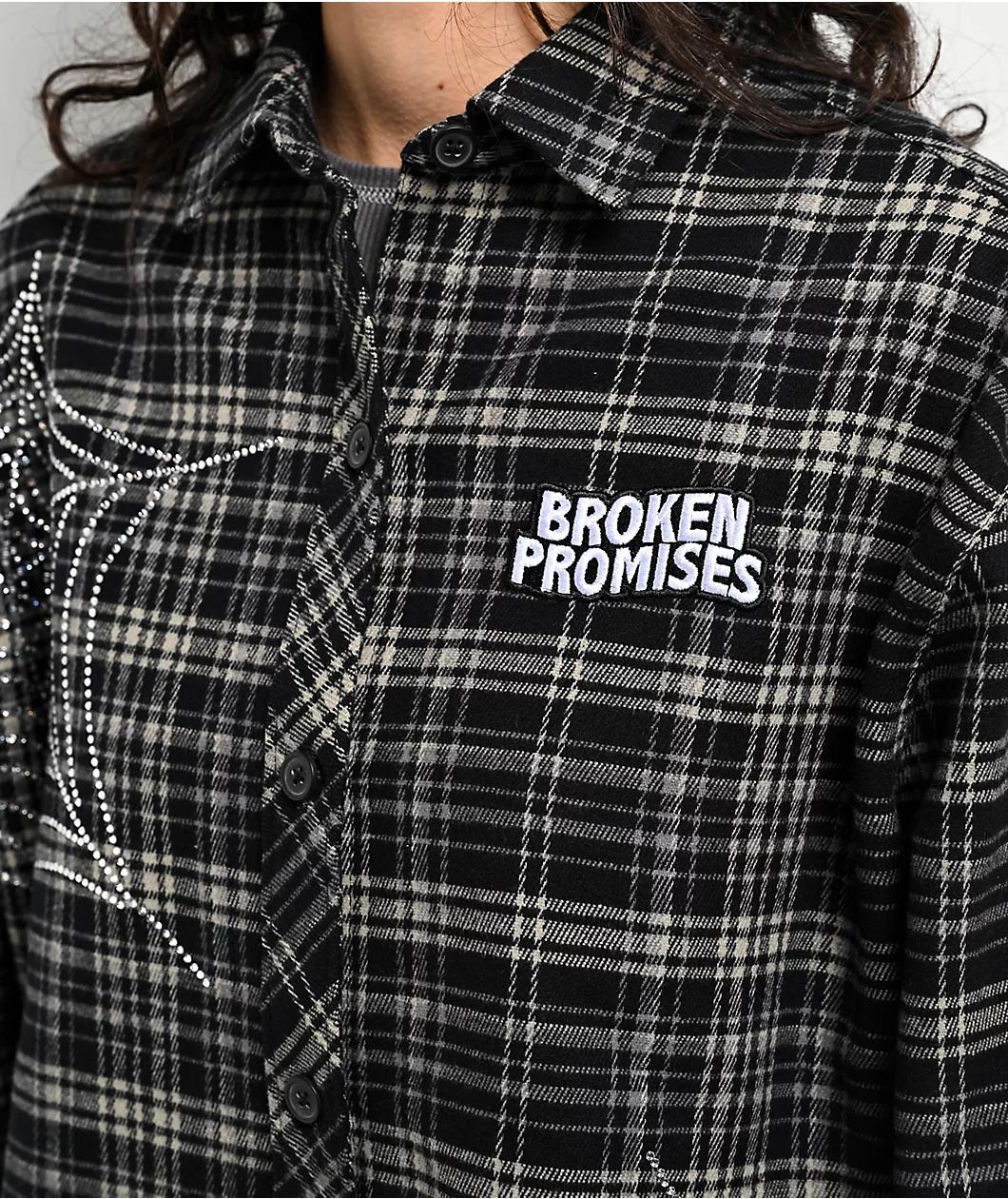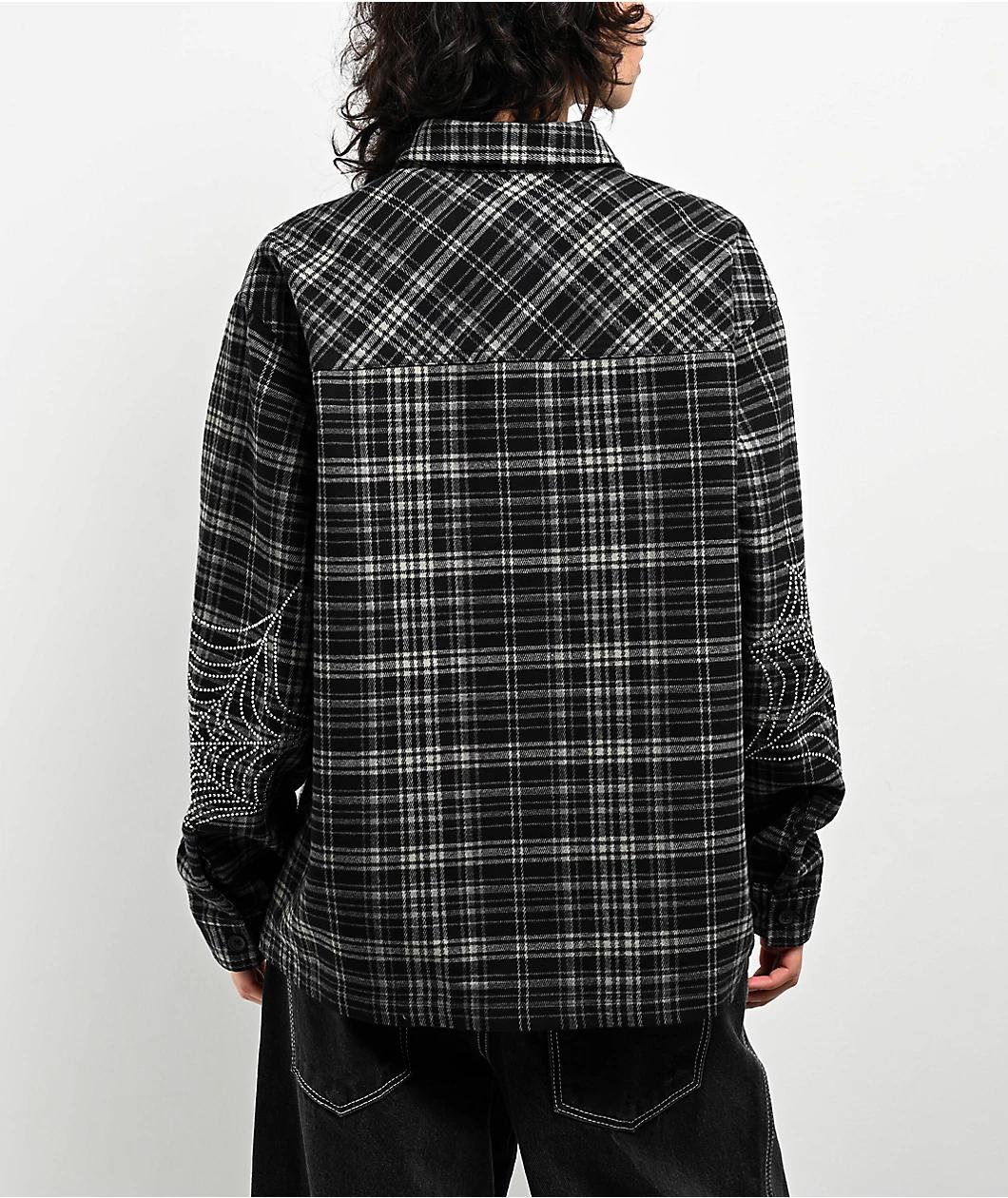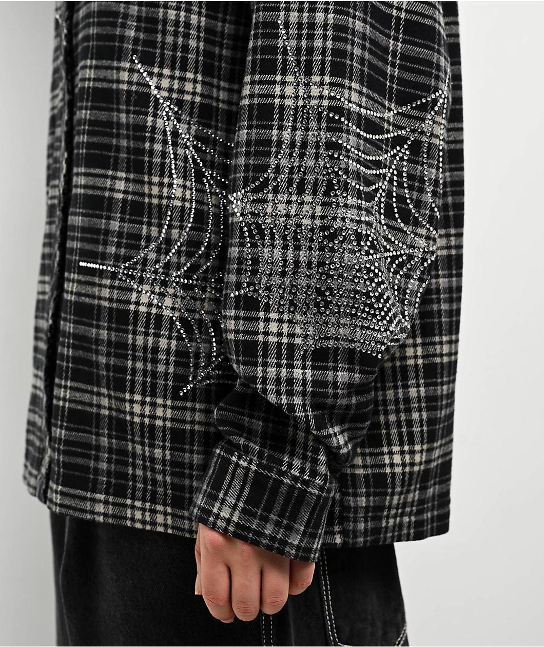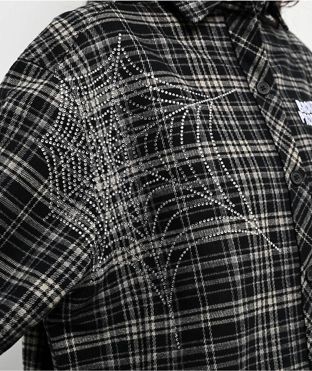 Landing in a plaid motif, Broken Promises welcomes the Stoned Web flannel shirt in a black colorway with grey accents. Embroidered branding is on the left side of the chest with shiny rhinestone spider web graphics on the front and both sleeves deliv