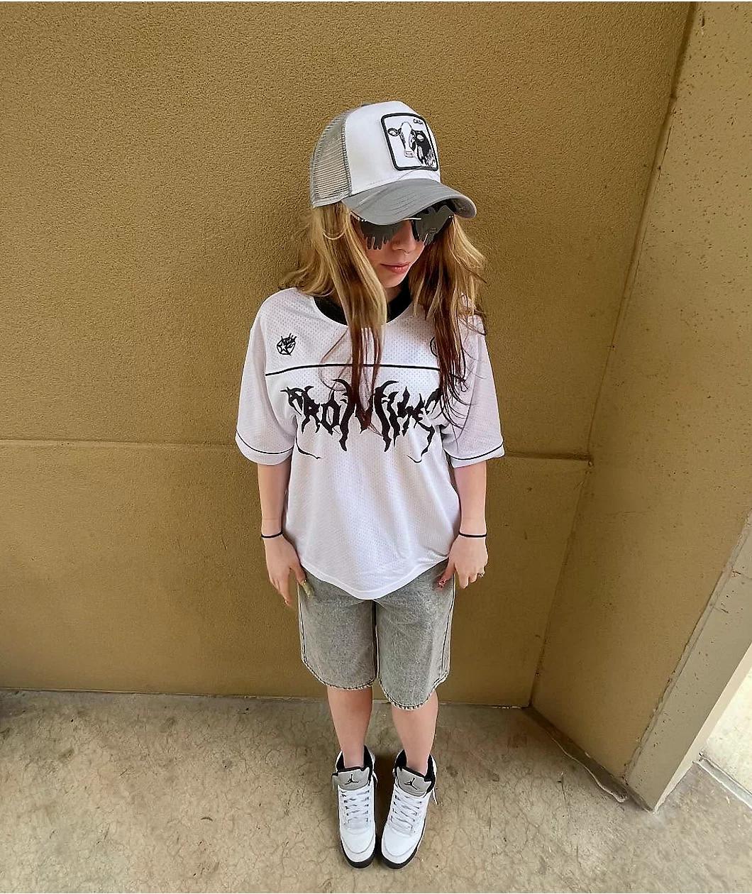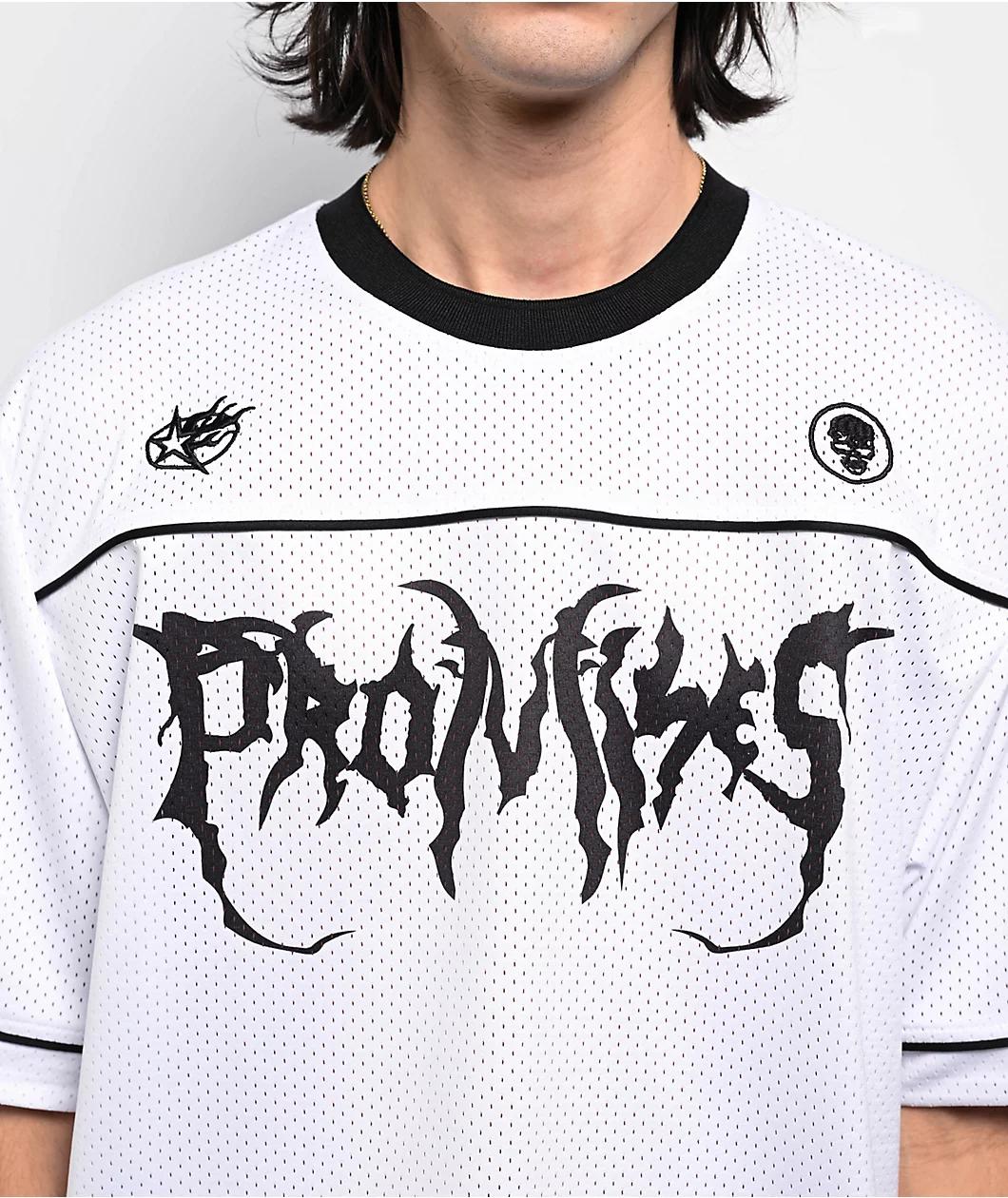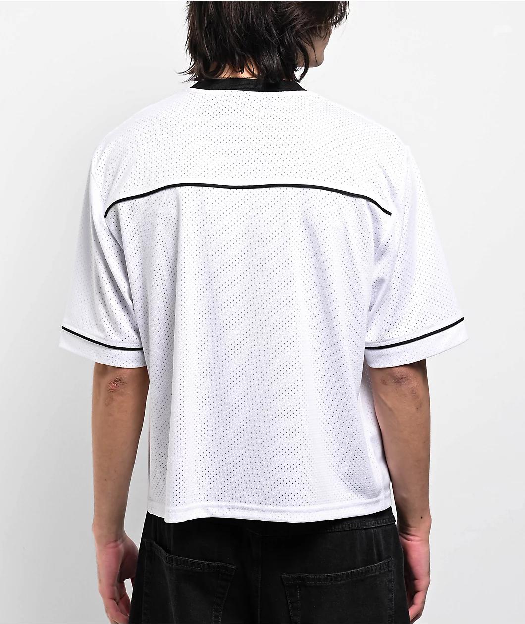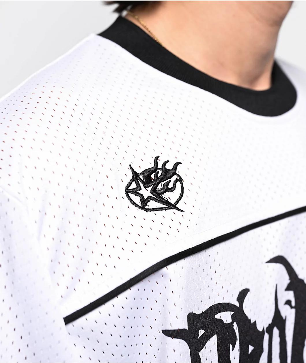 Designed in a skimmer length silhouette for a modern look, Broken Promises introduces the Streetwise football jersey in a clean white mesh construction - made from 100% polyester. The sporty short sleeve displays metal-inspired branding printed on th