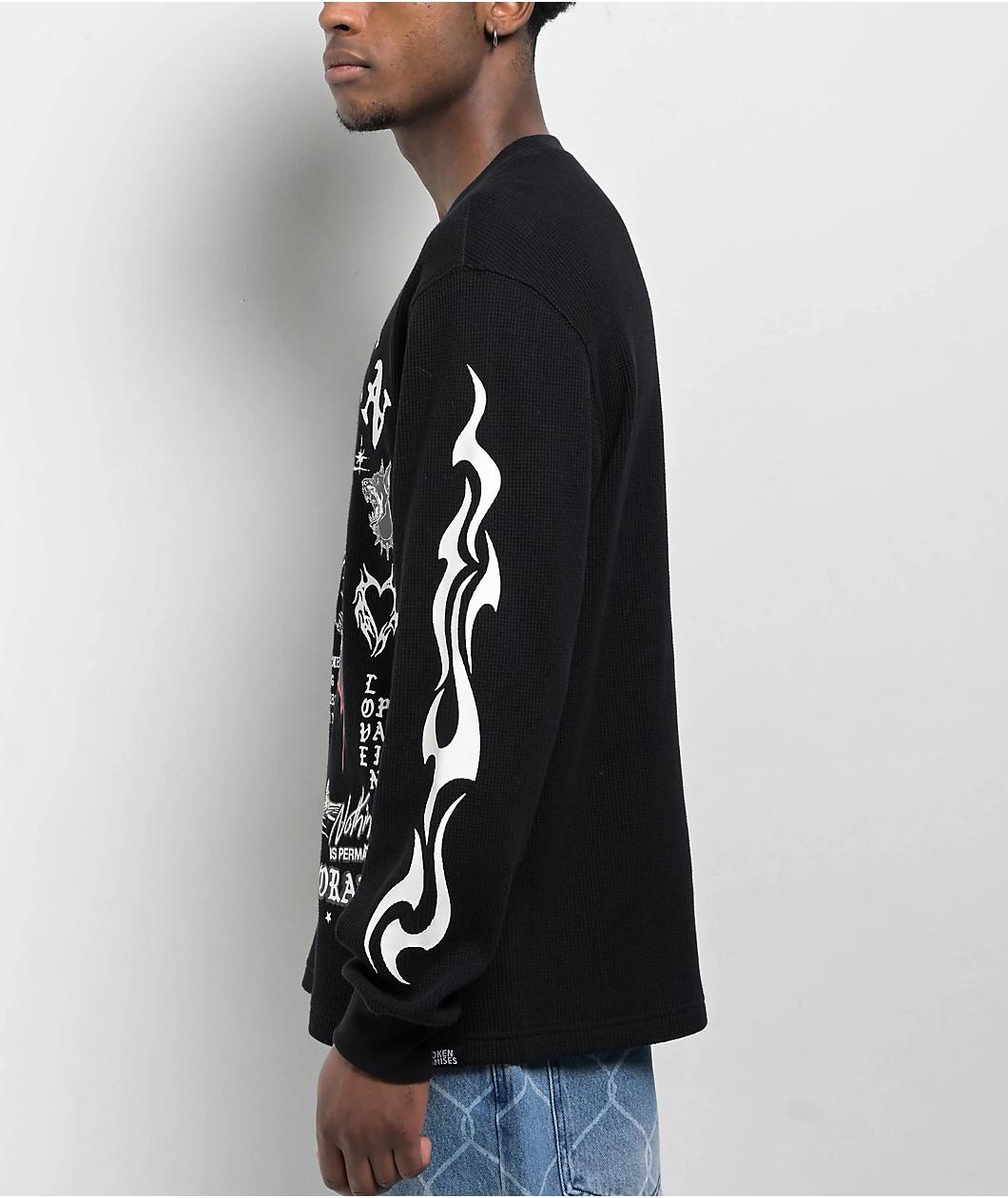 Available in a black thermal-knit construction from Broken Promises, the Temporary long sleeve t-shirt features screened alternative graphics on the front and sleeves. The warm shirt displays cyber sigilism designs on each sleeve while the front show