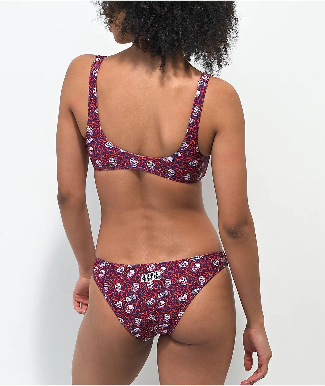 The Trouble In Paradise bikini bottom from Broken Promises come in a cheeky silhouette construction, and features a purple colorway with orange flames and skulls printed throughout.