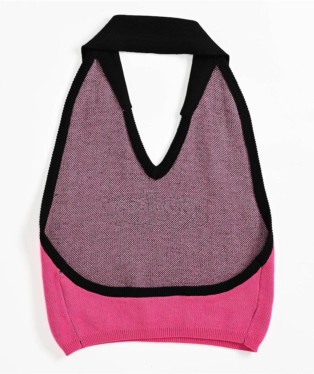 Broken Promises presents the Who Cares halter knit top in a hot pink colorway. This warm cotton blend offers a cozy fabric complimenting the slim fit, crop, and collared piece.