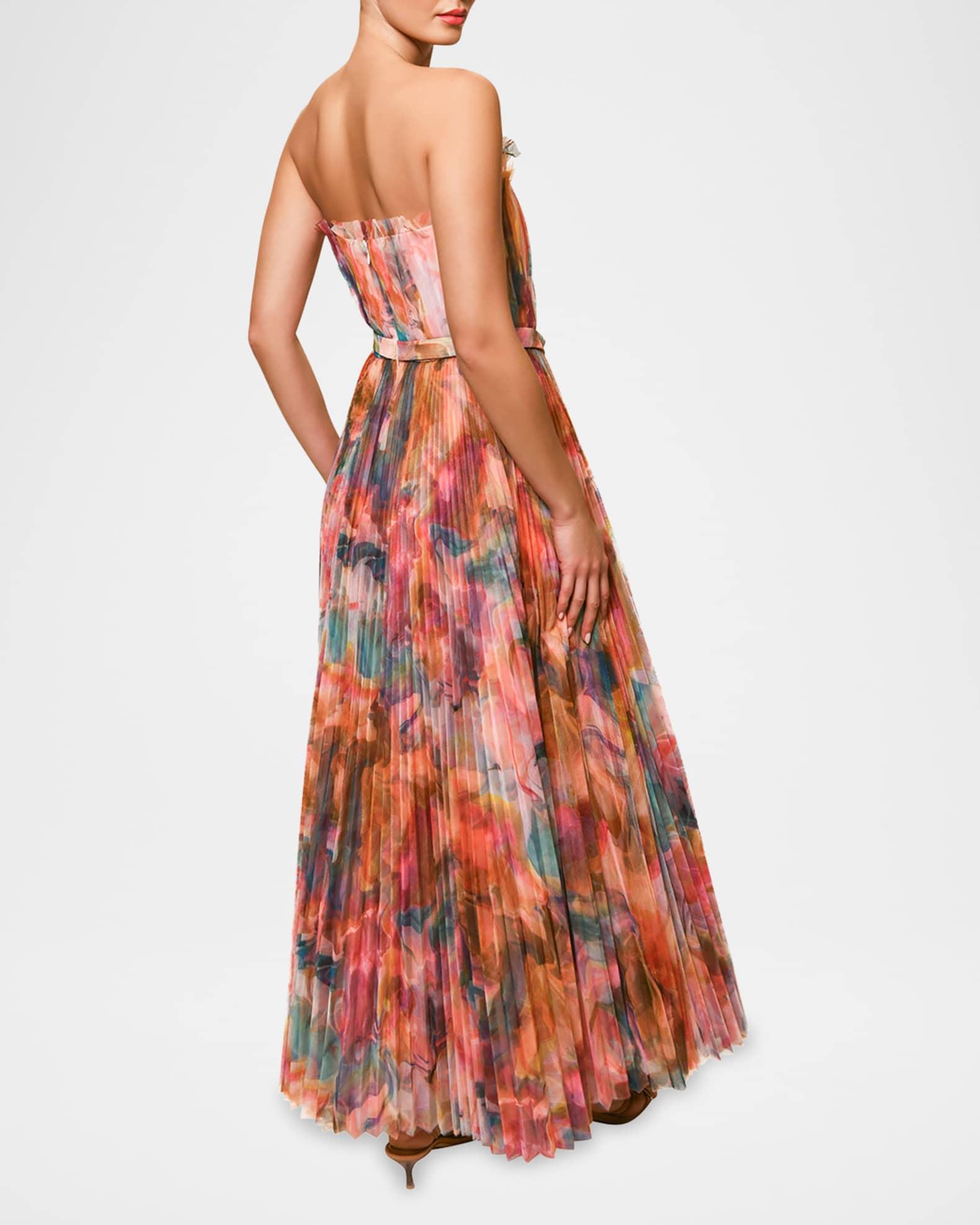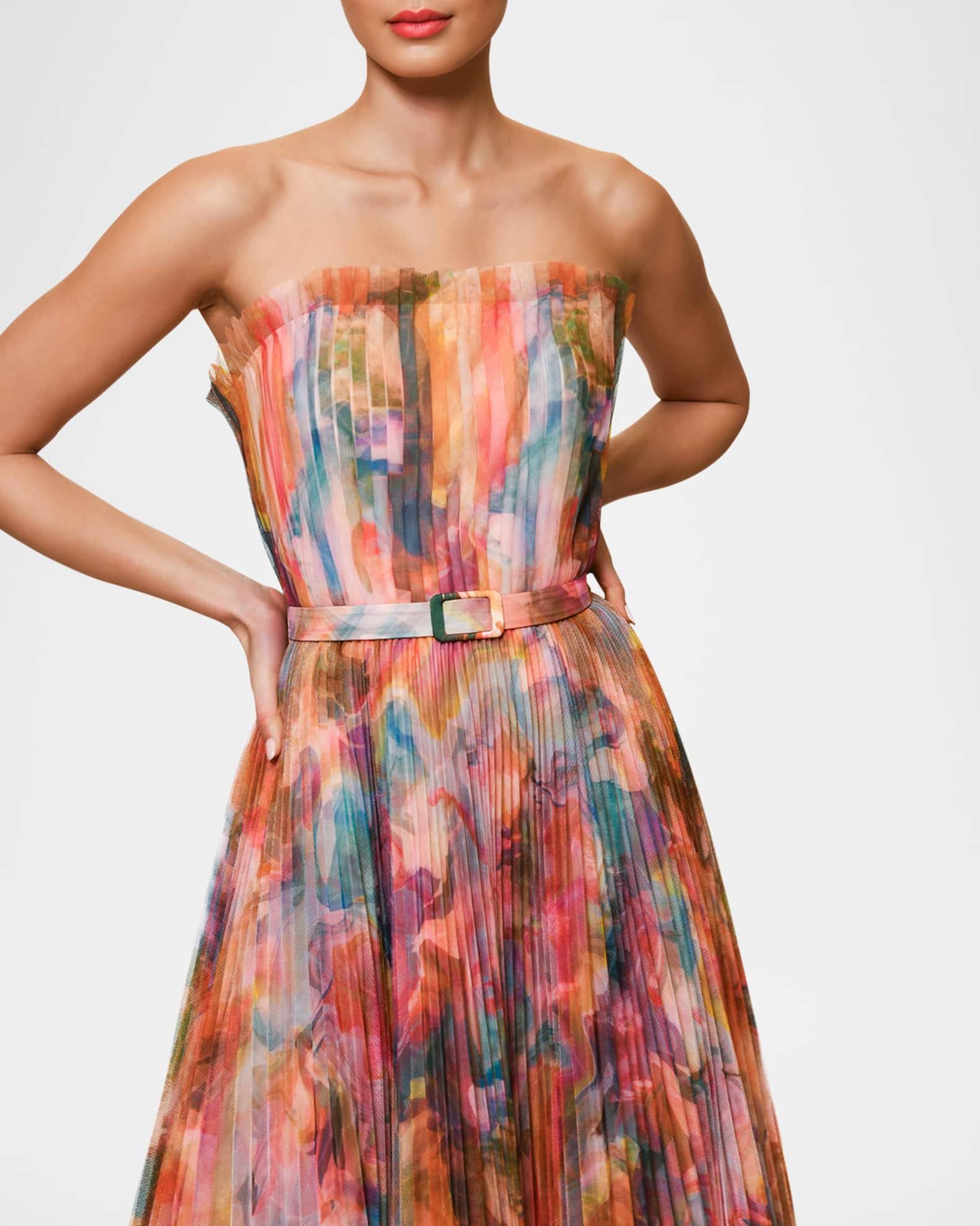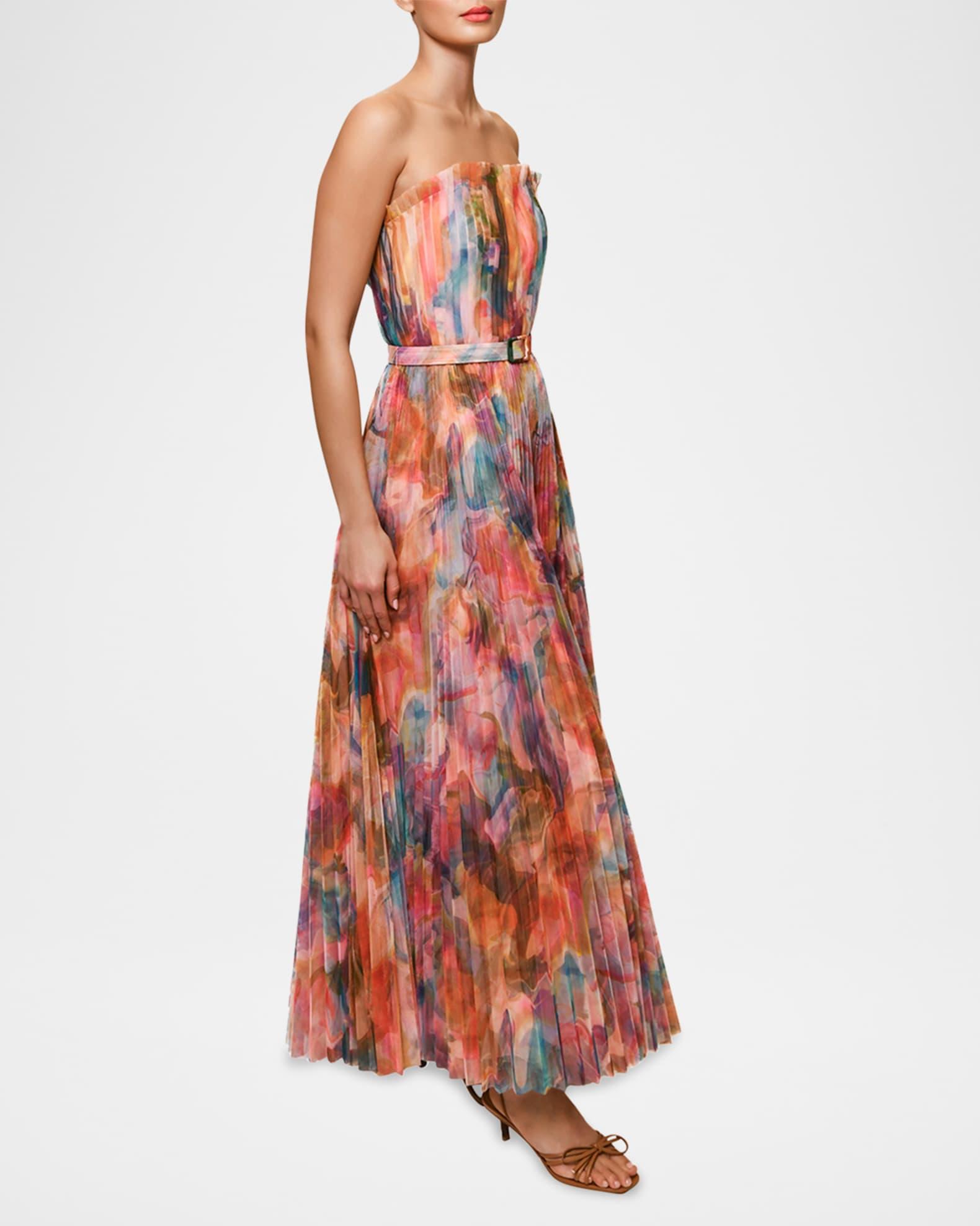 Finished with accordion pleating, the "Bromley" tulle gown from Hutch features an abstract print, providing rippling movement with each spin Approx. 55.5"L from neckline to hem Strapless neckline Sleeveless Belted waist Full length A-line silhouette Invisible back zipper Polyester Lining: Polyester Dry clean Imported