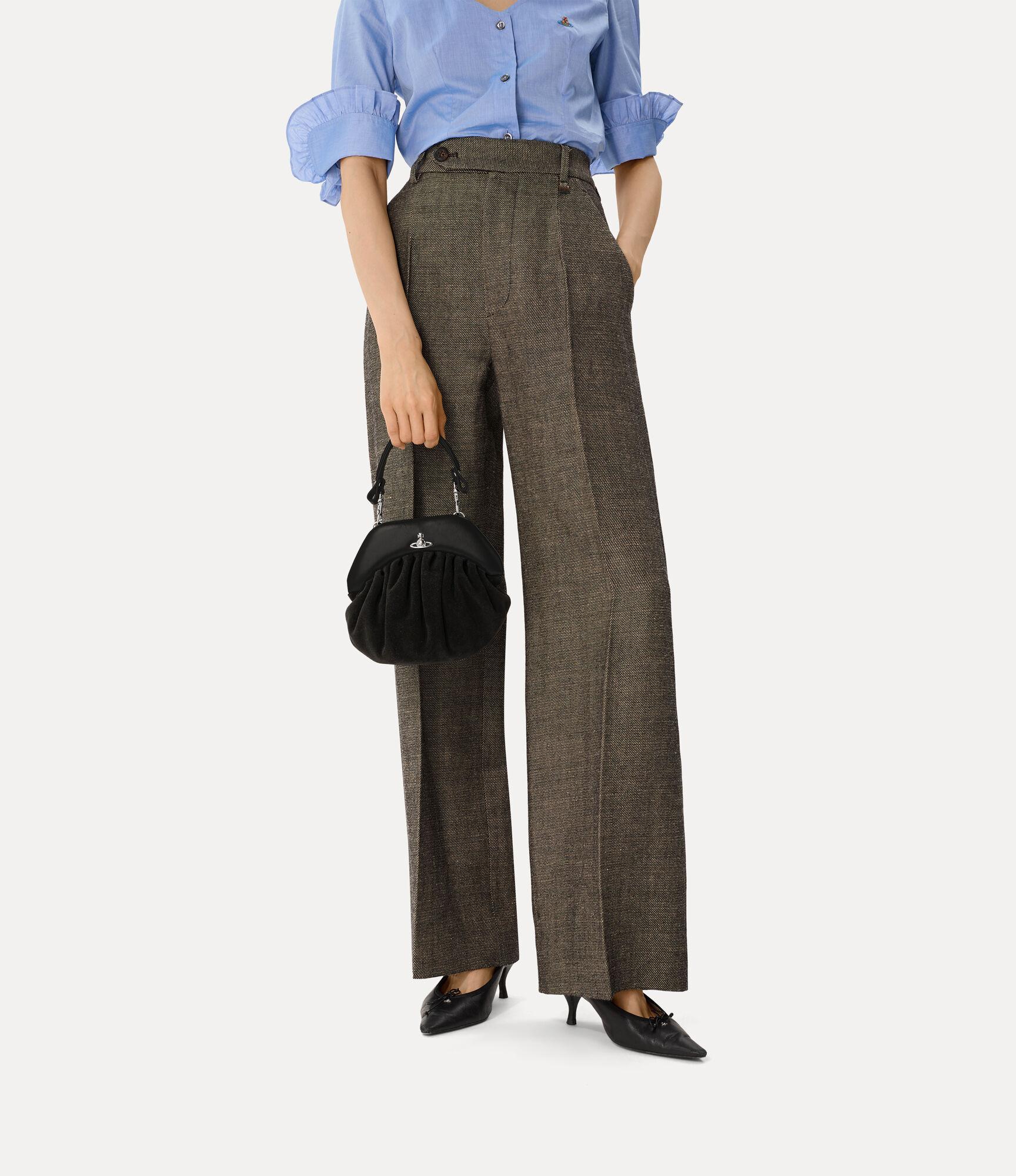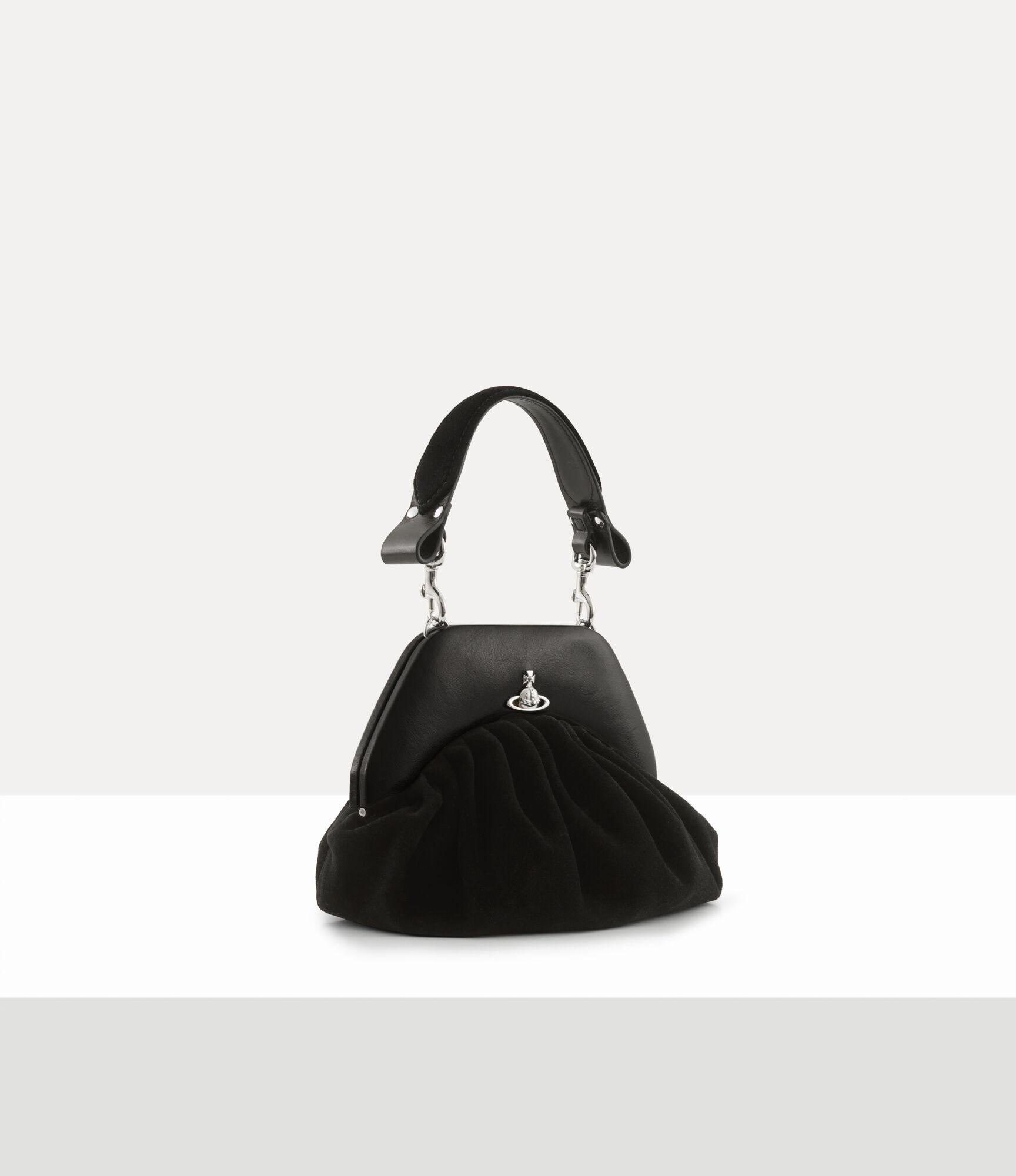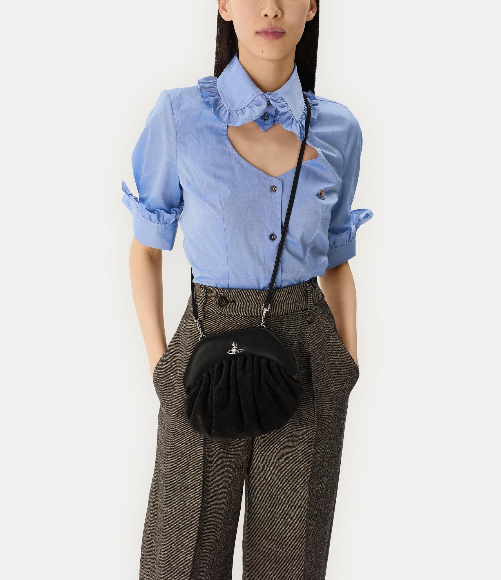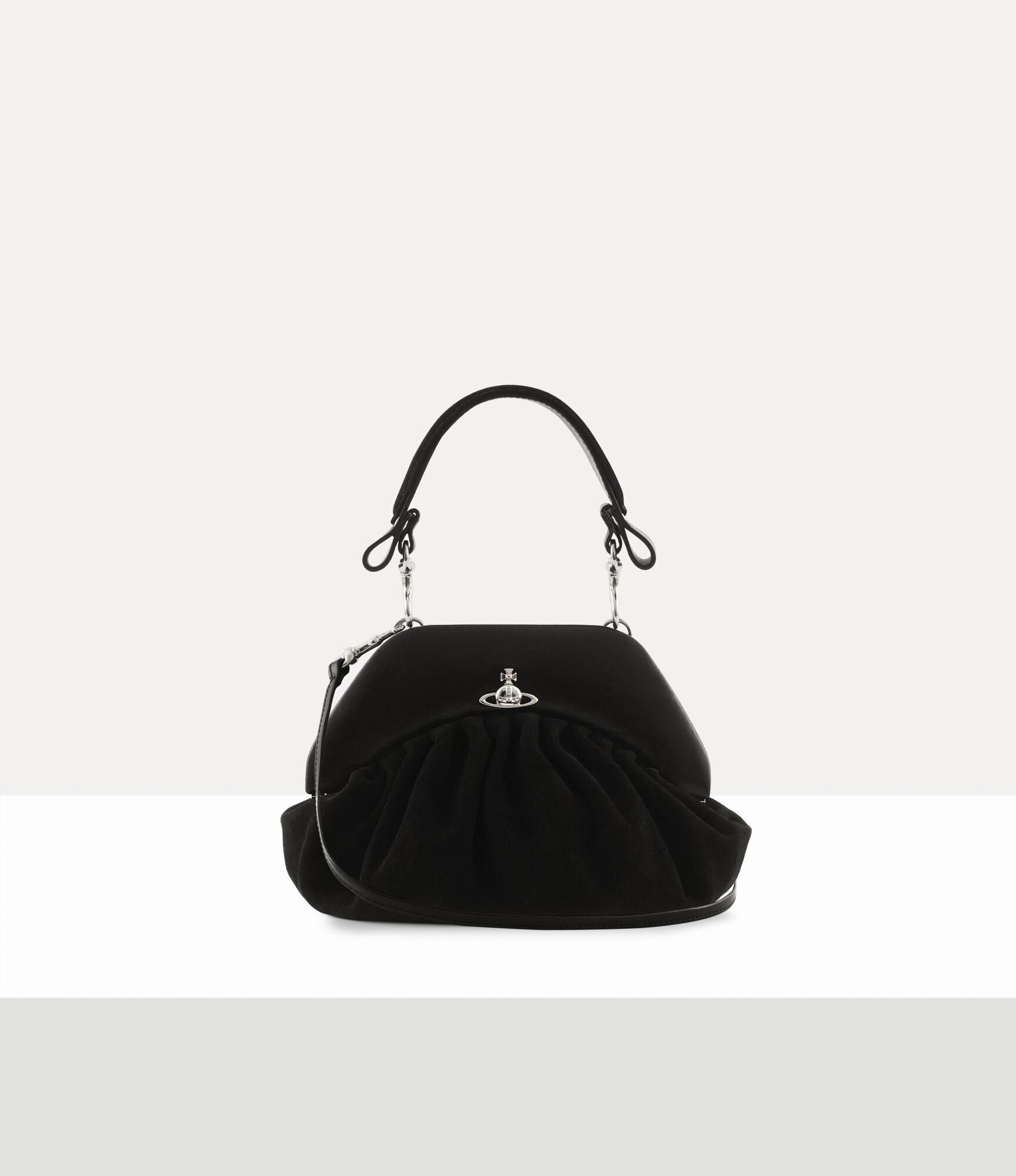 The Brooke clutch is crafted from soft suede leather and takes inspiration from the ruched “dumpling” bags of the 1940s, echoing the post-war evolution of women’s handbags. Defined by decorative pleating, the clutch features a miniature interpretation of the signature 'Hazel' top handle and is completed with the metal orb motif at the centre, recalling Vivienne's vision of launching tradition into the future.