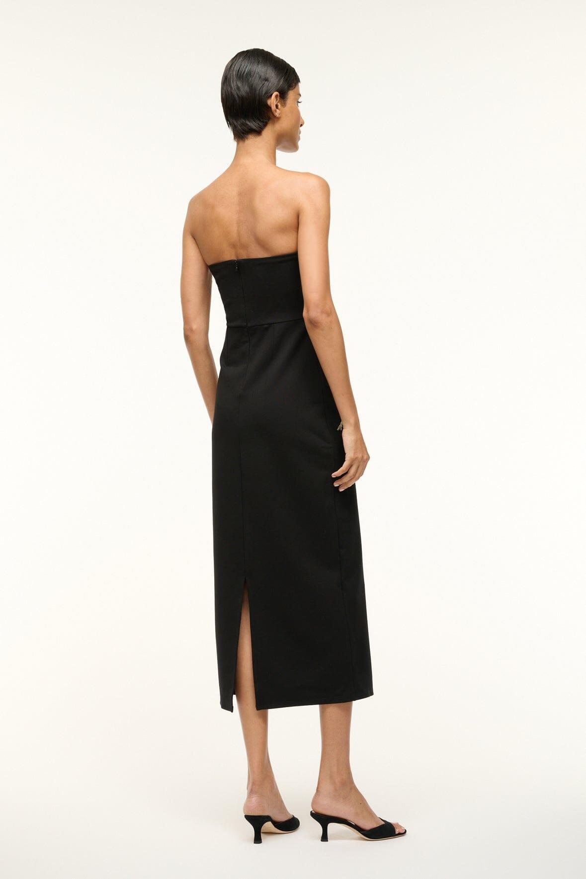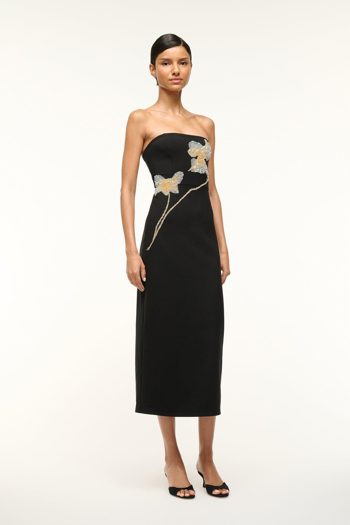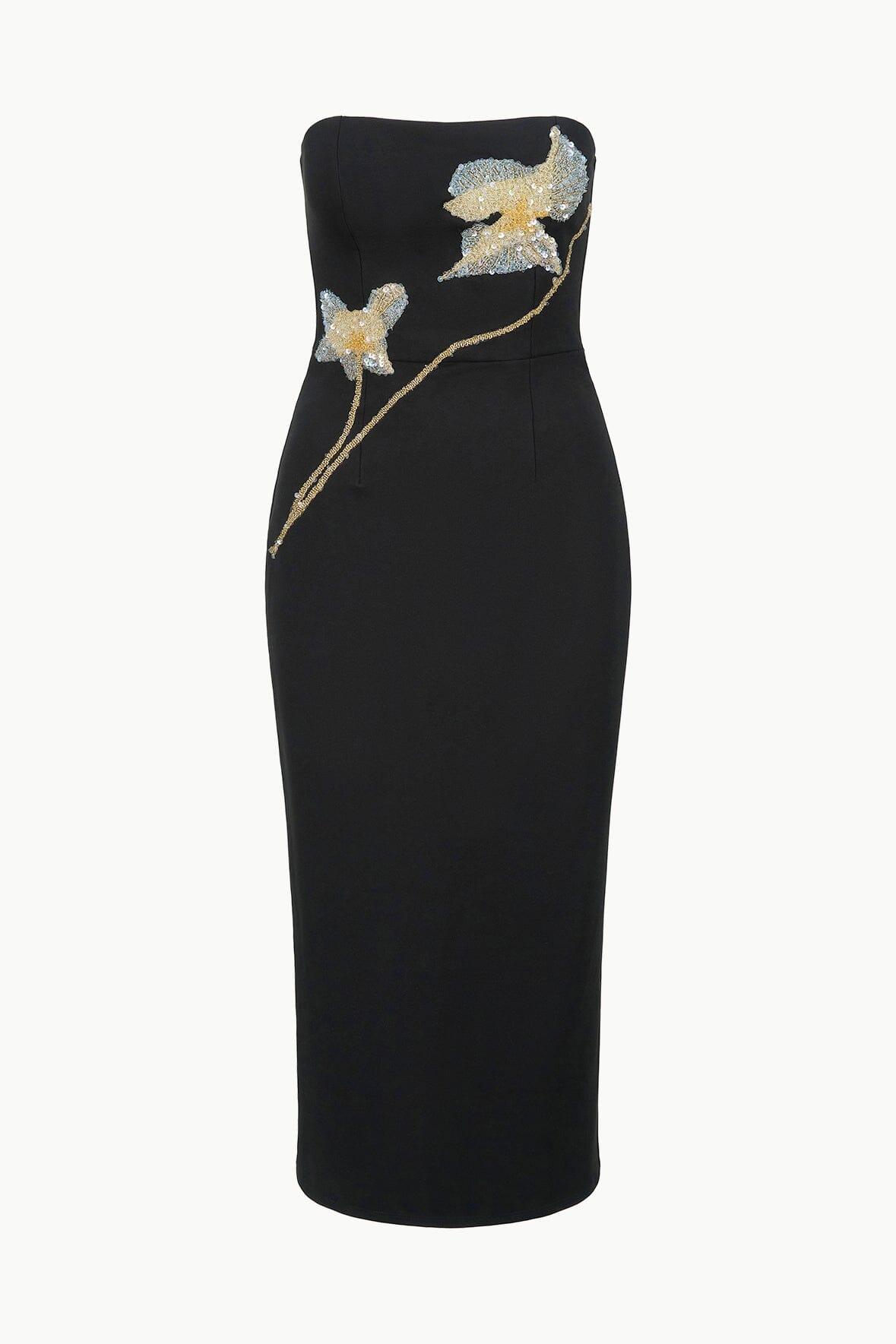 The Brooke is a strapless midi length dress with a hand-beaded floral detail across the bodice.