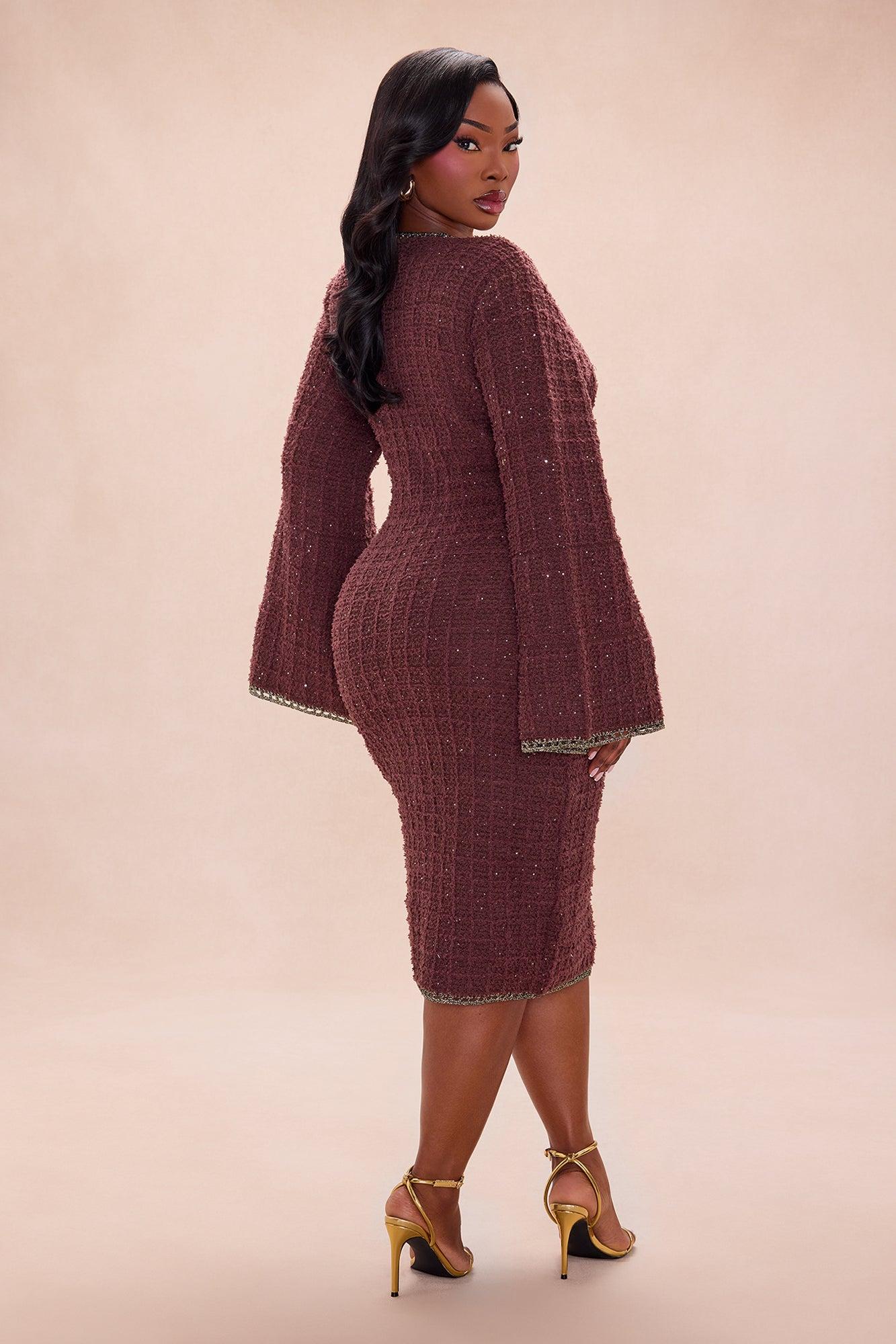 Available In Chocolate. Tweed Maxi Dress Long Bell Sleeve Scoop Neckline Metallic Contrast Trim Embellished Pockets Stretch Shell: 60% Polyester 35% Cotton 5% Acrylic Imported California Proposition 65WARNING: Cancer and Reproductive Harm - www.P65Warnings.ca.gov.