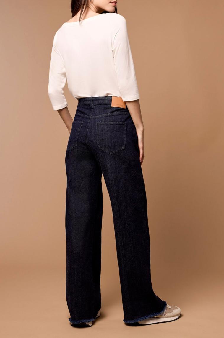 Dark denim trouser style jean with wide leg.