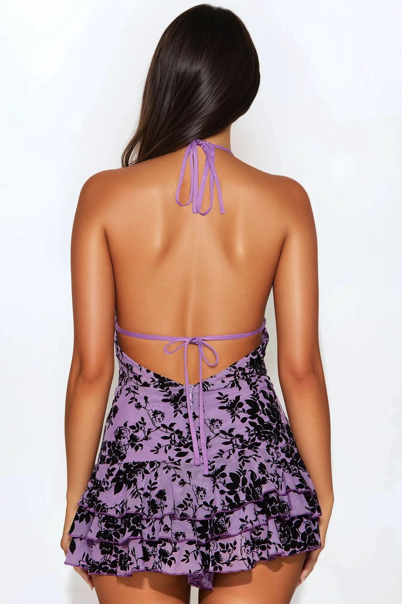 Available In Purple/combo. Romper Halter Tie Neck and Back Tie Adjustable Bust with Strap Detail Invisible Back Zip Closure Merrow Stitch Hem on Ruffles Lined Bust and Short Flowy Short Slight Stretch Velvet Burnout Fabric Disclaimer: Placement Of Burnout Will Vary. Self: 95% Polyester 5% Spandex Lining: 100% Polyester Imported