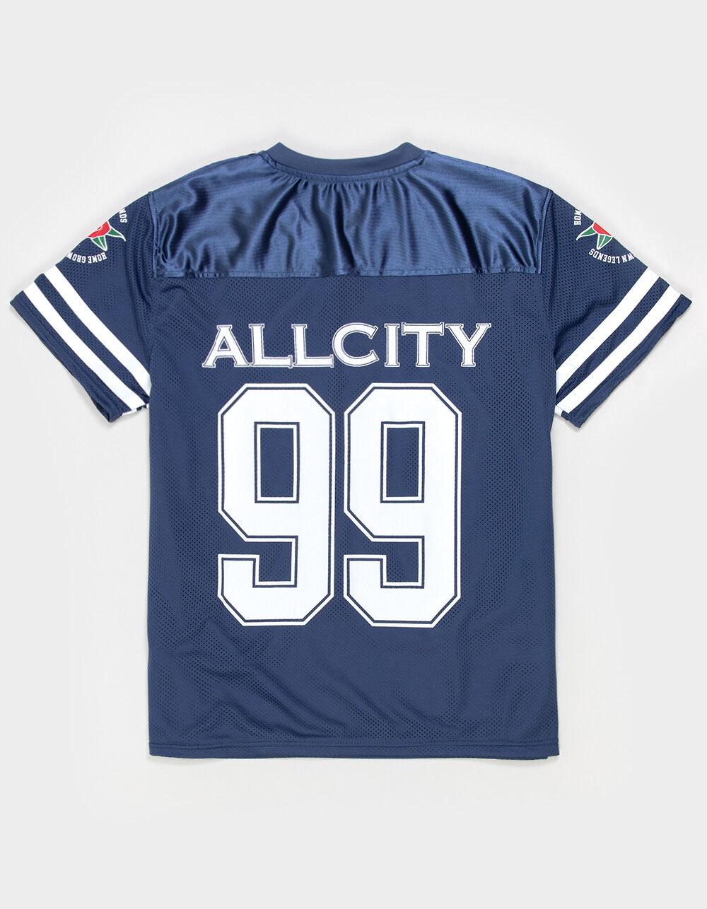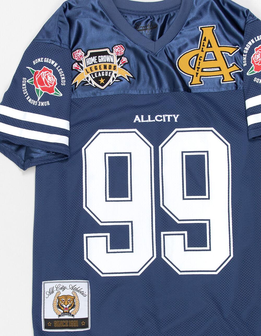 Brooklyn Cloth Mesh Football Jersey. Embroidered patches at left and right chest. ALL CITY embroidery at chest with large 99 screened below. Woven labels at hem and side seam. Graphics and stripe details on sleeves. Large ALL CITY and 99 on back. V-neck. Short sleeve. 100% Polyester. Machine wash. Imported.