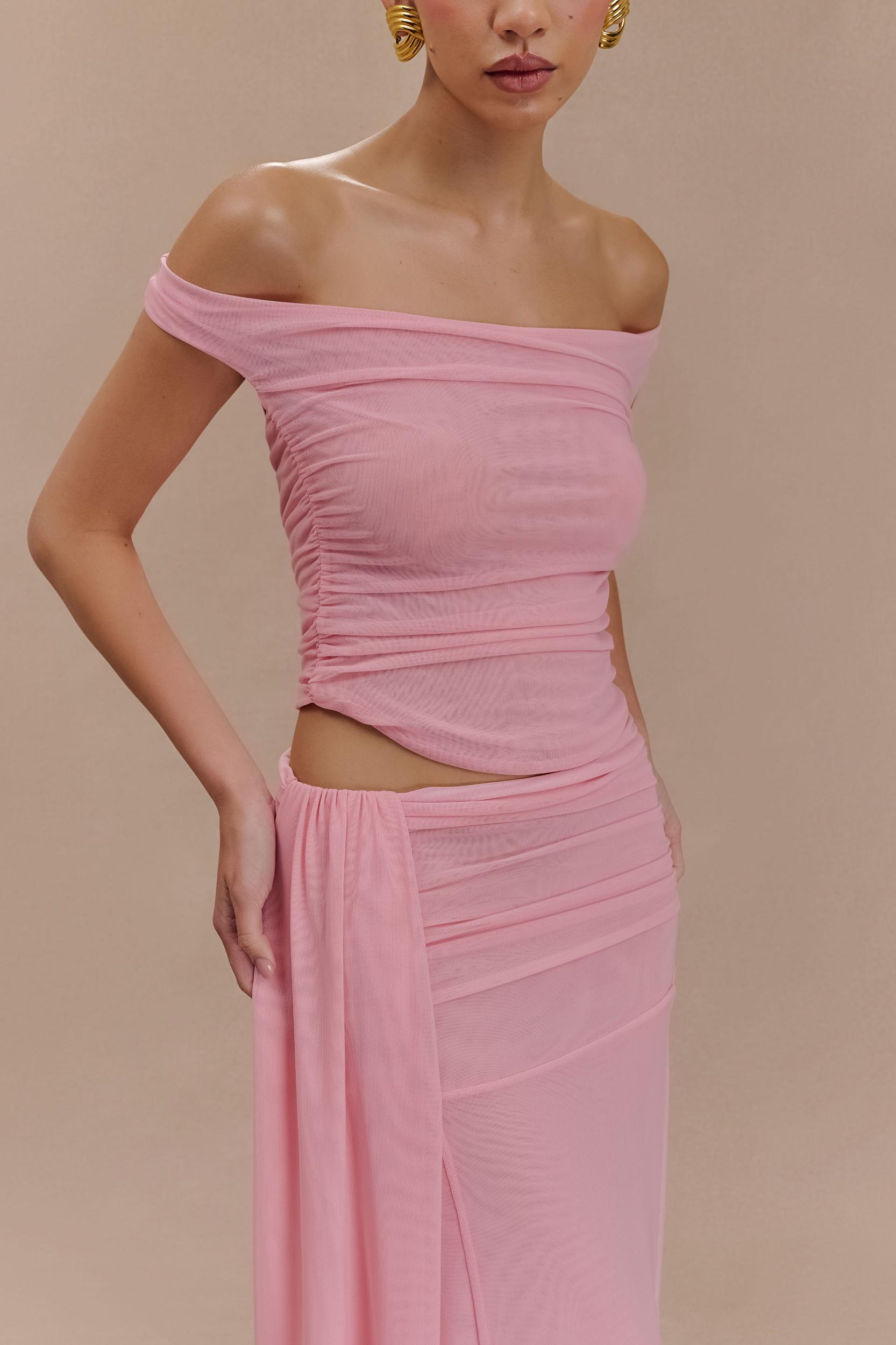 Made to be seen. Introducing the BROOKLYN Mesh Crop Top, a chic fusion of style and sensuality. Featuring a wide scoop neckline, this top beautifully frames the neckline, while the dolphin hem shape adds a touch of playful movement. The ruched waist enhances your curves, creating a flattering silhouette, and the open back with a delicate tie detail lends an unexpected yet elegant twist. Crafted from double-layered mesh fabric for a semi-sheer look, the cropped length pairs perfectly with high-waisted pieces. For a seamless, head-turning ensemble, style it with the Arna Mesh Maxi Skirt for a sophisticated and coordinated finish.