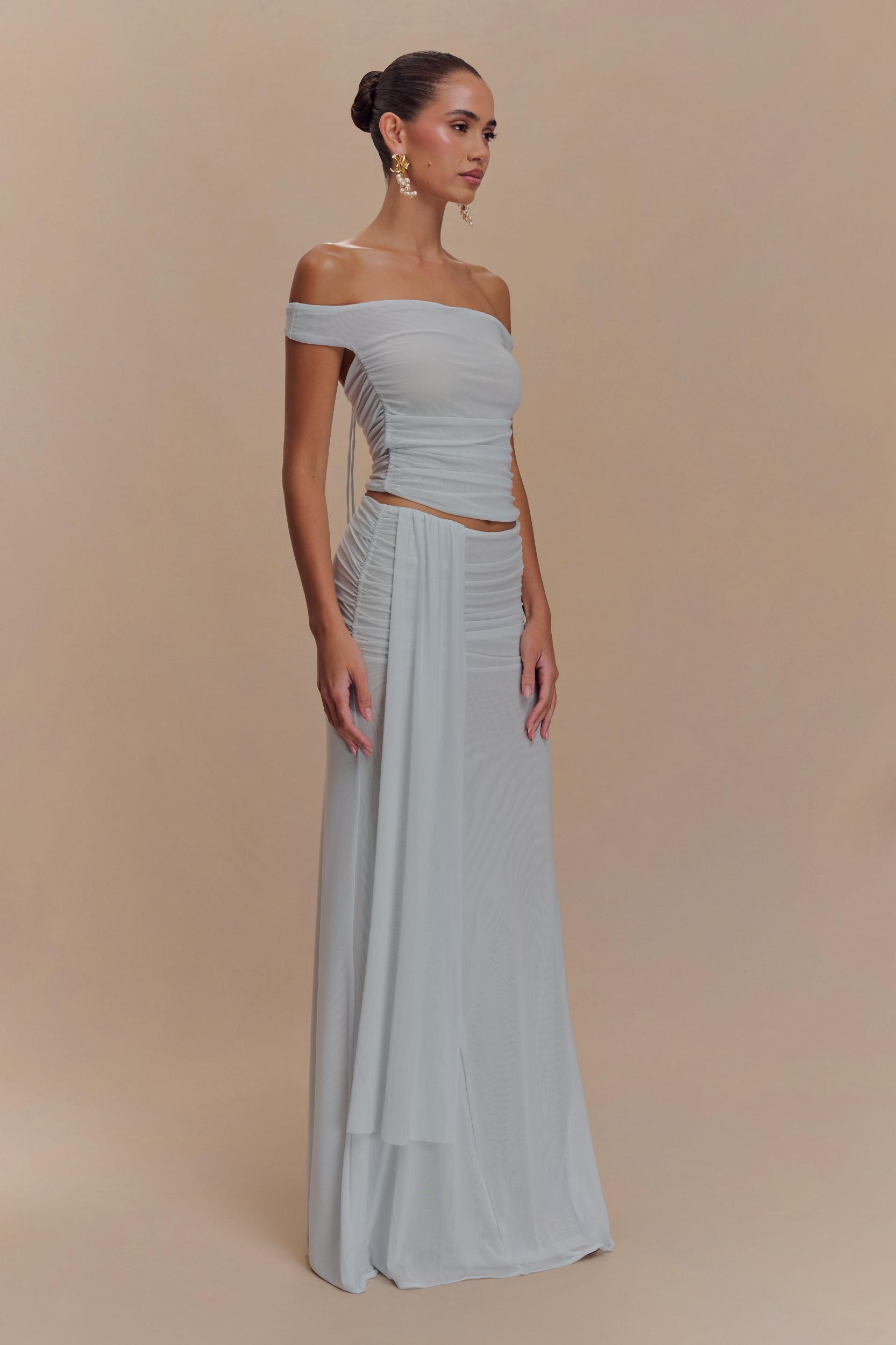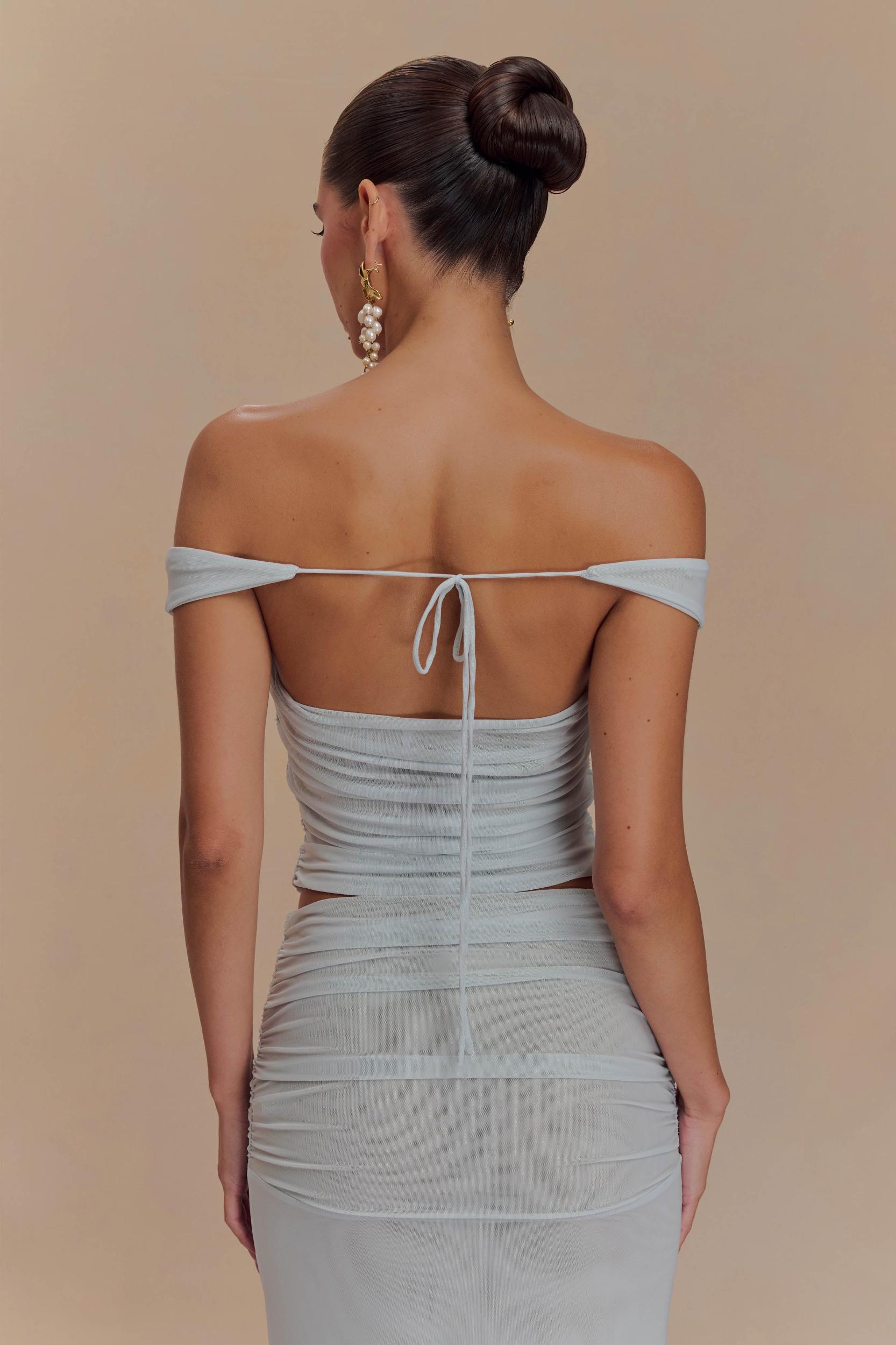 Made to be seen. Introducing the BROOKLYN Mesh Crop Top, a chic fusion of style and sensuality. Featuring a wide scoop neckline, this top beautifully frames the neckline, while the dolphin hem shape adds a touch of playful movement. The ruched waist enhances your curves, creating a flattering silhouette, and the open back with a delicate tie detail lends an unexpected yet elegant twist. Crafted from double-layered mesh fabric for a semi-sheer look, the cropped length pairs perfectly with high-waisted pieces. For a seamless, head-turning ensemble, style it with the Arna Mesh Maxi Skirt for a sophisticated and coordinated finish.
