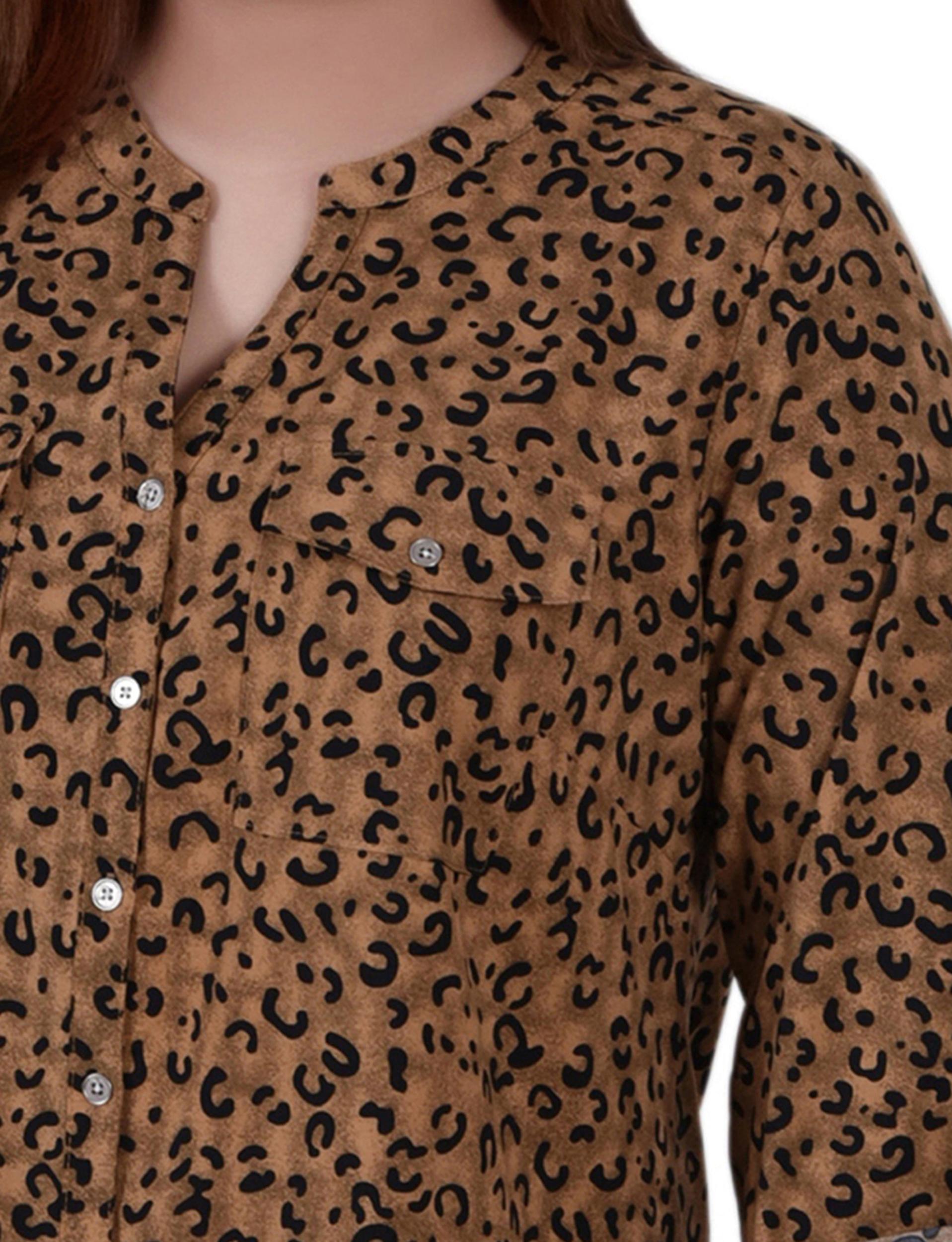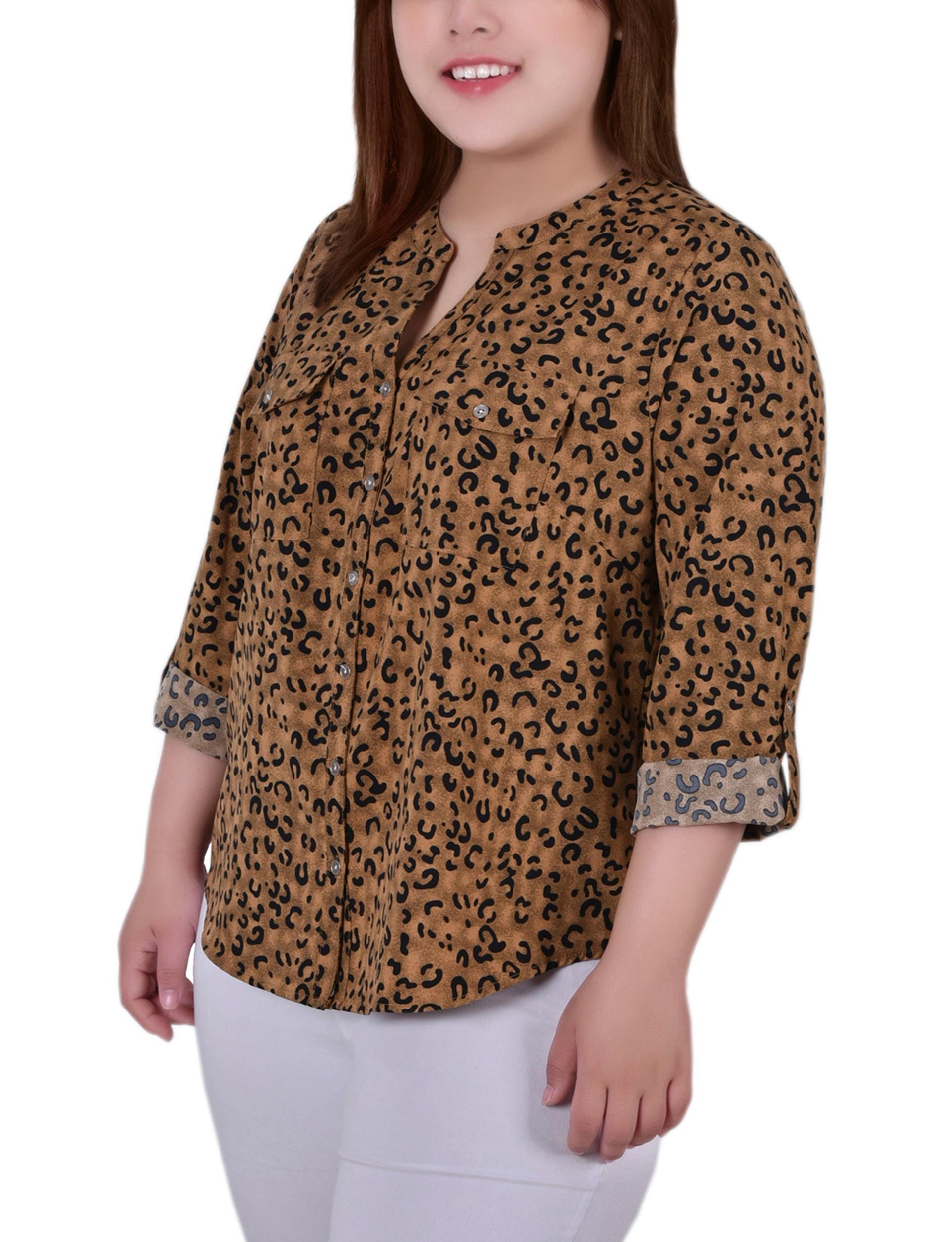 Brown 3/4 Roll Tab Sleeve Mandarin Collar Blouse - Plus Size