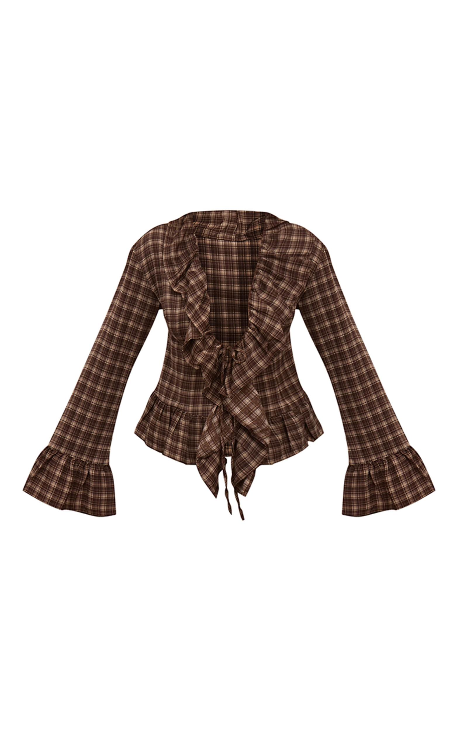 Opt for a timeless look in this brown check print ruffle blouse. Made from brown material with a checked pattern, this blouse has long sleeves and elegant ruffle detailing. Team it with a brown mini skirt or a pair of tailored pants for a seasonal look that we're loving right now.Length approx 48.5cm/19inch (Based on sample size US 4)Model wears size UK 8/ EU 36/ AUS 8/ US 4Model Height - 5ft 9inchp]:!mb-4inch>Brand: PrettyLittleThingCategory: TopsProduct type: BlouseColor: BrownMaterial: ChiffonOccasion: Day