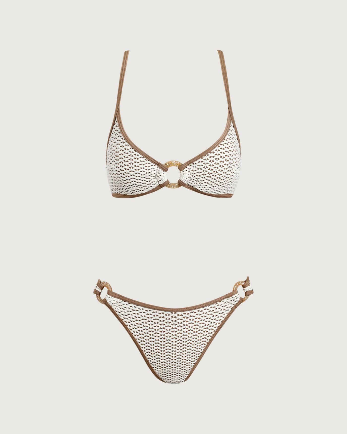 - Back Neckline: Strappy - Fabric Stretch: High Stretch - Waist: Low Waisted - Closure Type: Elastic Waist - Pattern Type: Solid - Embellishment: Crochet, Knot, Tie, Cut Out, O-Ring, Textured - Neckline: U Neck - Fabric: Polyester 92.0%, Spandex 8.0% - Lining: Polyester 89.0%, Spandex 11.0% - Leg Opening: Mid Cut Leg - Padding: Removable Soft Cups - Bottom Coverage: Moderate Bottom Coverage - Bra Coverage: 3/4 Cup - Top Style: Bralette Fabric Types(Pattern Style): textured