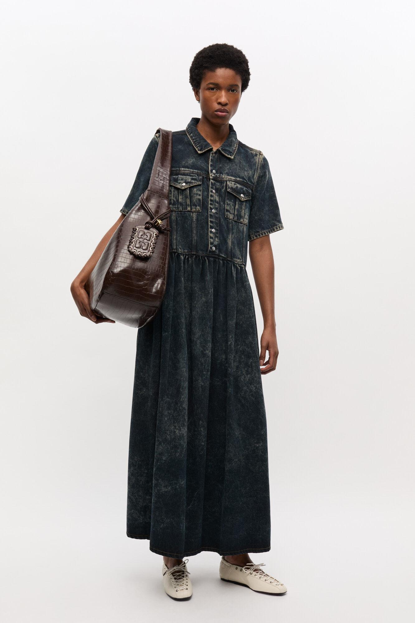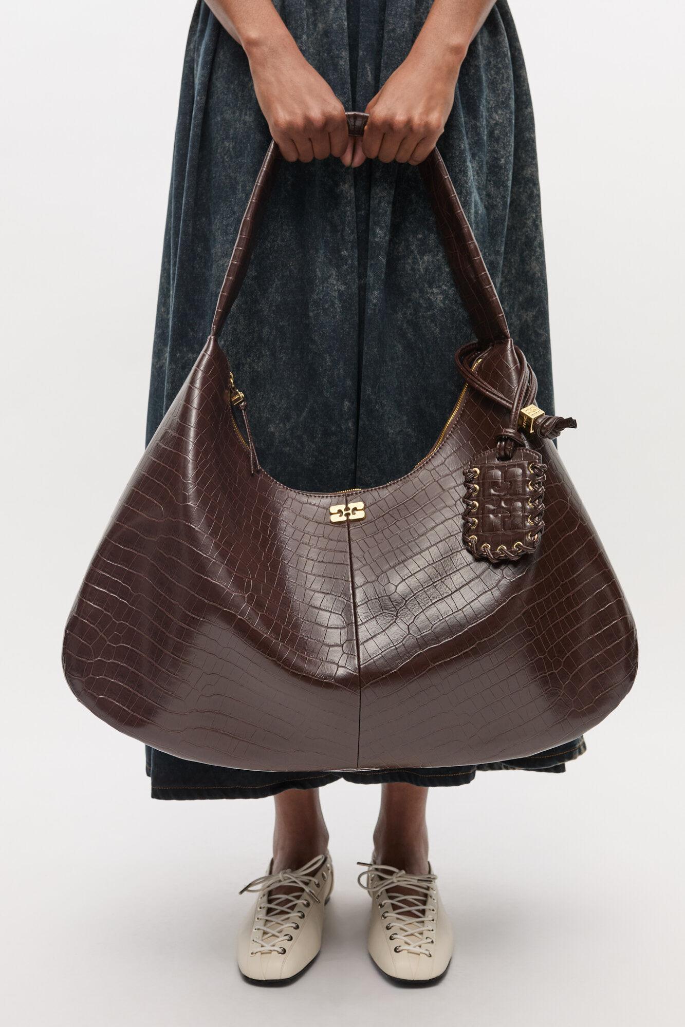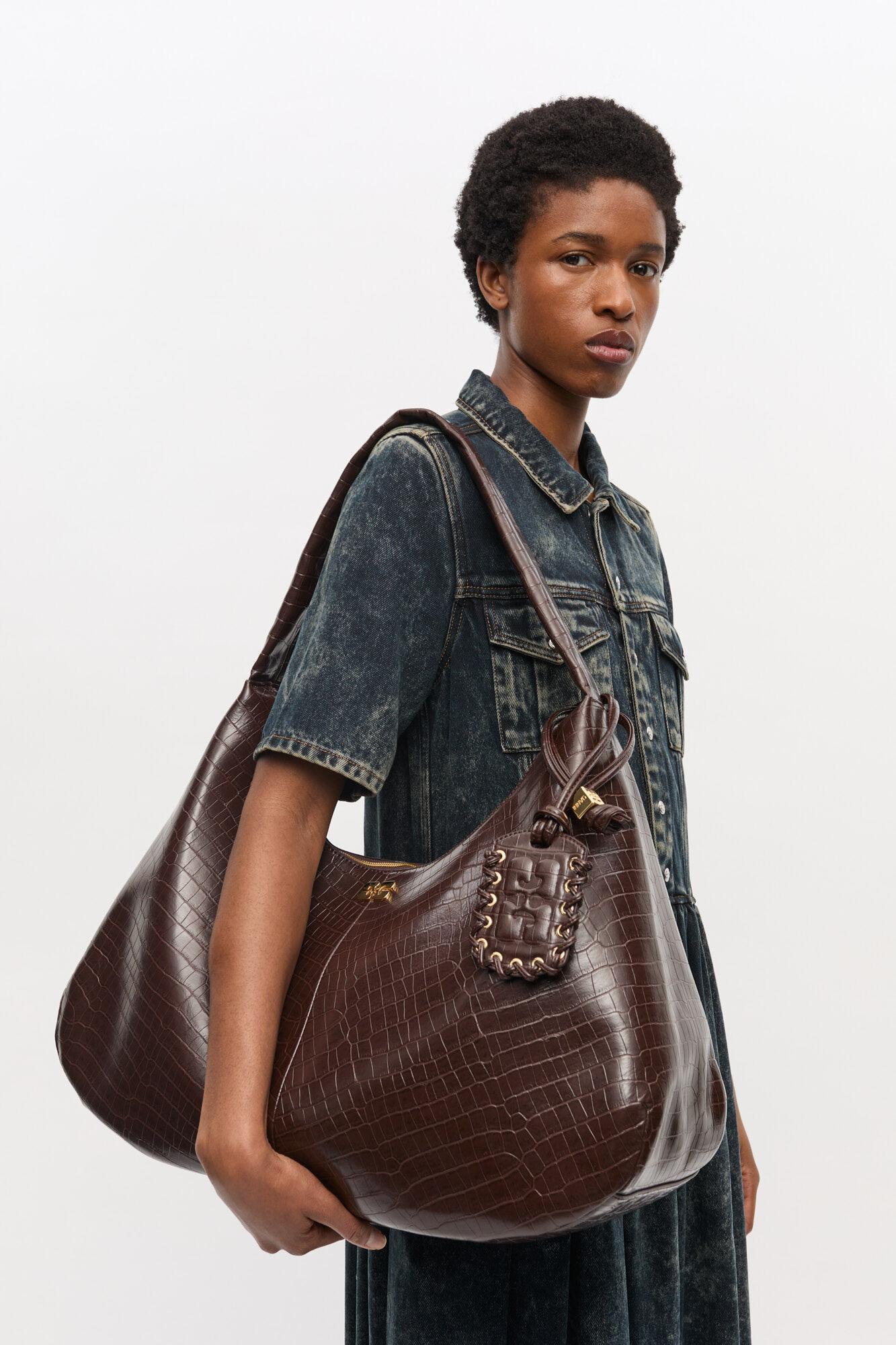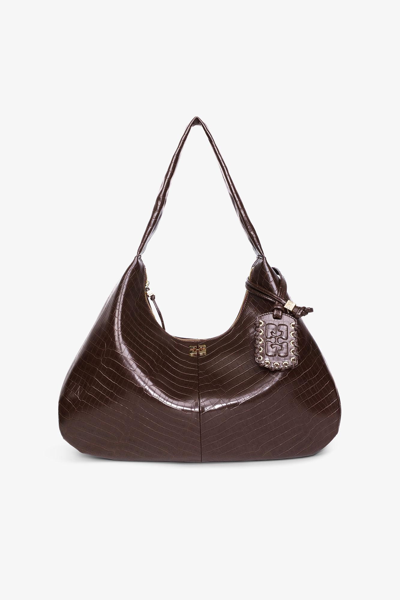 The bag is crafted in recycled leather with a croco finish featuring a mirror hangtag and logo hardware