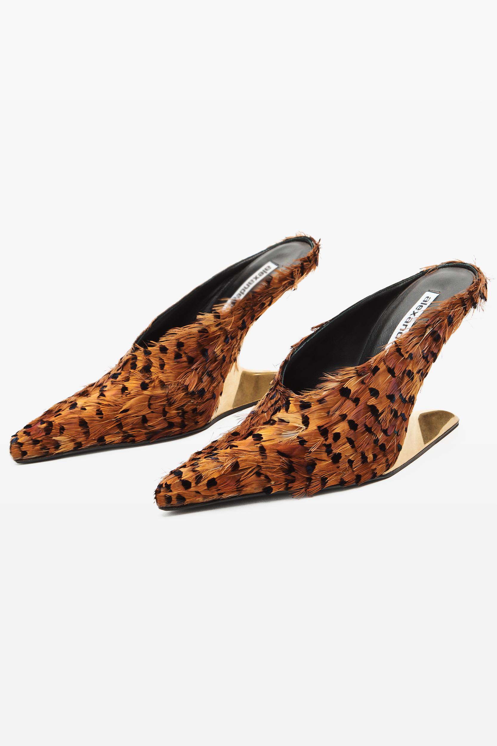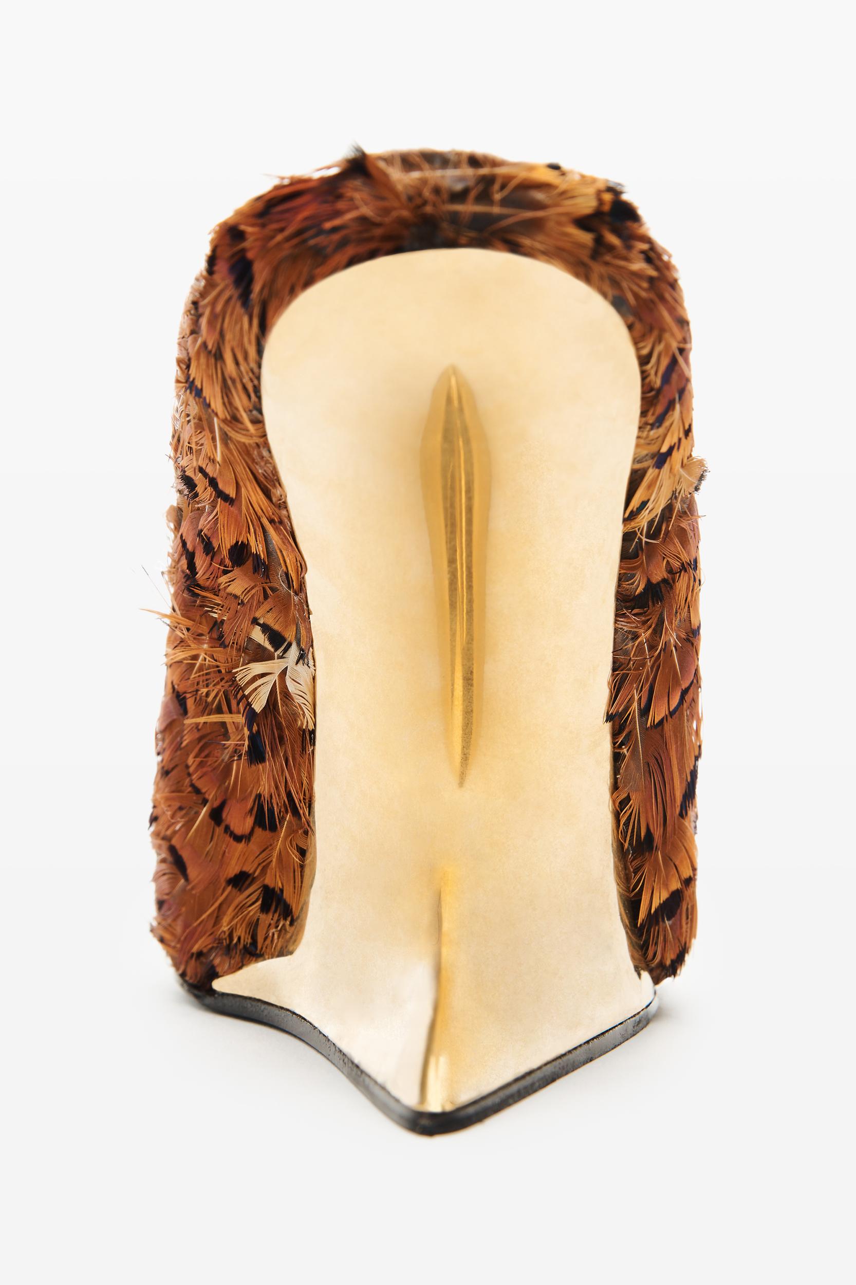 brown pheasant feathers on this wedge mule evoke the wildlife-inspired elements of this collection. with its sculpted gold-tone heel and pointy toe, this style merges elevation with architectural heel design.