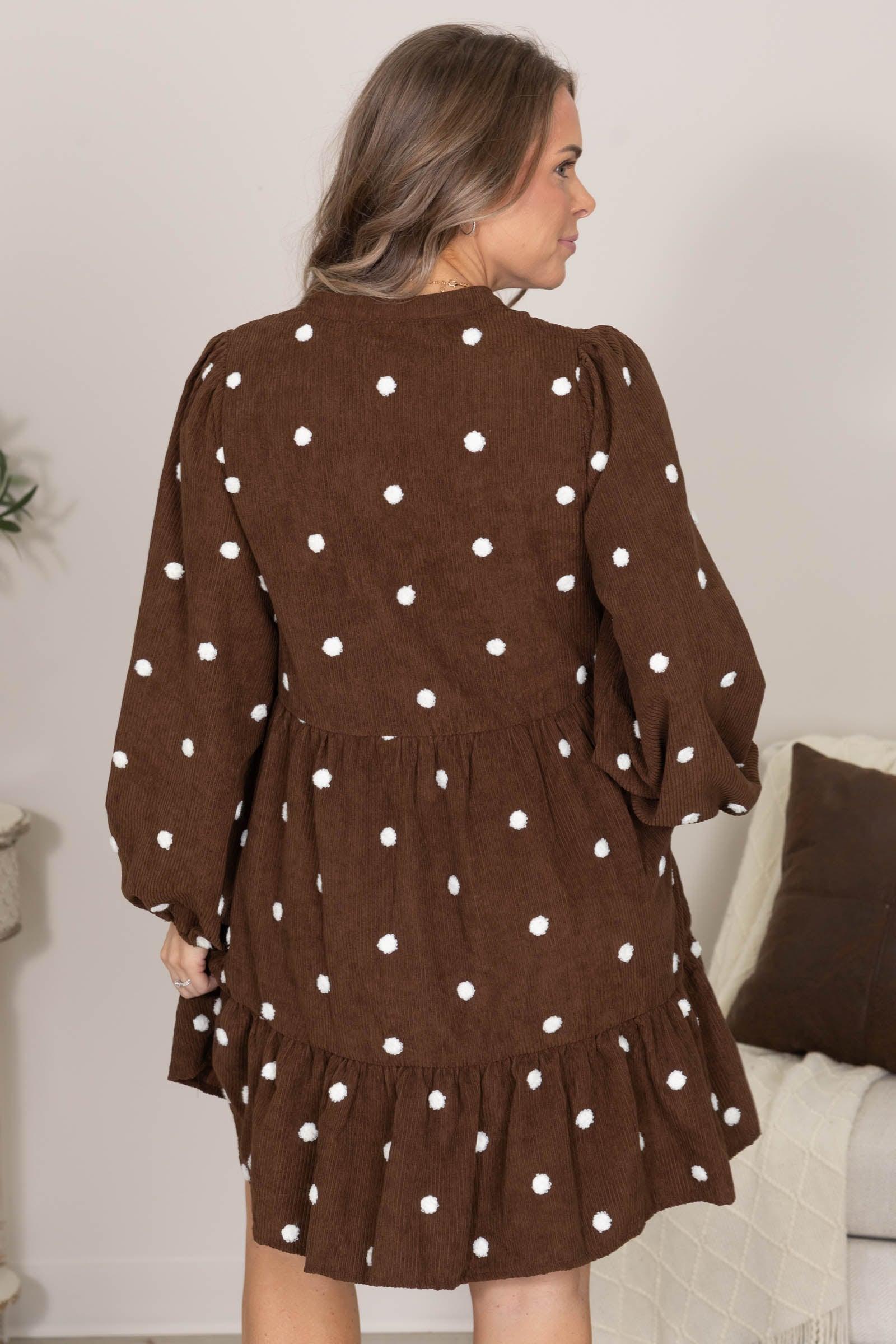 Product Details Colors: Brown, White Print: Textured/Polka Dot Neckline: V-Neck Sleeve: Long Sleeve Hemline: Straight Brand: Anniewear Material and Care Self: 100% Polyester Lining: 100% Rayon Hand Wash Cold Hang/Line Dry Size and Fit Small: Bust 38" Waist 38" Length 36" Medium: Bust 40" Waist 40" Length 36.5" Large: Bust 42" Waist 42" Length 37" X Large: Bust 44" Waist 44" Length 37.5" Erica is wearing a size small