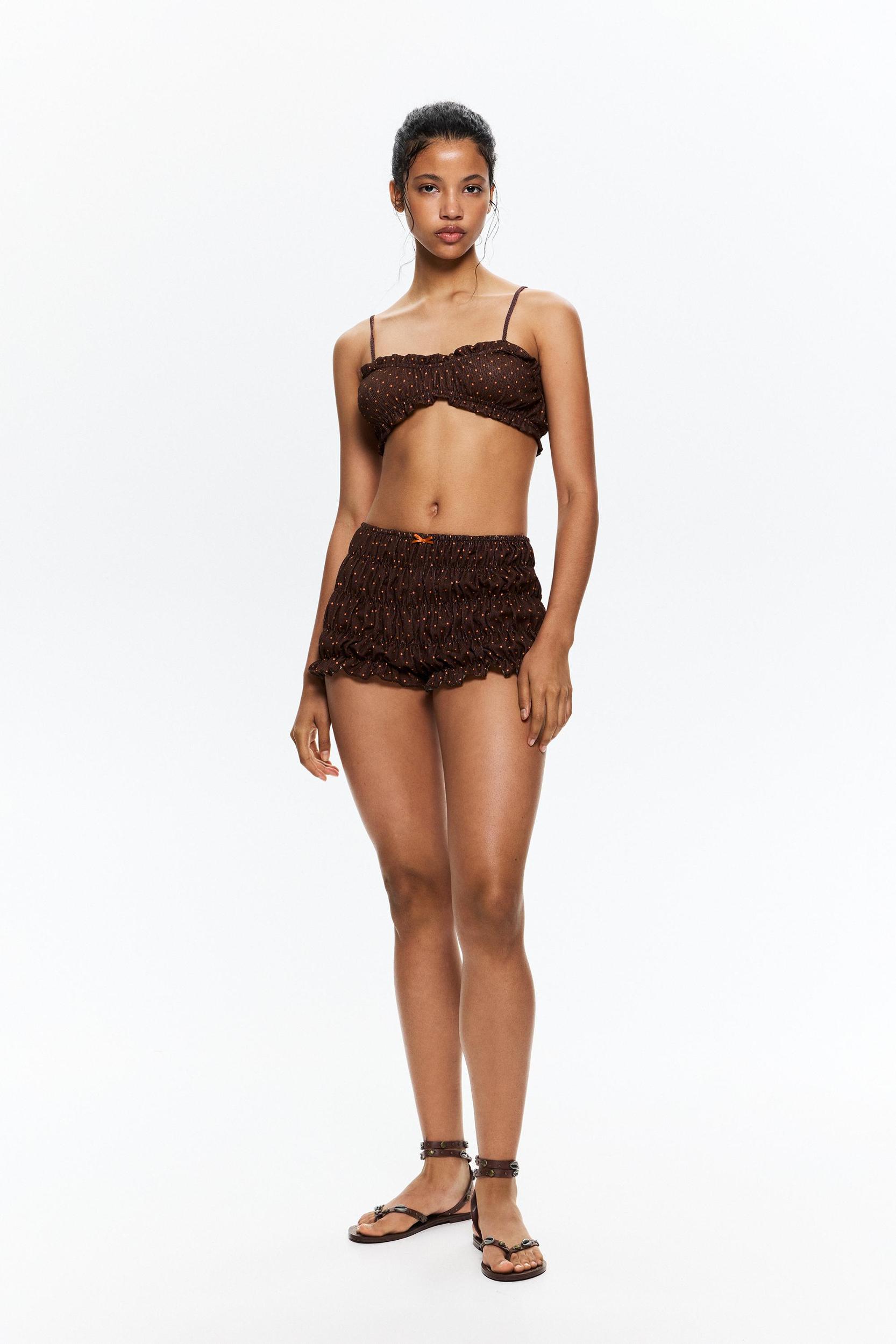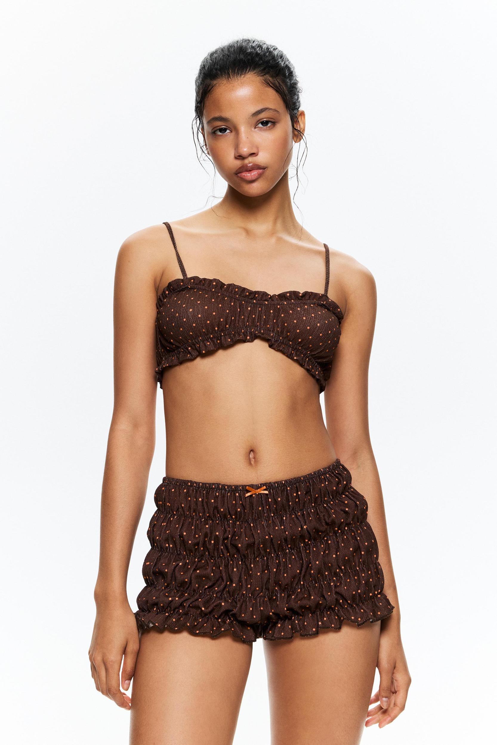 Chocolate brown crop top with a polka dot print and thin straps. Total look Pacific Republic Collection