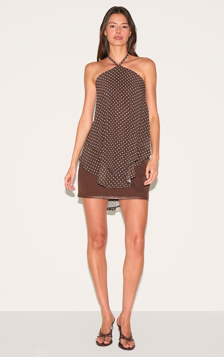 Polka dots, refined. The brown polka dot floaty chiffon halterneck long top takes the classic print and applies it to a modern shape. It features a sleek halterneck, a floaty cut that moves freely, finishing at a knowing longline length. Anchor this piece with simple bottoms like a mini skirt or sharp tailored pants for a confident day edit. The composed essential your day needs.Model wears size UK 8/ EU 36/ AUS 8/ US 4Model Height - 5ft 7inchp]:!mb-4inch>Brand: PrettyLittleThingCategory: TopsProduct type: Vest TopColor: BrownMaterial: ChiffonDesign: PlainNeckline: HalterneckSleeves: SleevelessOccasion: Day