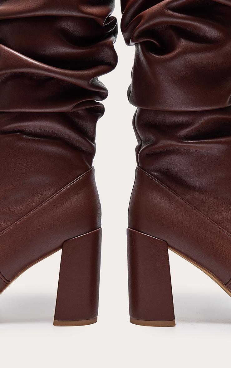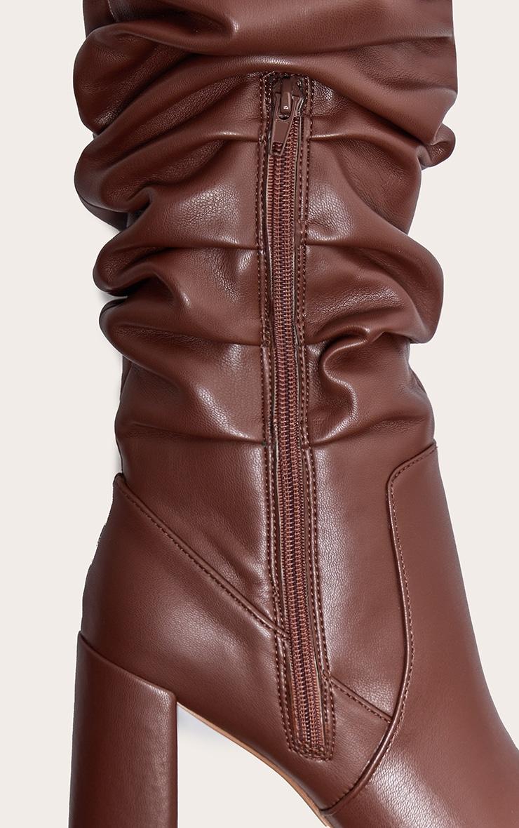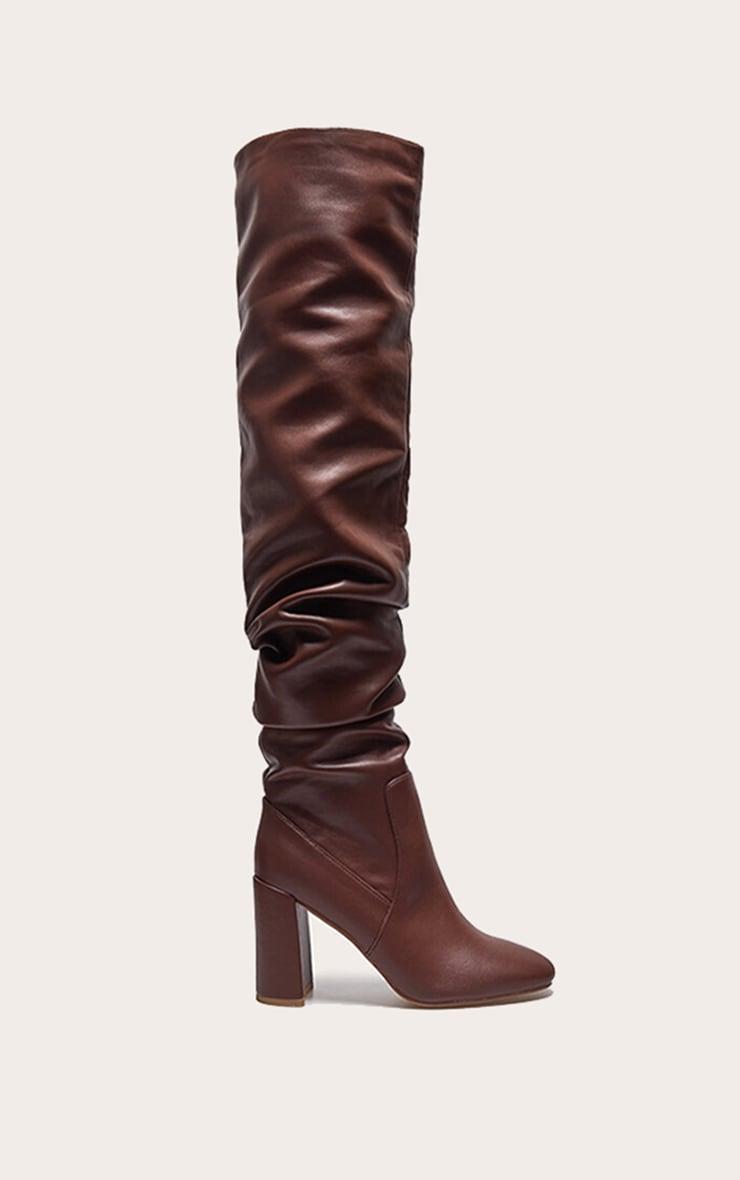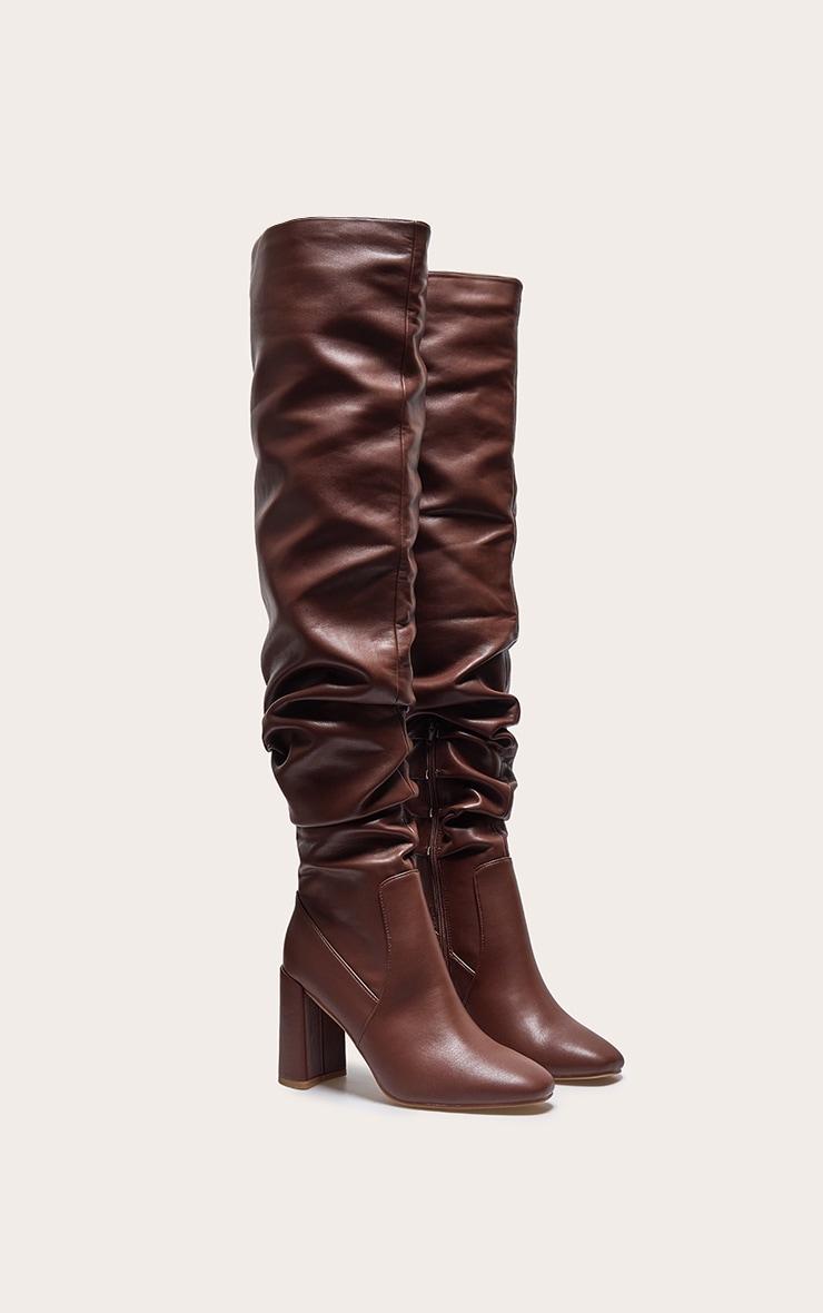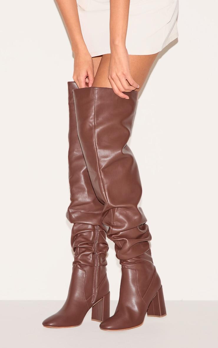 Add these brown PU round toe ruched over the knee block heeled boots to your seasonal collection for a look you'll be reaching for again and again. Brought to you in a luxe brown shade with a chic round toe design, over the knee length and ruched design, how can you say no? Style with your fave weekend look for a fool proof finish. PU Zip fastening 4inch Heel p]:!mb-0inch>Category: FootwearProduct type: Heeled Over The Knee BootsColor: BrownOccasion: Day