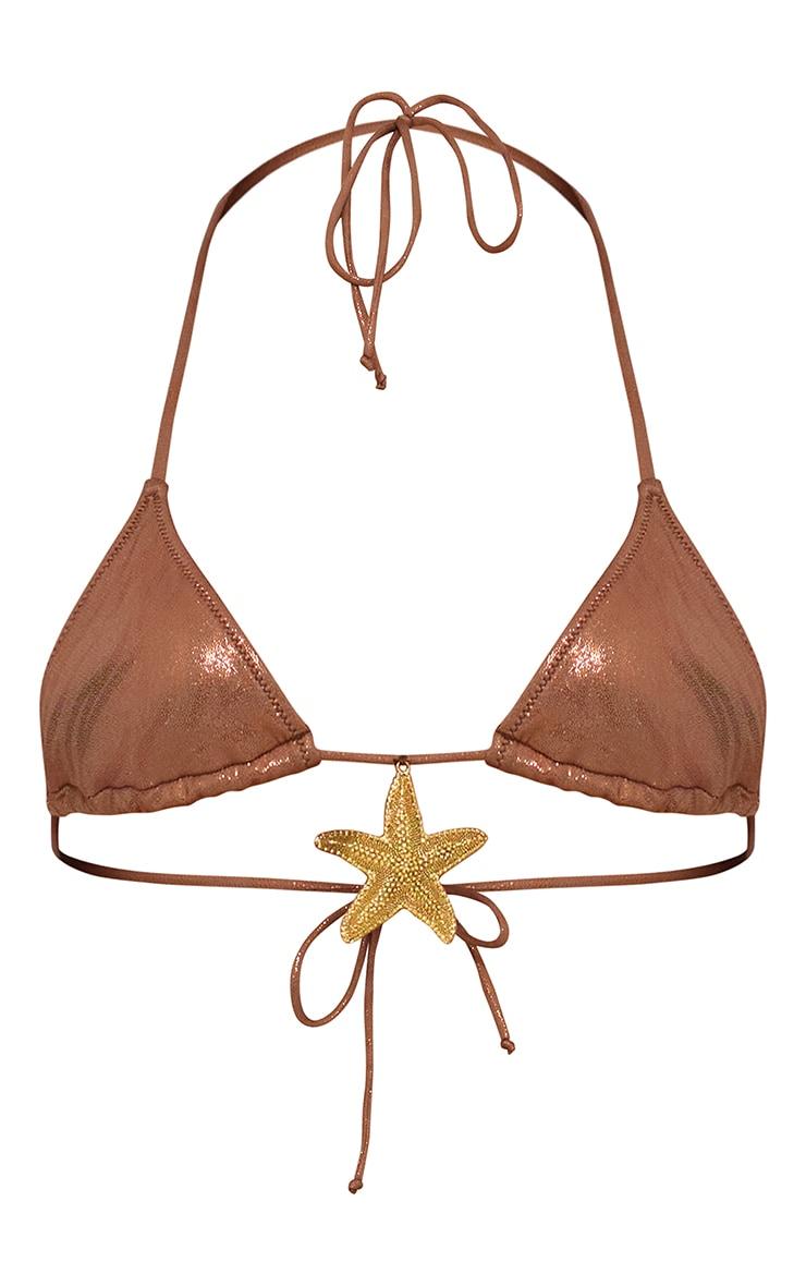 Have all eyes on you with this brown shimmer starfish trim micro bikini top. This bikini top is brought to you in a brown shimmer material with a starfish trim and a micro style, what's not to love? This bikini top is everything and more we're loving paired with the matching bikini bottoms, sandals and accessories for a combo like no other. Length approx 16.5cm/6.5inch (Based on a sample size UK 8) Model wears size UK 8/ EU 36/ AUS 8/ US 4Model Height - 5ft 6inchp]:!mb-0inch>Category: SwimwearProduct type: Triangle Bikini TopColor: BrownMaterial: SwimDesign: PlainOccasion: Day