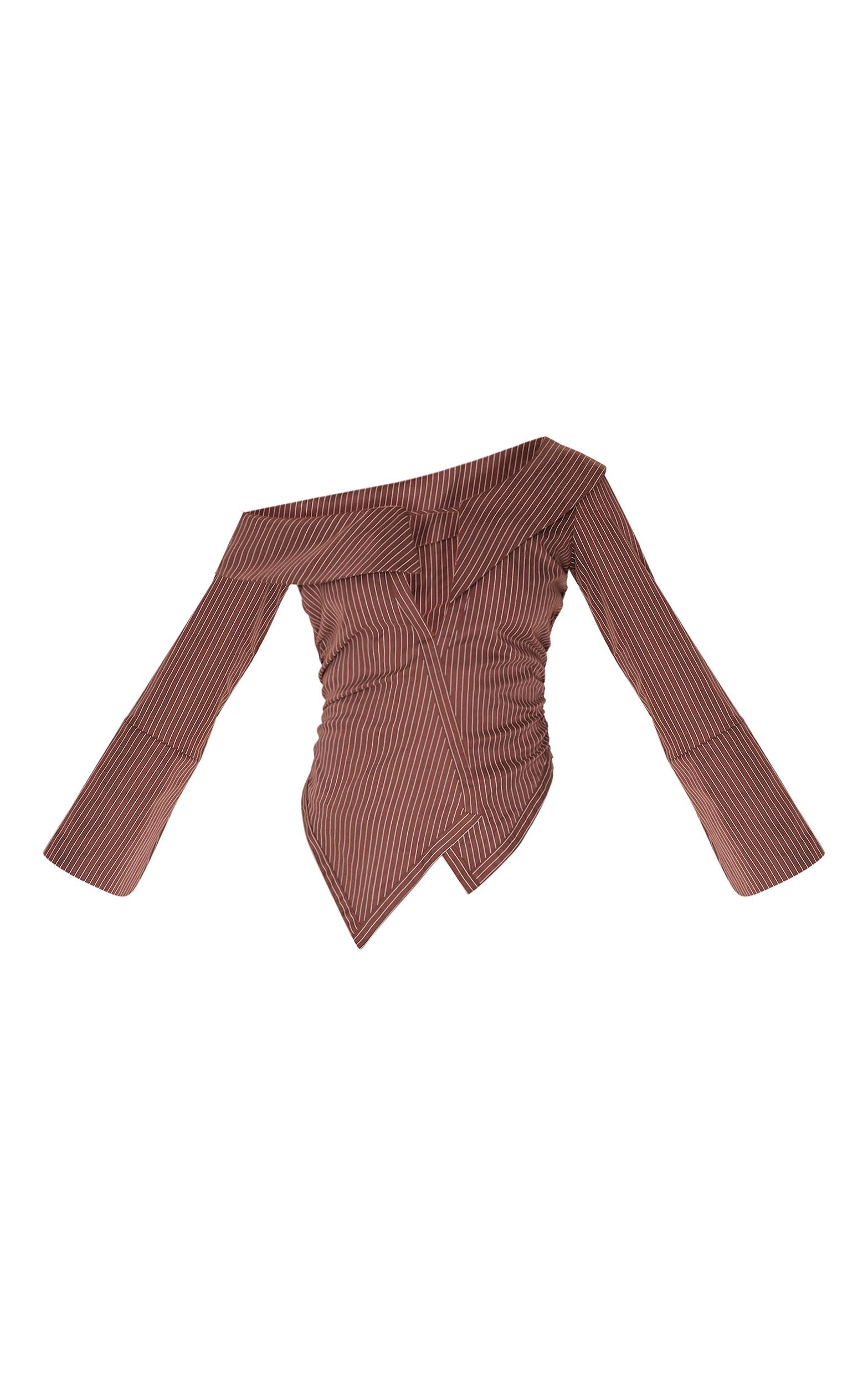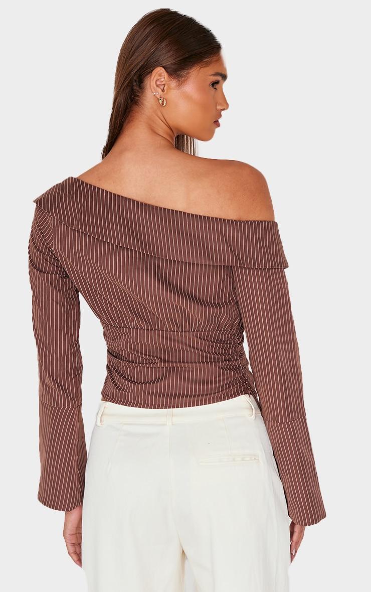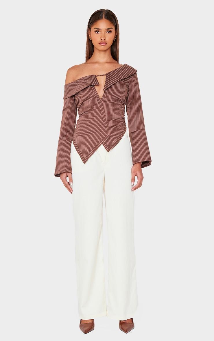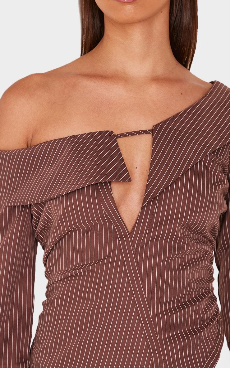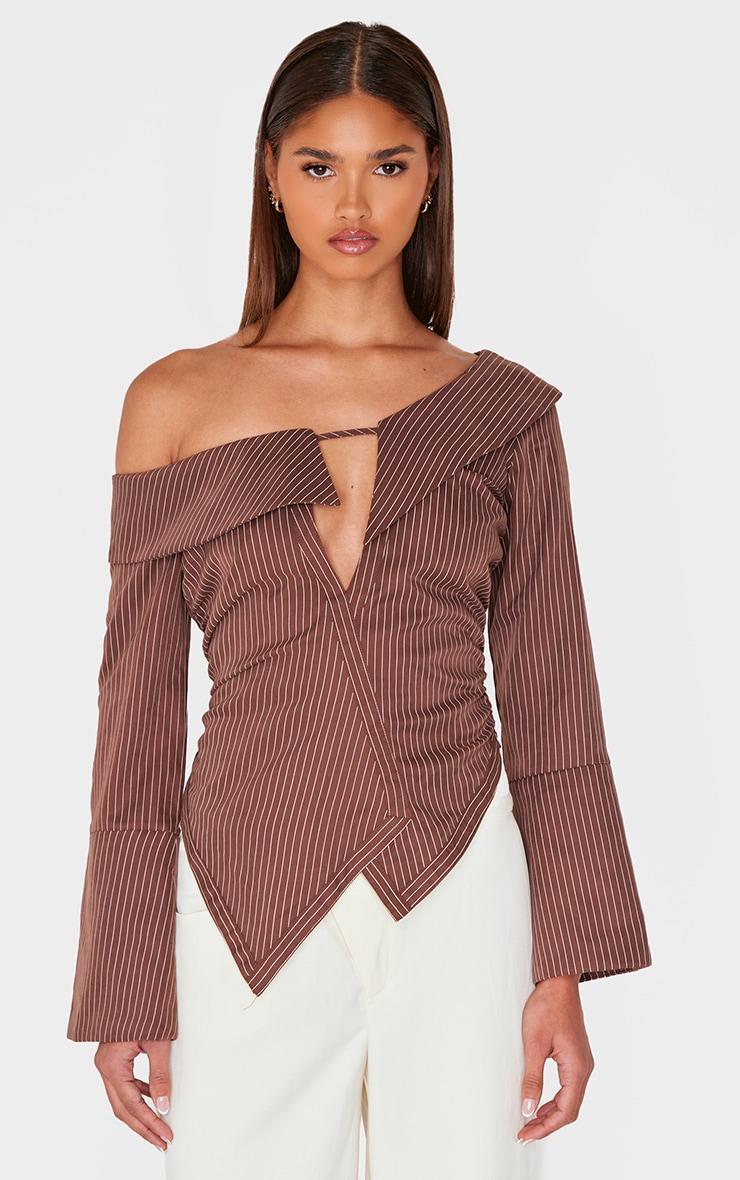 Turn heads for all the right reasons with this brown soft touch striped plunge shirt. Brought to you in a brown soft touch material with a striped design and a plunge detail, you are sure to stand out from the rest. Team with a pair of wide leg pants and your fave court heels to finish off the look we are loving right now. Length approx 48cm/19inch (Based on a sample size UK 8) Model wears size UK 8/ EU 36/ AUS 8/ US 4Model Height - 5ft 9inchp]:!mb-0inch>Category: TopsProduct type: ShirtColor: BrownMaterial: Cotton PoplinDesign: PrintNeckline: AsymmetricSleeves: LongOccasion: Evening