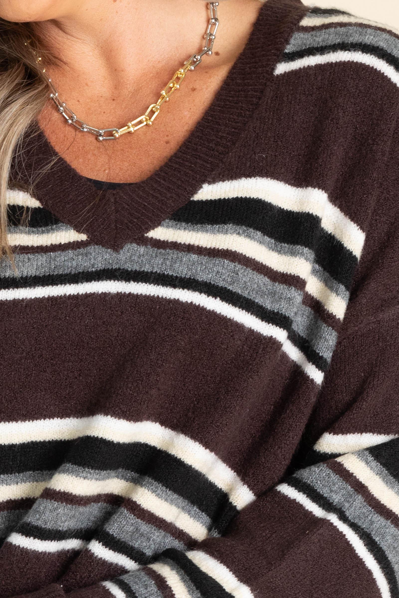 Product Details Colors: Brown Black, Cream, Grey, White Print: Stripes Neckline: V-Neck Sleeve: Long Sleeve Hemline: Straight Brand: The Workshop Material and Care 77% Acrylic 20% Nylon 3% Spandex Hand Wash Cold Hang/ Line Dry Size and Fit Small: Bust 48" Waist 46" Length 24" Medium: Bust 50" Waist 48" Length 24.5" Large: Bust 52" Waist 50" Length 25" Erica is 5’7” and wearing her true size small