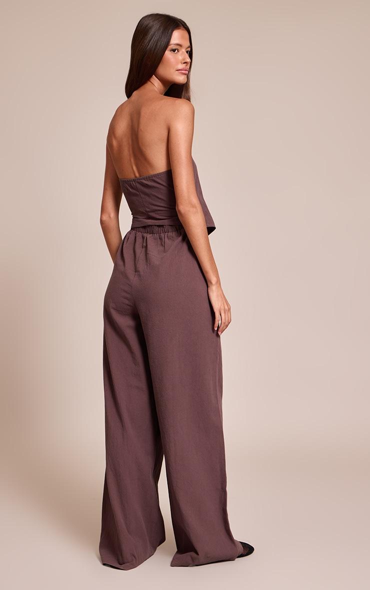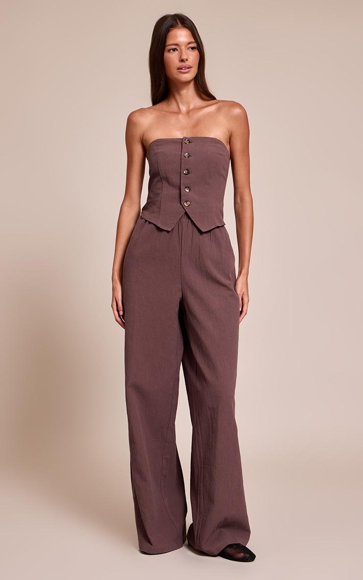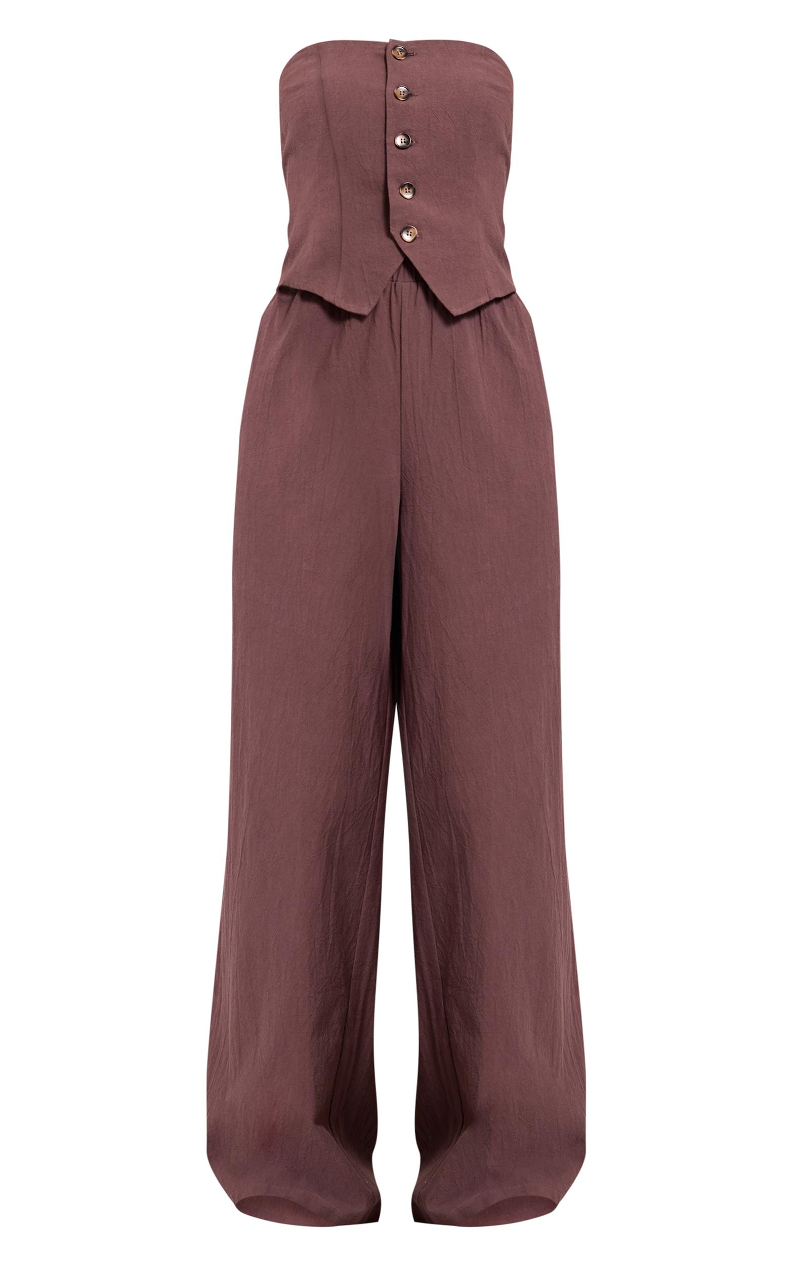 Own your day in a piece that understands unforced confidence. The brown textured bandeau button jumpsuit reimagines contemporary style with its sleek bandeau neckline and distinctive button detailing on the bodice. This effortlessly chic design extends into sweeping wide-leg pants, creating a refined, elongated line, while the subtle texture adds an artful dimension to its streamlined form. Anchor this versatile jumpsuit with crisp sneakers for a relaxed day look, or elevate your ensemble with a sharp oversized blazer and minimalist heeled sandals for an assured, knowing presence. It’s the quintessential choice for a self-aware, polished aesthetic.Length approx 145cm/57inch (Based on sample size US 4)Model wears size UK 8/ EU 36/ AUS 8/ US 4Model Height - 5ft 7inchp]:!mb-4inch>Category: DressesProduct type: Wide Leg JumpsuitColor: BrownMaterial: Textured JerseyOccasion: Day