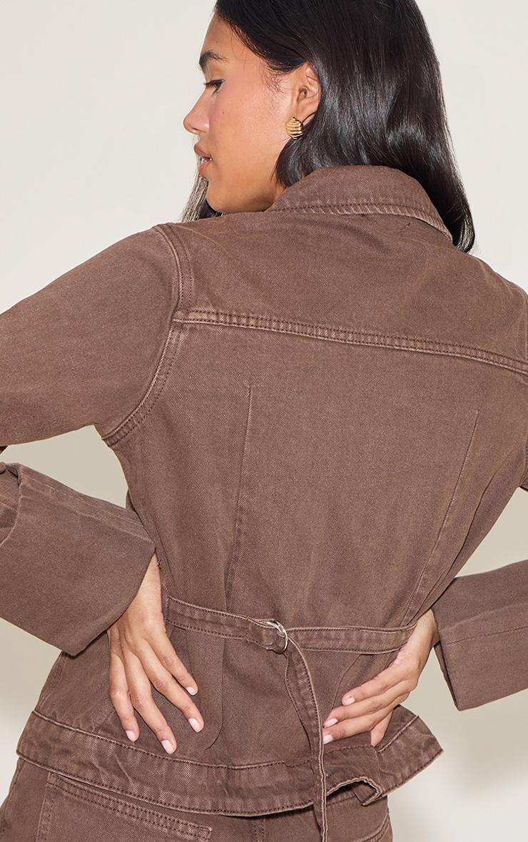 Complete your casual wardrobe with this brown turn up cuff cinched back denim jacket. Featuring a brown denim material with turn up cuffs and a cinched back detail for added shape. Team this denim jacket with the matching jeans and a basic tank top for a look like no other.Length approx 48.5cm/19inch (Based on sample size US 4)Model wears size UK 8/ EU 36/ AUS 8/ US 4Model Height - 5ft 7inchp]:!mb-4inch>Brand: PrettyLittleThingCategory: DenimProduct type: Denim JacketColor: BrownMaterial: Rigid DenimOccasion: Day