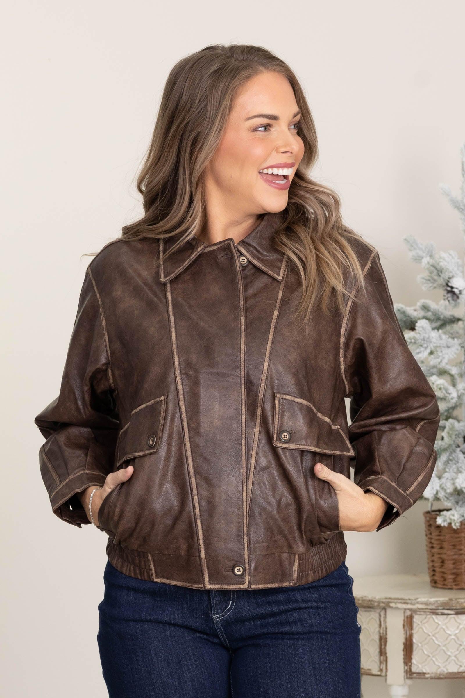 Details: Style: Jacket Neckline: Zip Up Sleeve: Long Sleeve Hemline: Straight Pockets: 2 Functional Side Pockets Zipper: Full Zip (Neckline to Hemline) Colors: Brown Print: Solid Brand: J.O.A. Garment Measurements: Small: Bust: 42" Waist: 40" Length: 24" Medium: Bust: 44" Waist: 42" Length: 24.5" Large: Bust: 46" Waist: 44" Length: 25" **Erica is 5'7 + 34C Bust Wearing Size Small** Our Team Size Recommendation: We recommend true to size. This jacket is designed to be spacious and slightly oversized. A non-busty XL can fit comfortably in the size large w/ zip, and a full-busted XL can fit comfortably without the zip. Small: 2-4 Medium: 6-8 Large: 10-12 Fabric: Shell: 100% Rayon Coating: 100% Polyurethane Lining: 100% Polyester Care: Machine Wash Cold + Hang/Line Dry