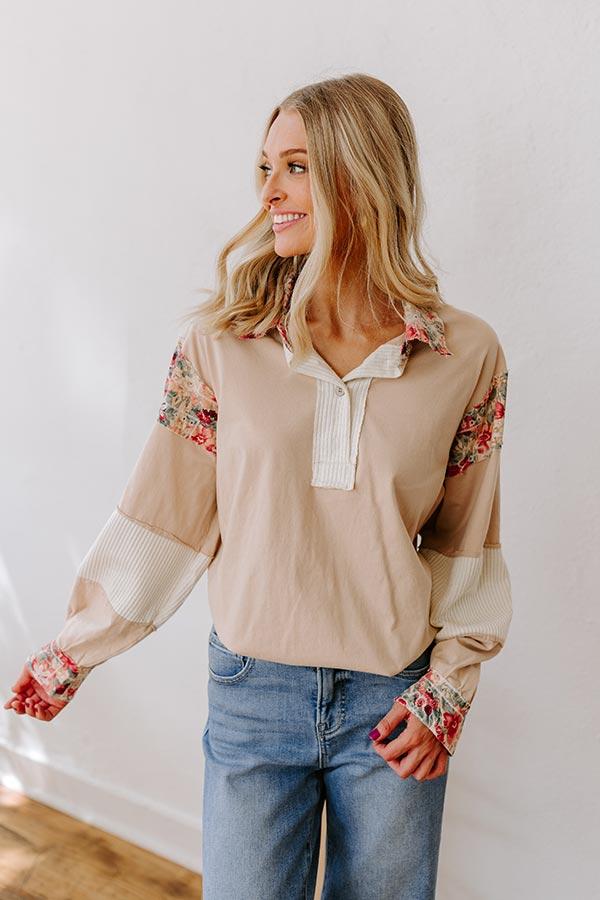- Add a pop of petals to your everyday wardrobe with this charming top! Perfect for strolls through the park and casual get-togethers, this piece is sure to give any outfit sweet energy. - Unlined material with floral embroidered corduroy accent material, as well as soft ribbed accent material - Unfinished seam accents - A collared v-cut neckline - A button down bodice - Long sleeves - A relaxed silhouette that ends in a straight hemline