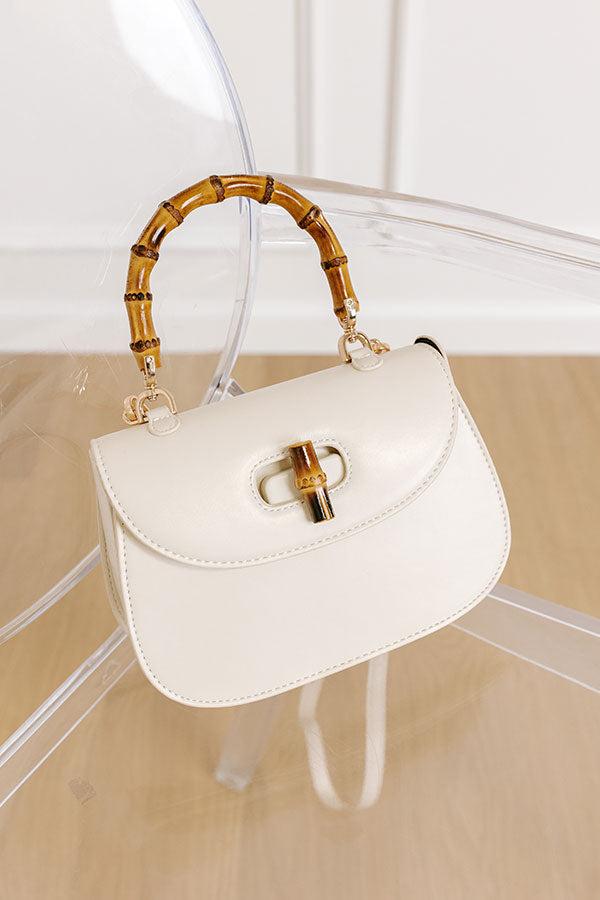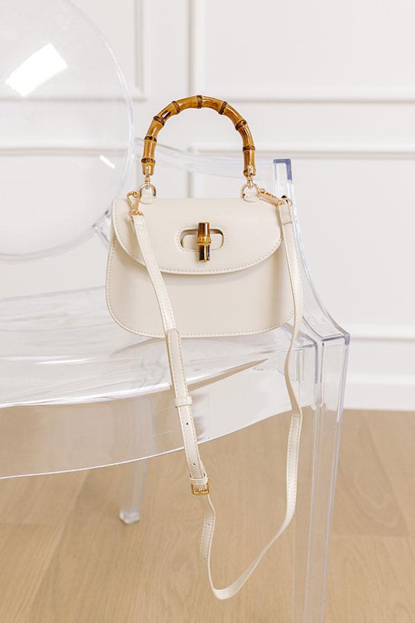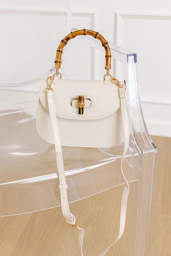 - Accessorize with this adorable purse for a uniquely trendy look! - Faux leather material - Gold hardware - A bamboo-like handle as well as a detachable faux leather adjustable length shoulder strap - Flap and twist closure - A fully lined interior featuring two additional pockets