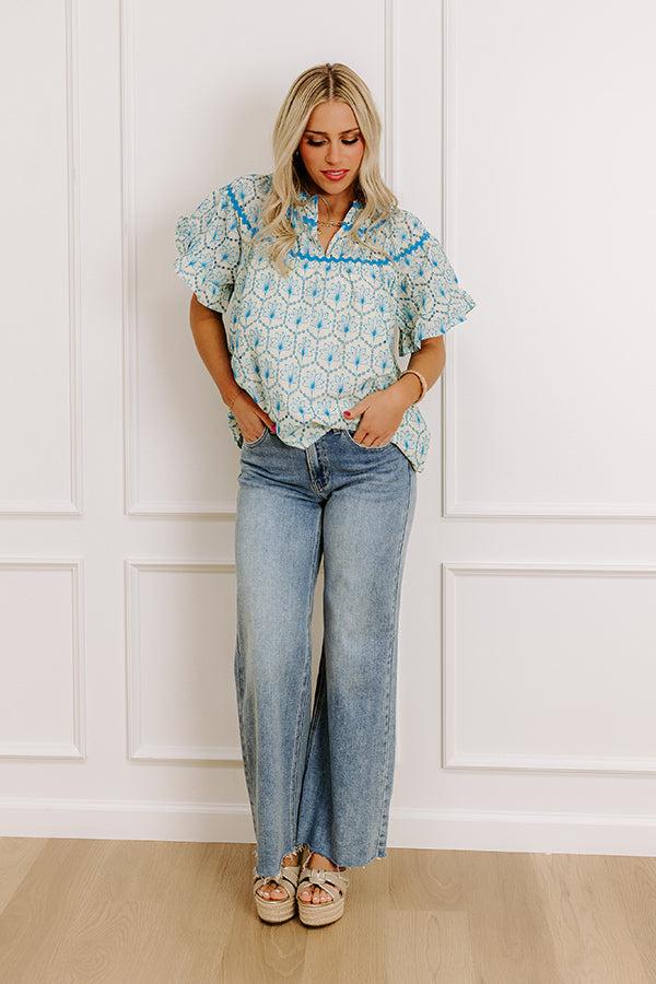 - This adorable top brings out your inner charm! Featuring trendy ricrac accents and a sweet embroidered design, it's perfect for keeping you cute and stylish all day long. - Lightweight eyelet material featuring ocean blue colored embroidery - A v-cut neckline - Blue hued ricrac accents on the yoke - A built-in lining beginning below the yoke - Short sleeves with subtly ruffled cuffs - A flowy silhouette that ends in a straight hemline