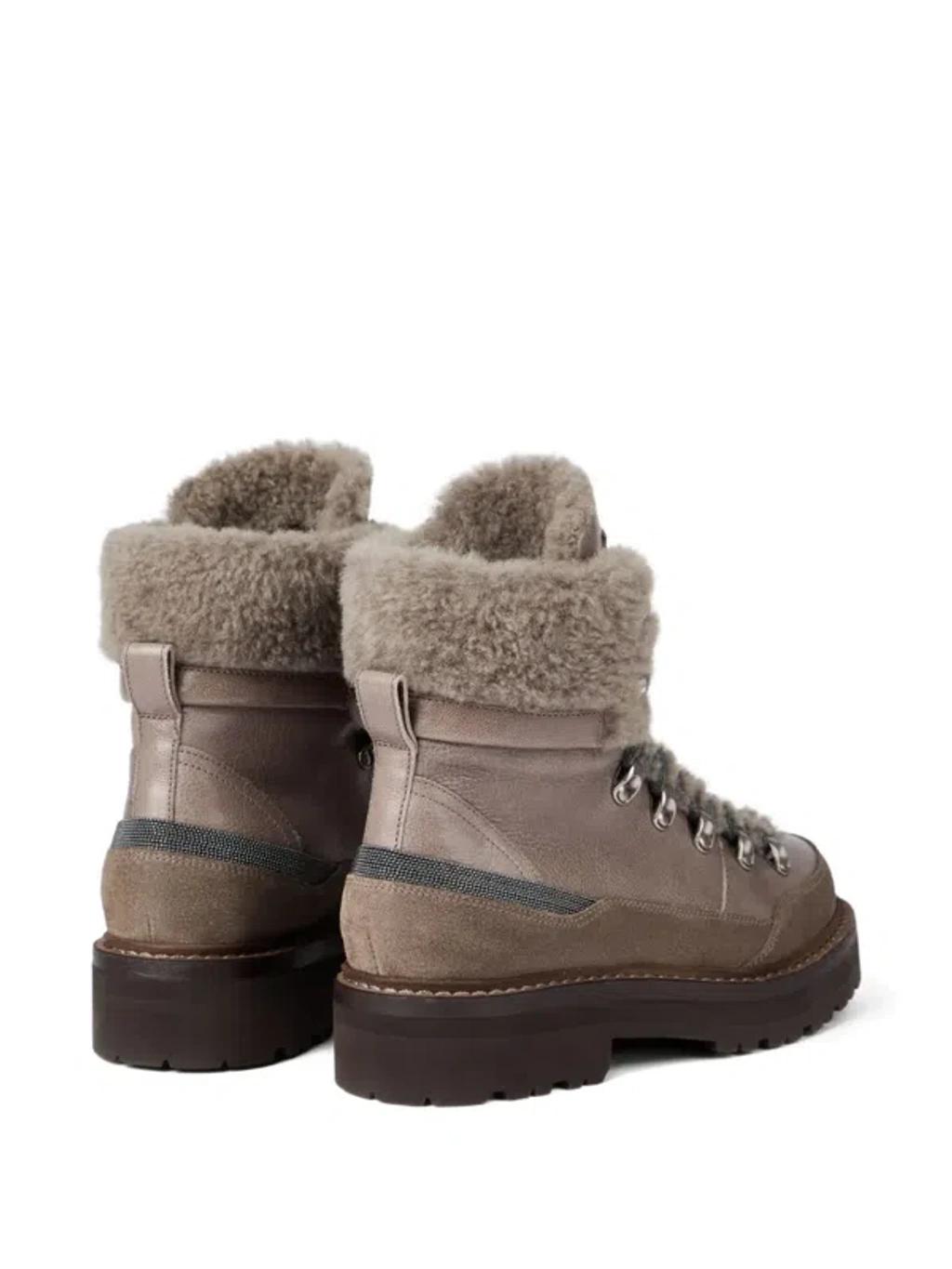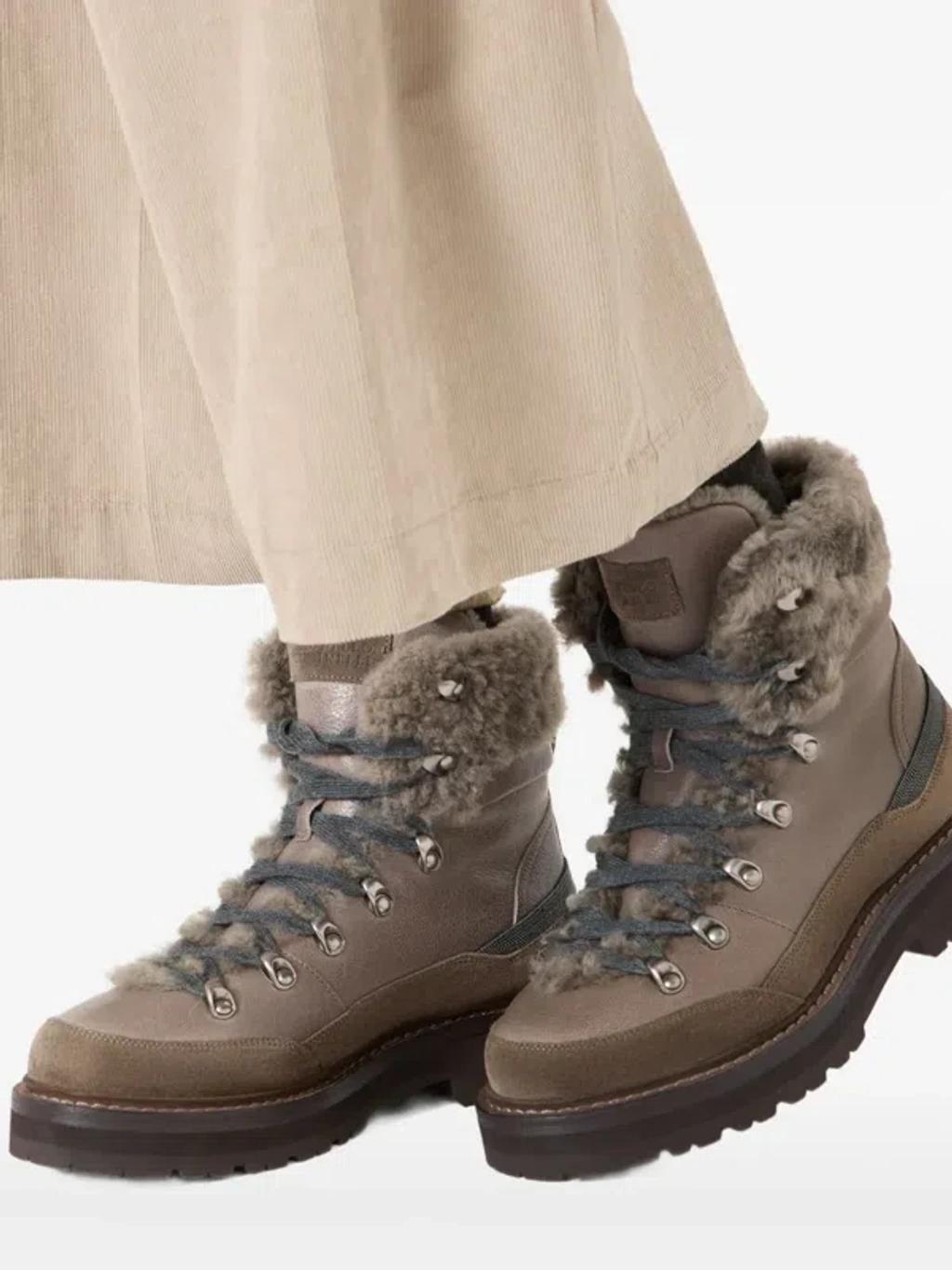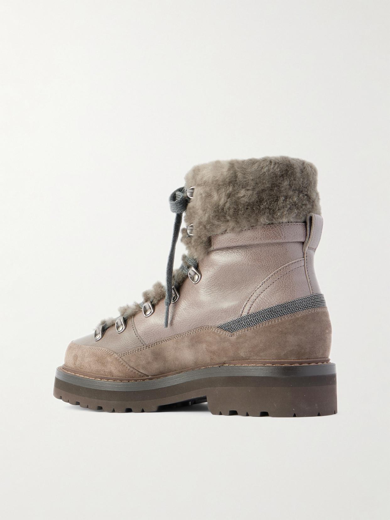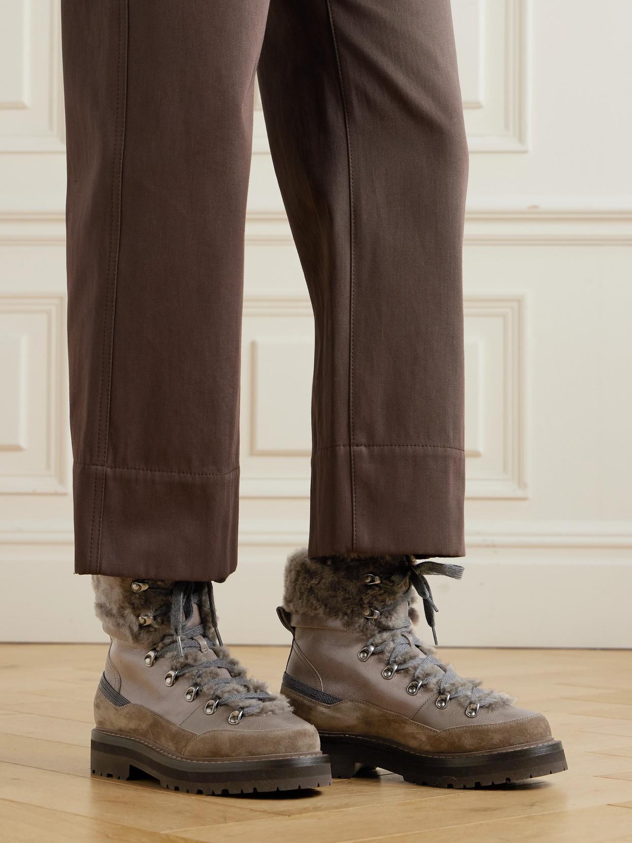 Shop Brunello Cucinelli Bead-embellished Shearling-trimmed Leather Ankle Boots In Multi from 800+ stores, starting at $2950. These Mountain boots might look like they're ready to take on rocky climes, but thanks to Brunello Cucinelli's exquisite craftsmanship, they're perfect for refined winter dressing. The grained texture of the leather contrasts with the shearling lining, creating cosy textural interest that's fitting for cold-weather outings.